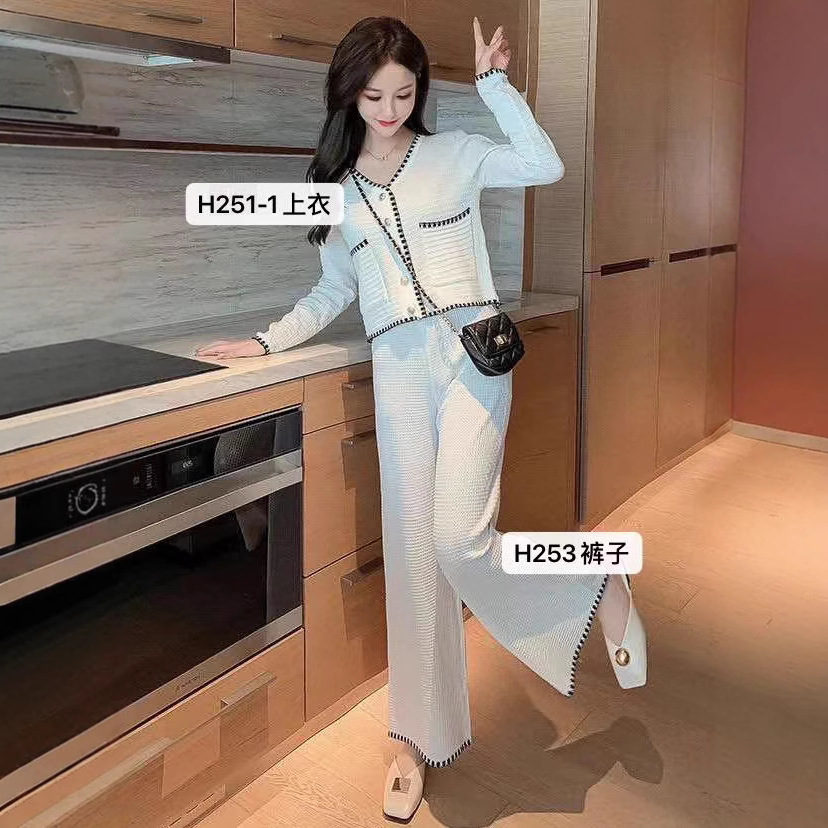 Setelan pakaian wanita rajut, setelan dua potong, celana panjang kaki lebar, elastis, pinggang tinggi, mantel rajut lengan panjang, Seleb online, gaya baru, musim gugur