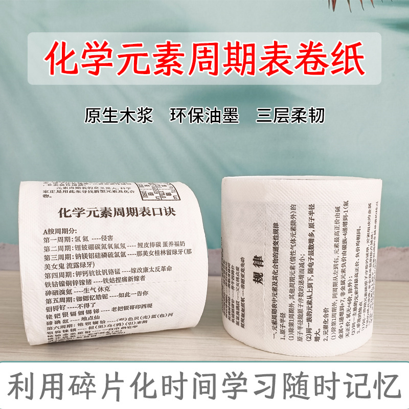 Tabel periodik unsur kimia, gulungan kertas dengan frasa-frase menarik, versi lengkap petunjuk memori, kertas toilet cetak kreatif untuk siswa terbaik.