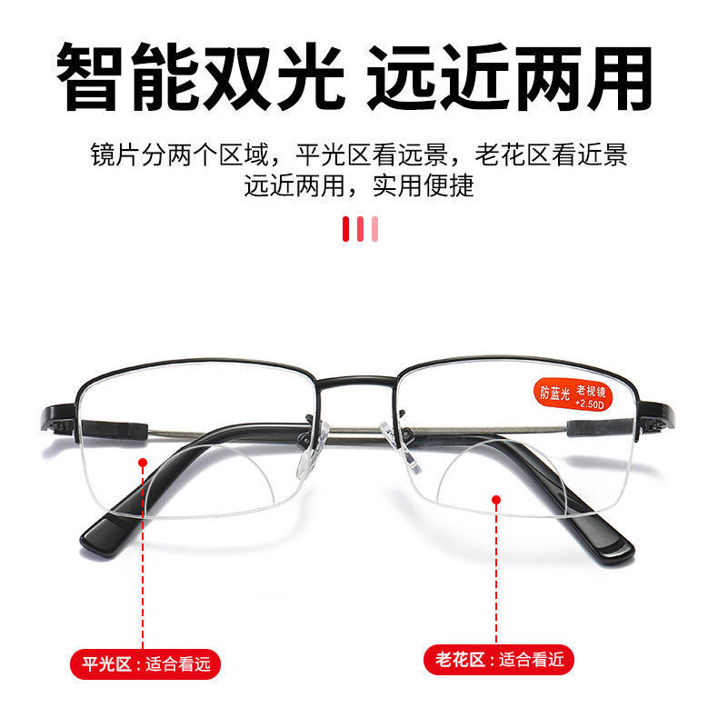 Melihat jauh dan dekat kacamata dua cahaya logam semi-frame wajah besar kacamata memori kaki anti-cahaya biru pria kacamata presbiopi portabel
