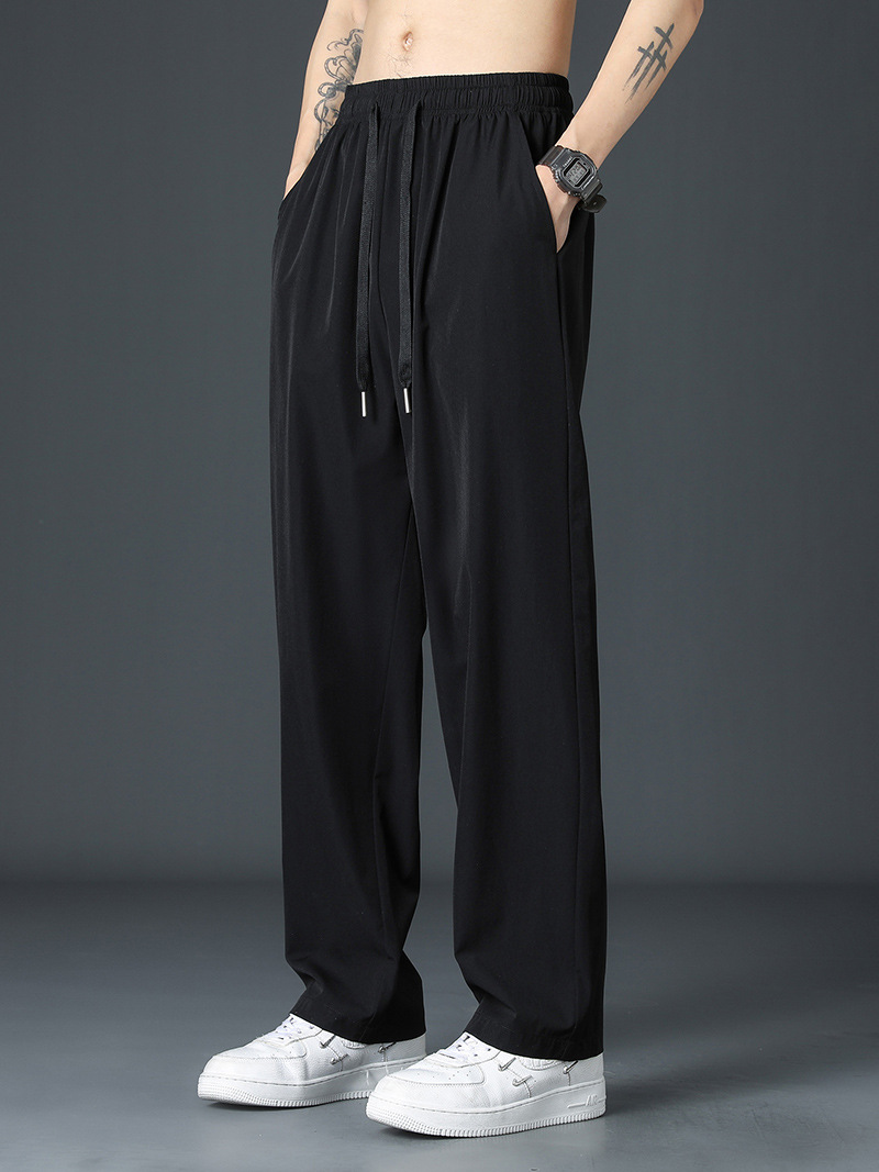 Celana panjang kasual untuk pria, celana panjang sutra es trendi gaya Hong Kong cocok untuk pria, celana lurus longgar longgar kaki lebar, celana kasual musim panas dan musim semi