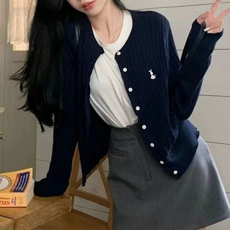 Mantel kardigan rajut bordir gaya Preppy untuk wanita, atasan lengan panjang longgar retro Amerika baru musim gugur 2023