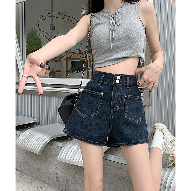 Celana pendek Denim kaki lebar pinggang tinggi untuk wanita 2024 pelangsing baru musim panas ukuran ekstra besar gesper ganda celana pendek longgar a-line modis