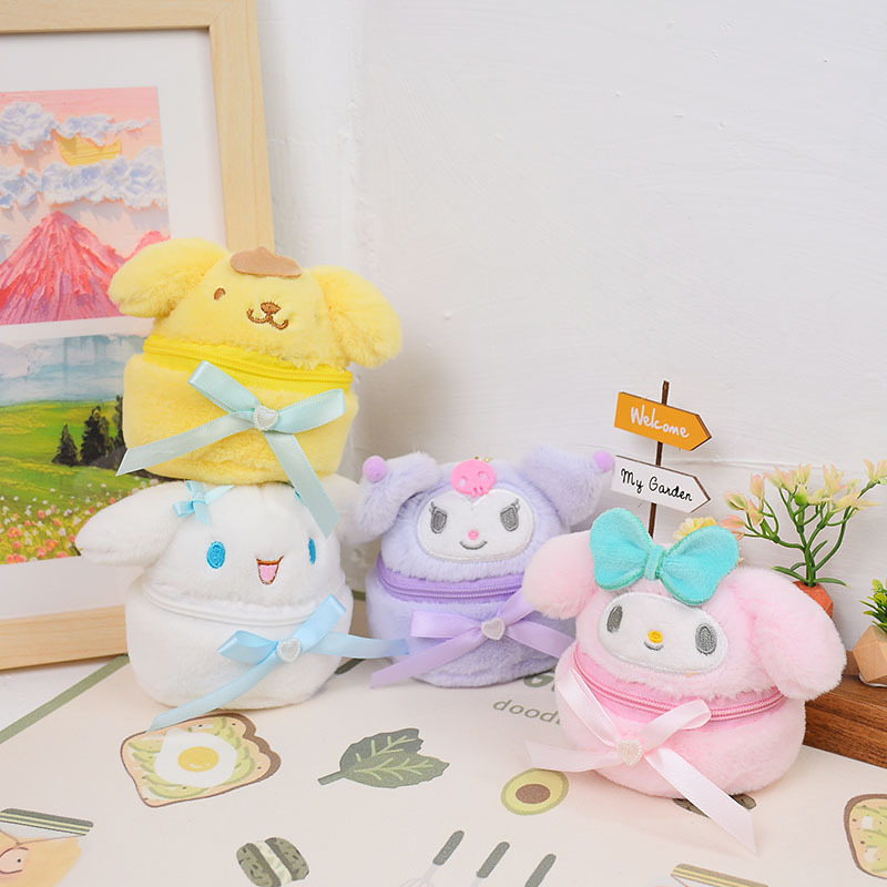 Sanrio tas ransel penyimpanan earphone wanita, tas punggung liontin dompet koin boneka mewah jaring merah kreatif untuk wanita