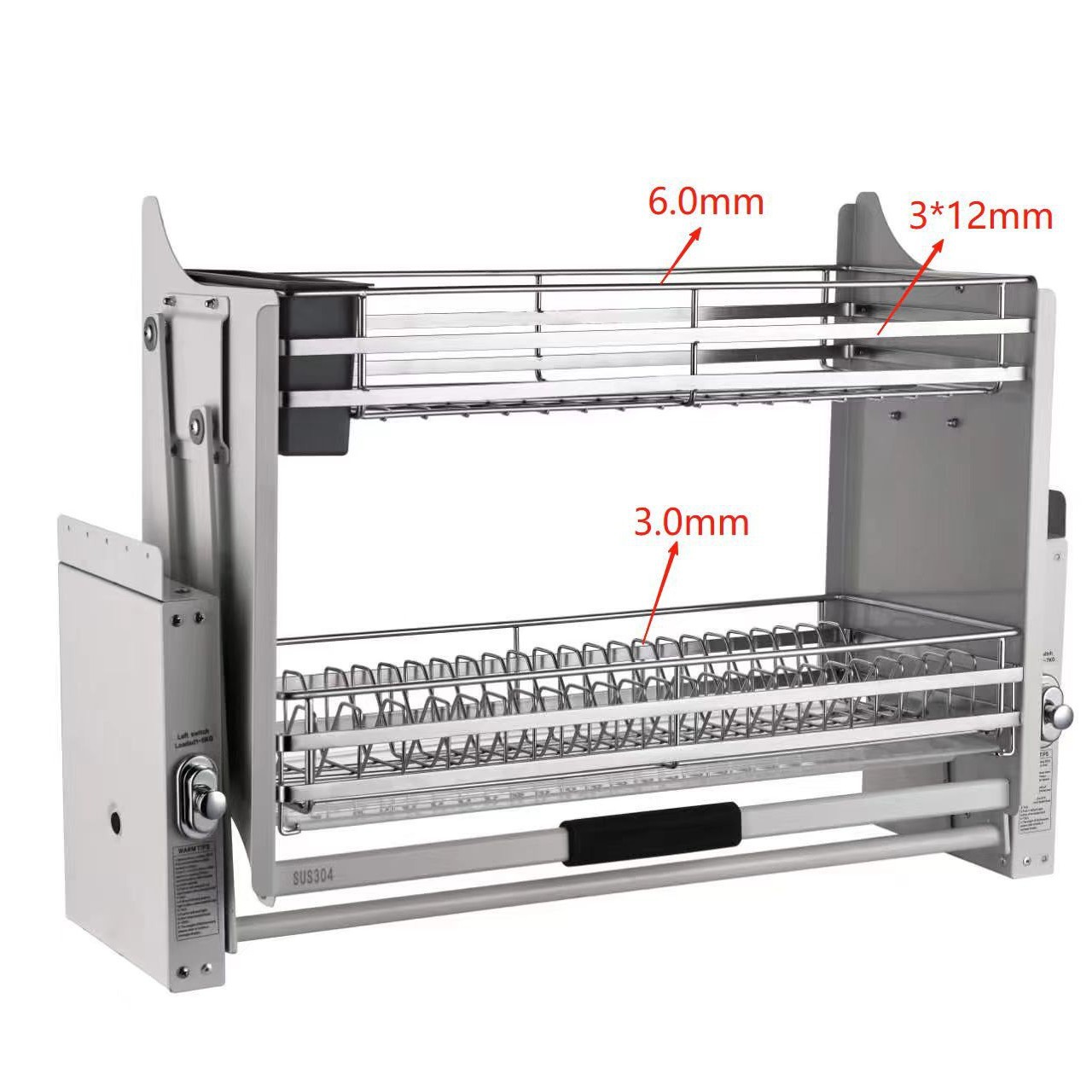 Keranjang tarik adjustable untuk kabinet dinding dapur baja tahan karat sus304, penyimpanan kabinet keranjang piring dua lapis dengan peredam kejut