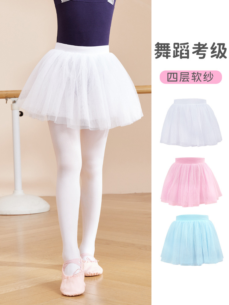 Rok dansa anak-anak, rok balet putri berbulu, ROK latihan jala lembut elastis untuk anak perempuan