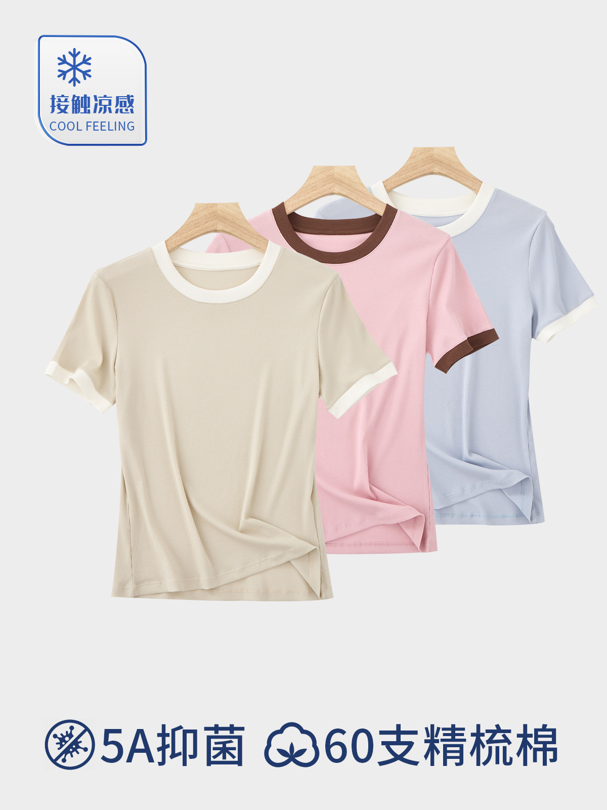 Kaus wanita katun sisir 60 musim semi dan musim panas baru keren Tencel slim fit wanita warna kontras lengan pendek