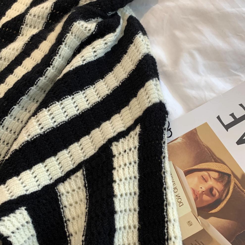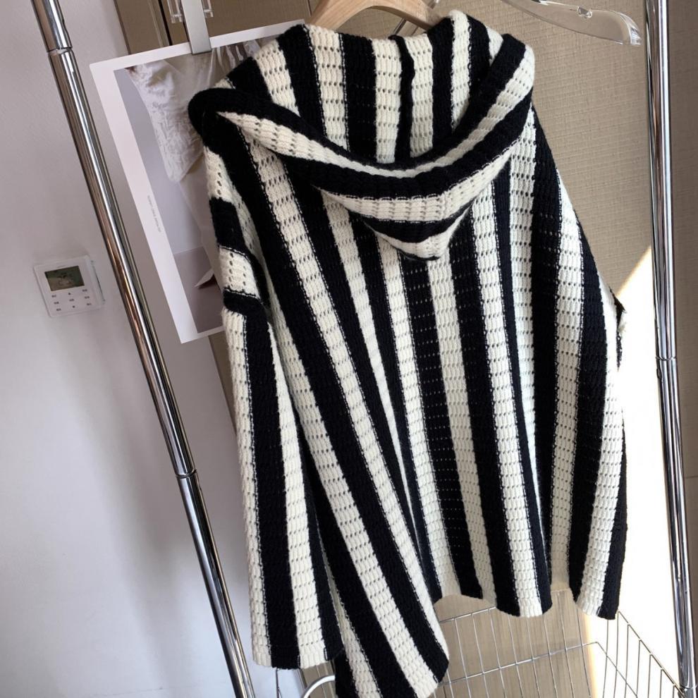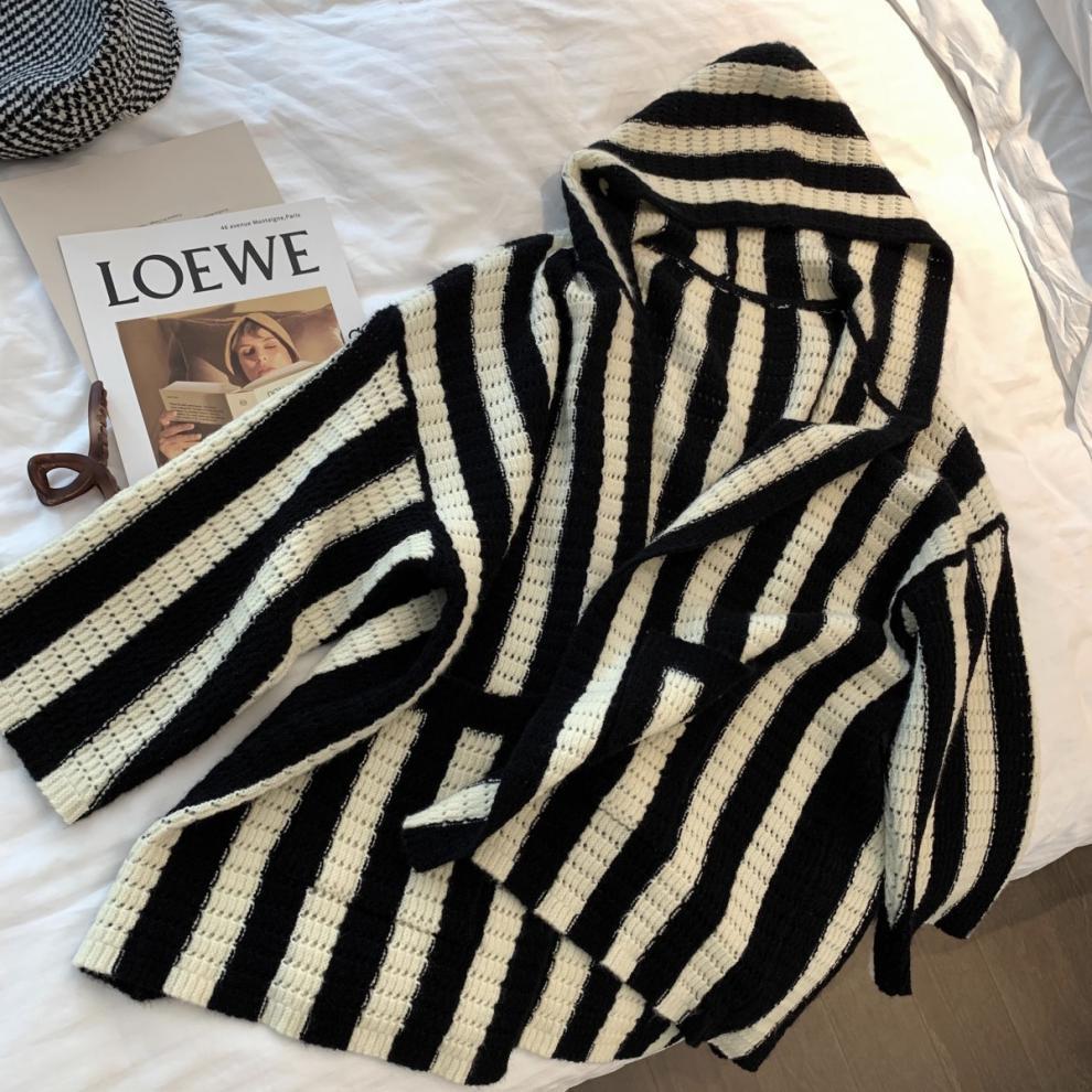 2024秋装黑白竖条纹连帽外套宽松慵懒中长款针织开衫女休闲大毛衣
