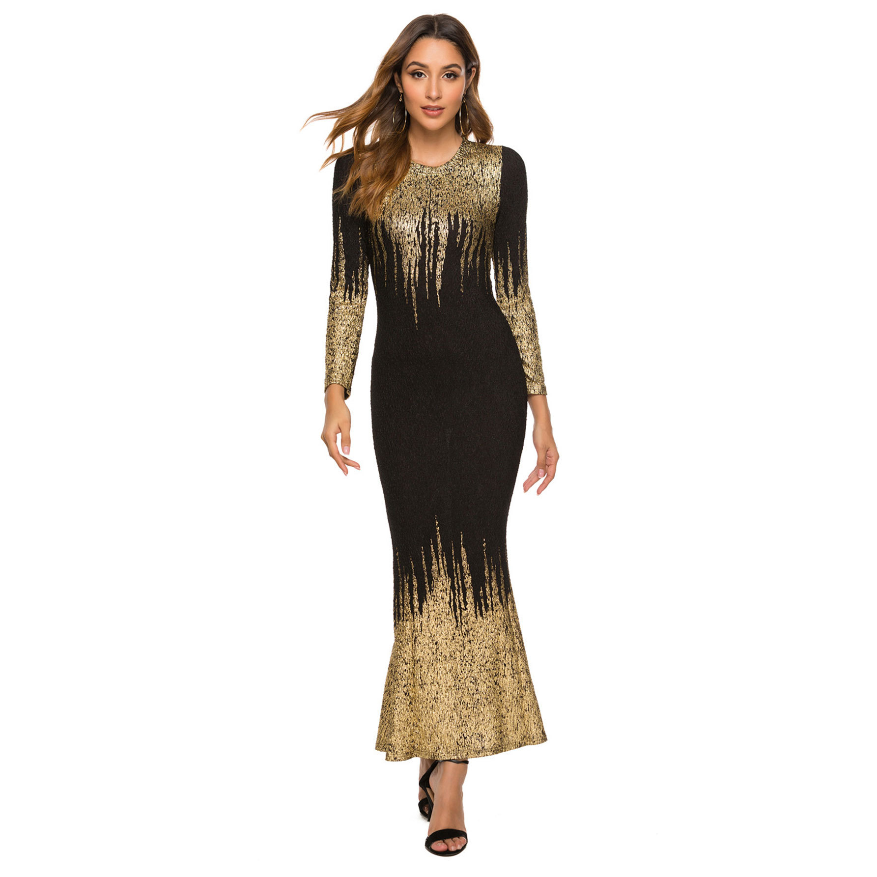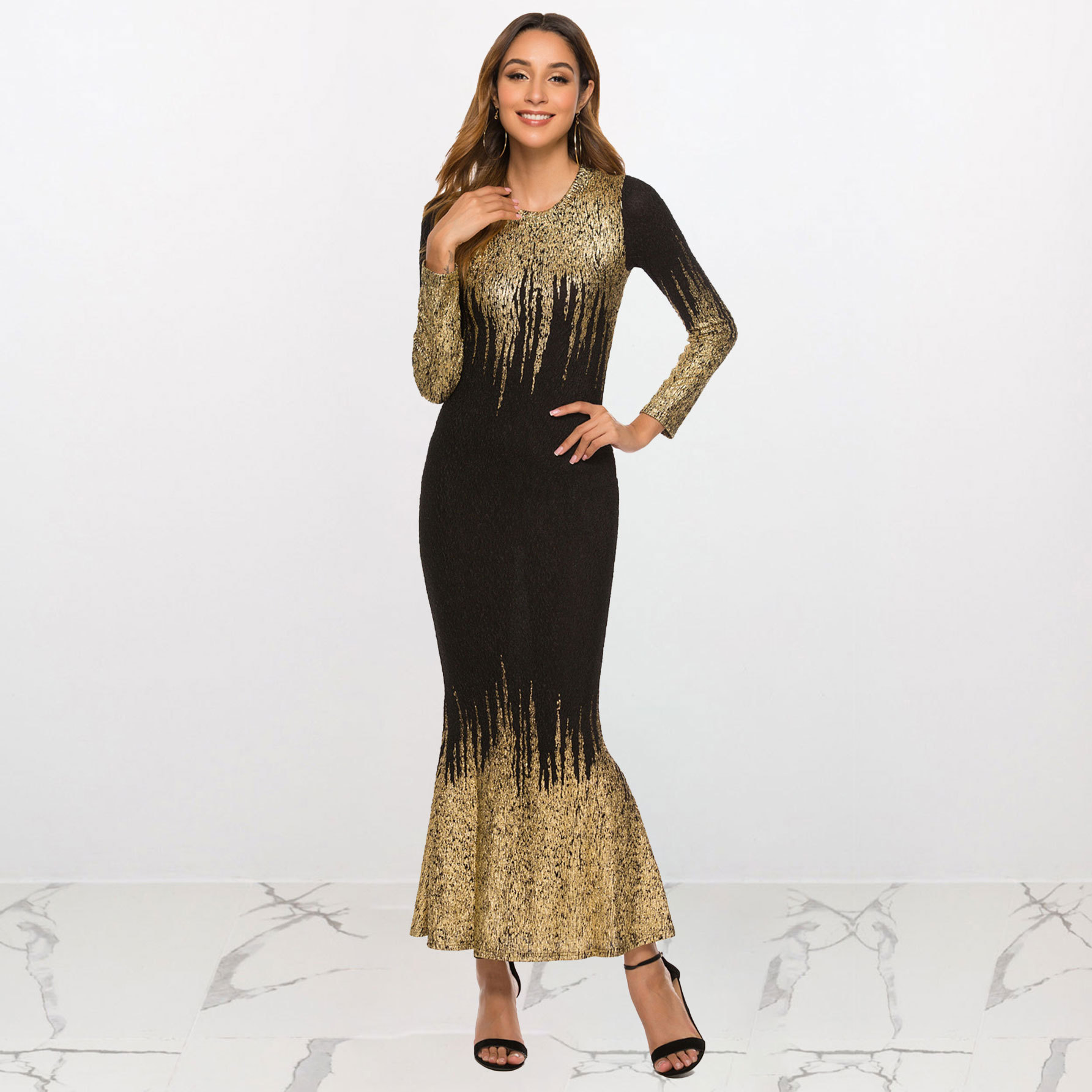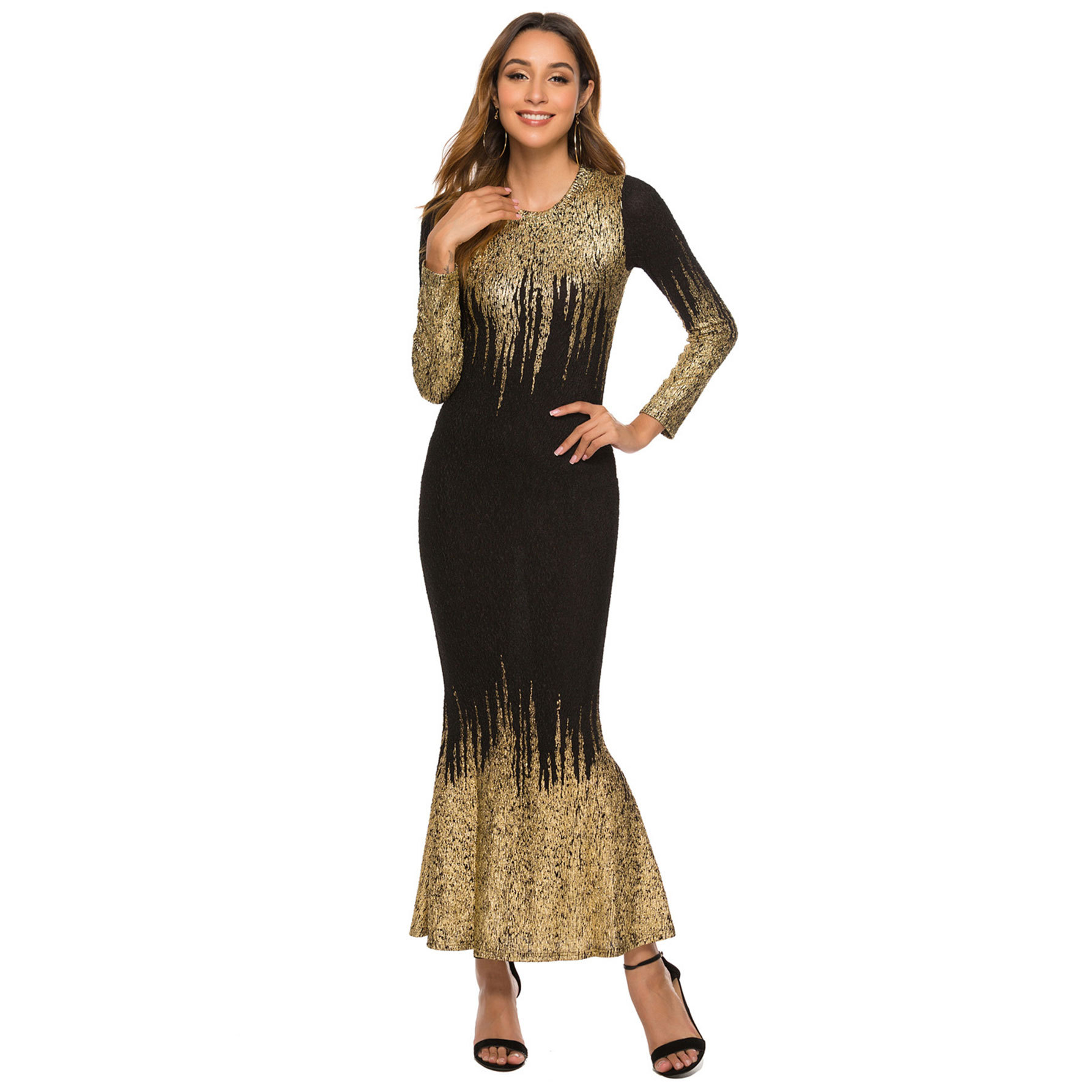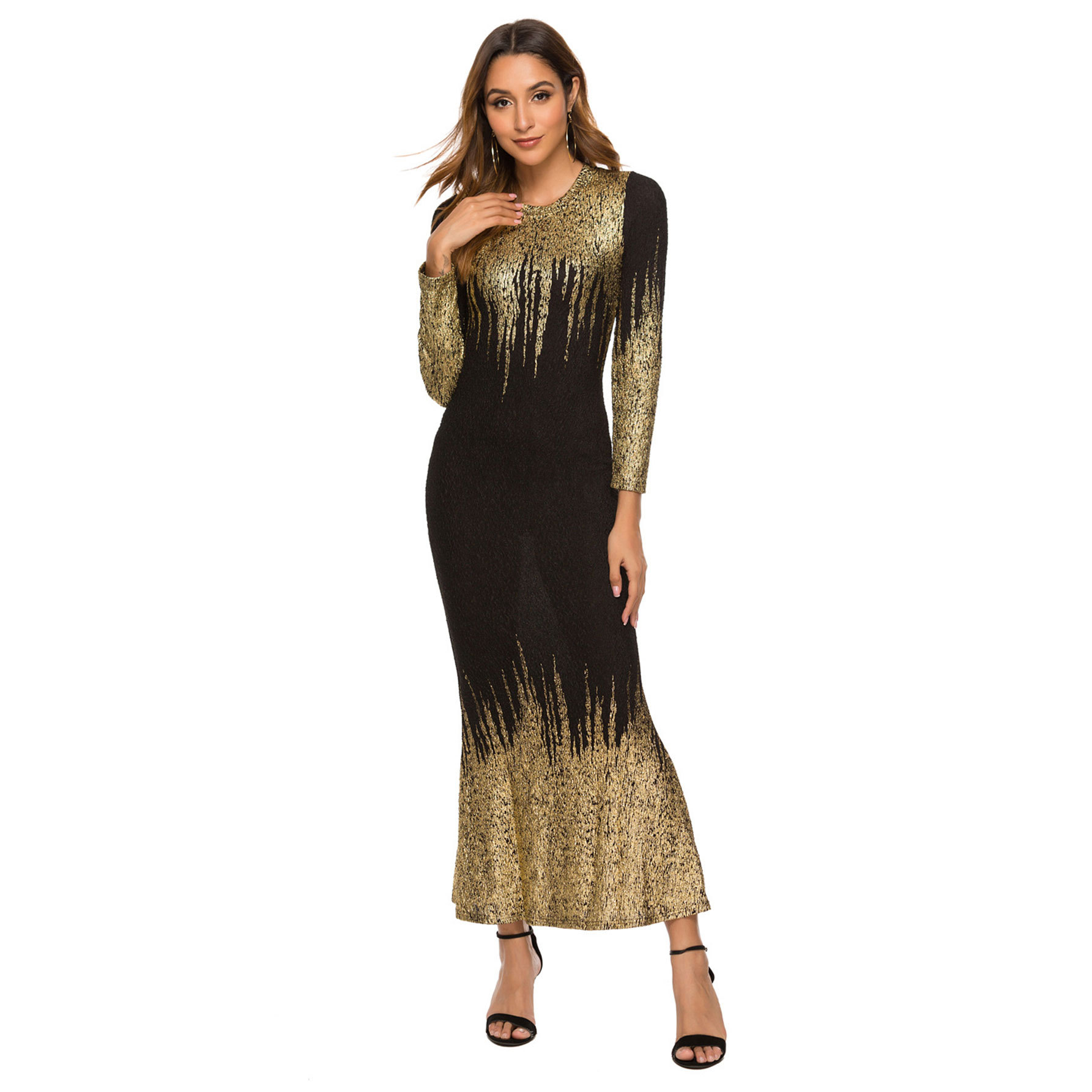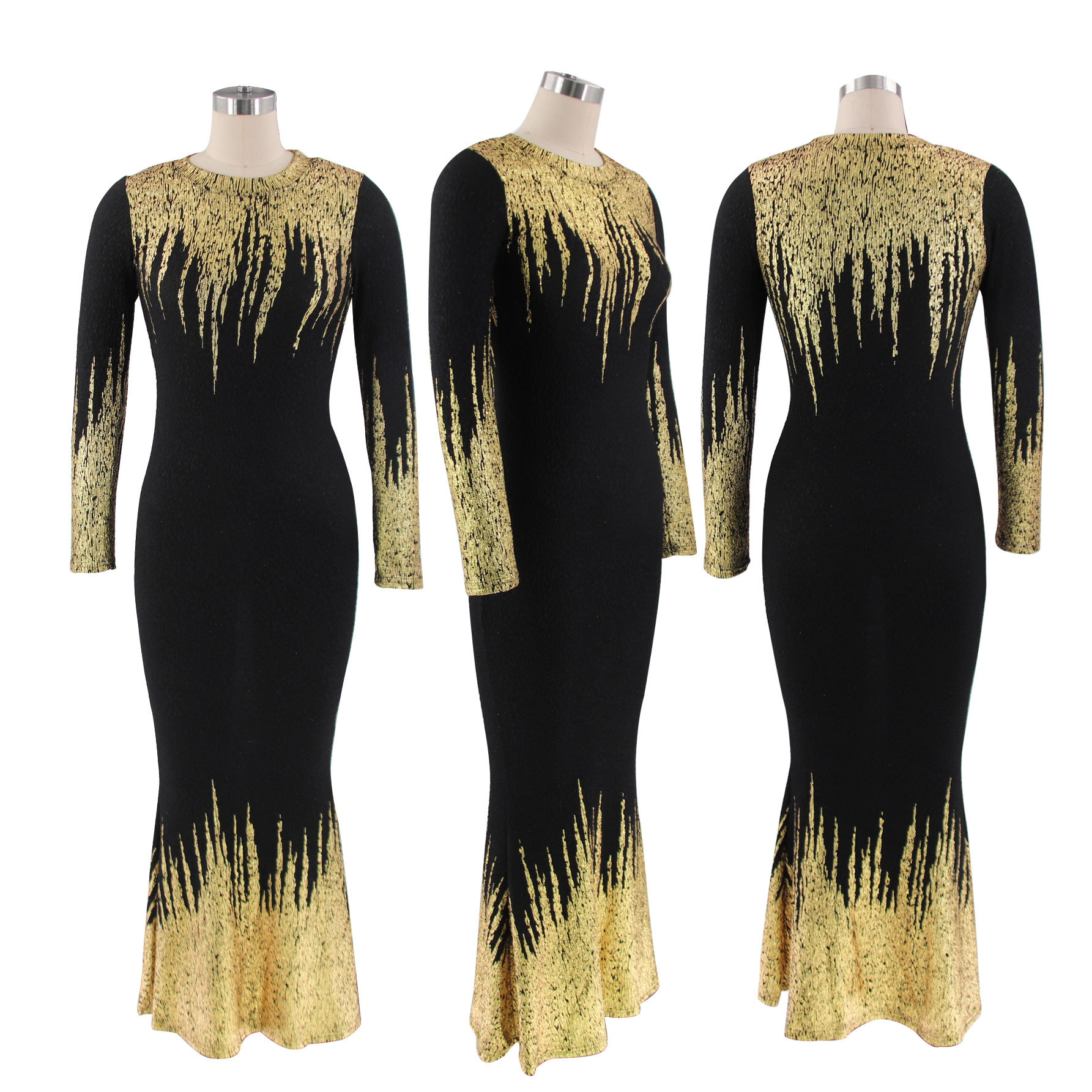 HN112 Eropa Amerika Amazon Model Baru Musim Gugur dan Musim Dingin Pakaian Wanita Gaun Lengan Panjang Ramping Bersablon Emas Gaun Terusan Wanita