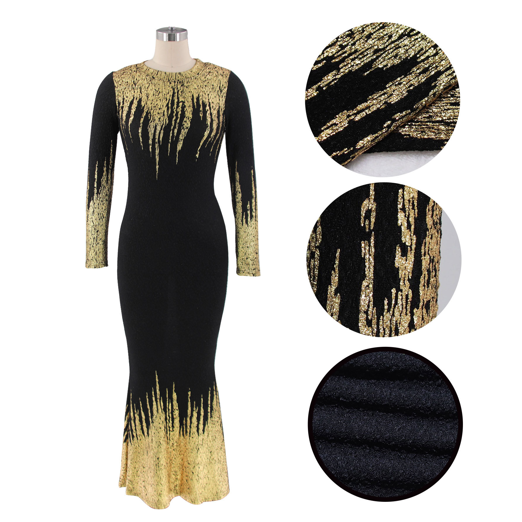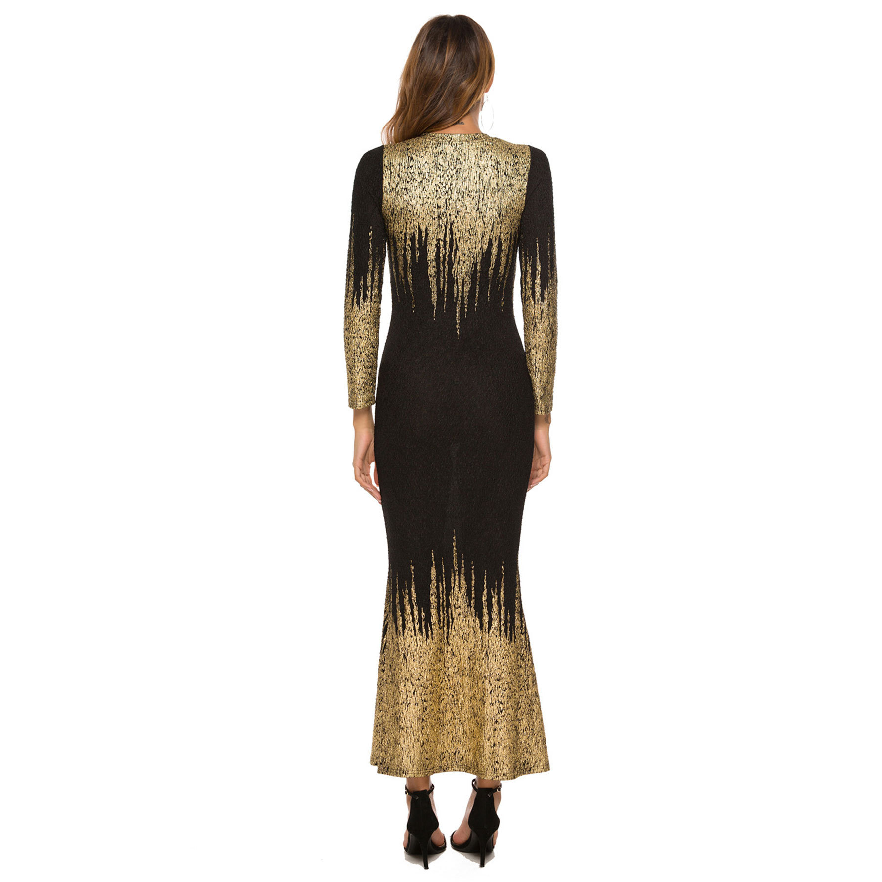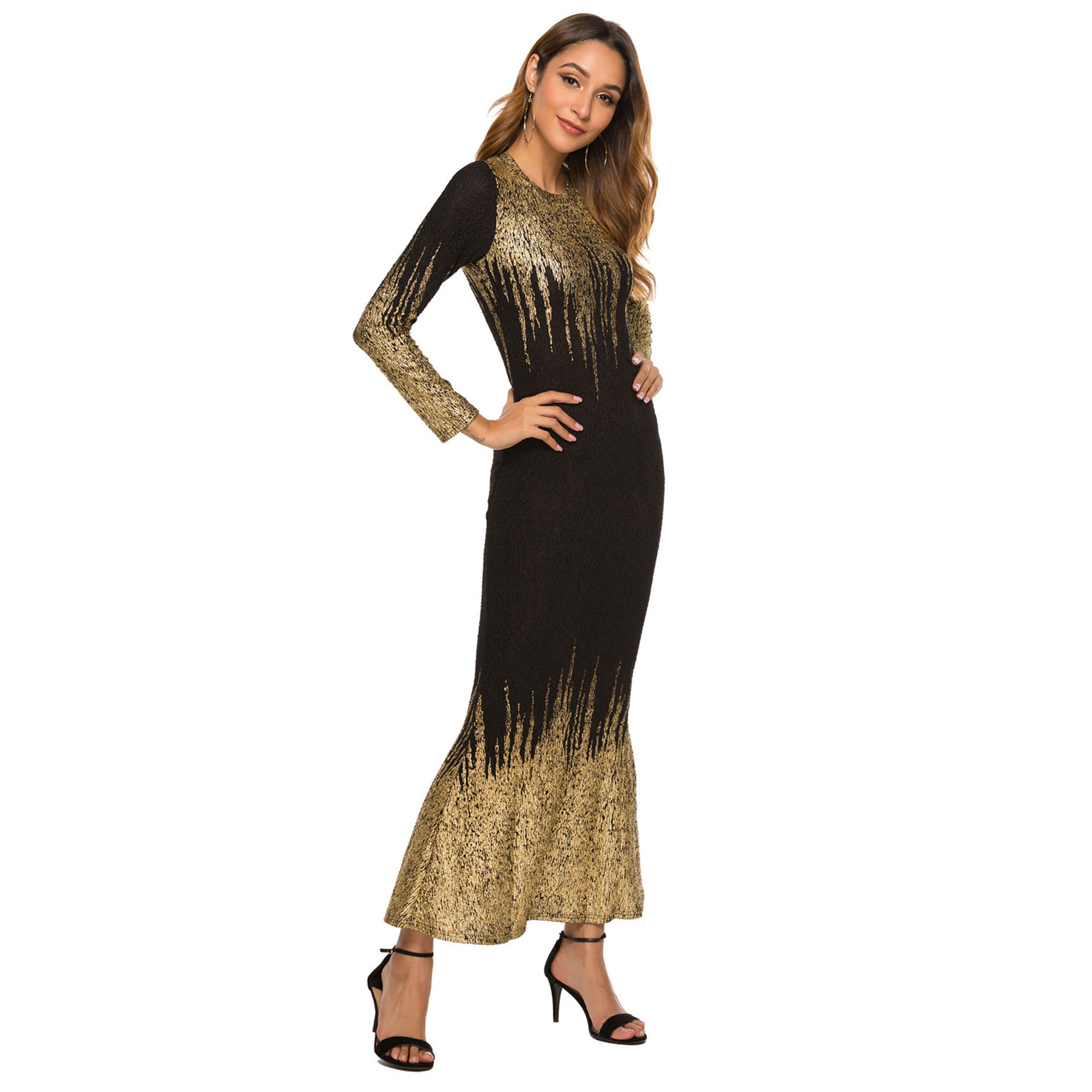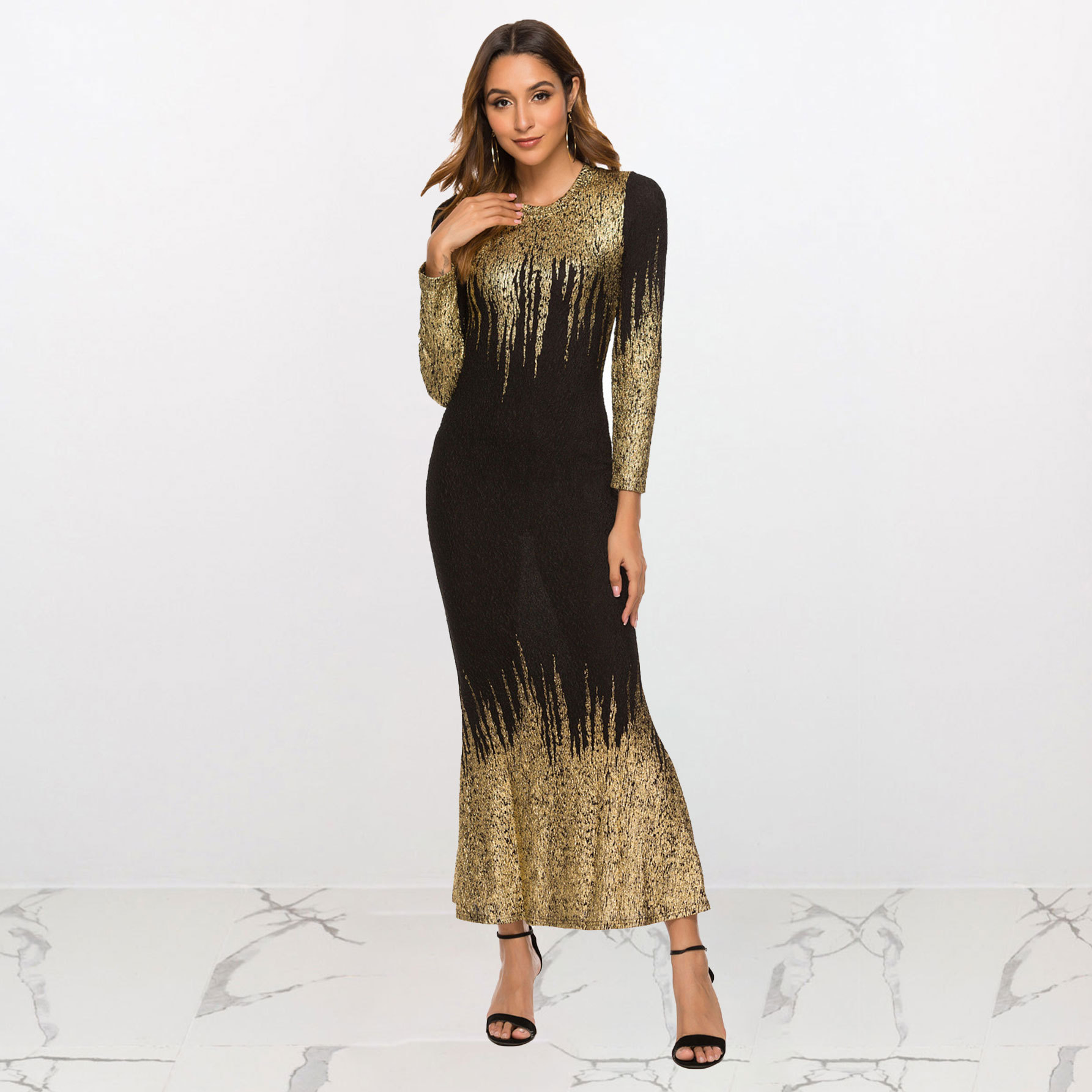 HN112 Eropa Amerika Amazon Model Baru Musim Gugur dan Musim Dingin Pakaian Wanita Gaun Lengan Panjang Ramping Bersablon Emas Gaun Terusan Wanita