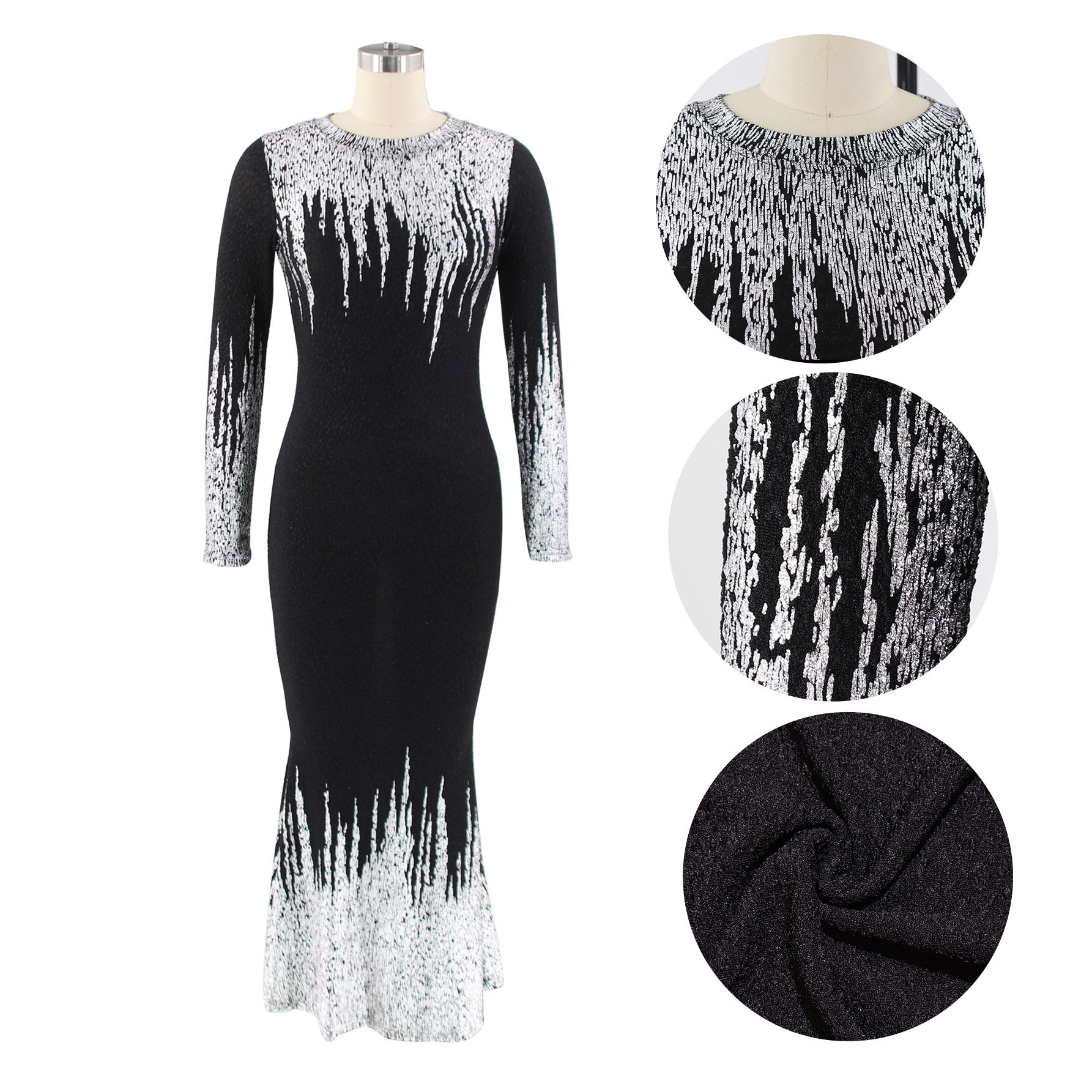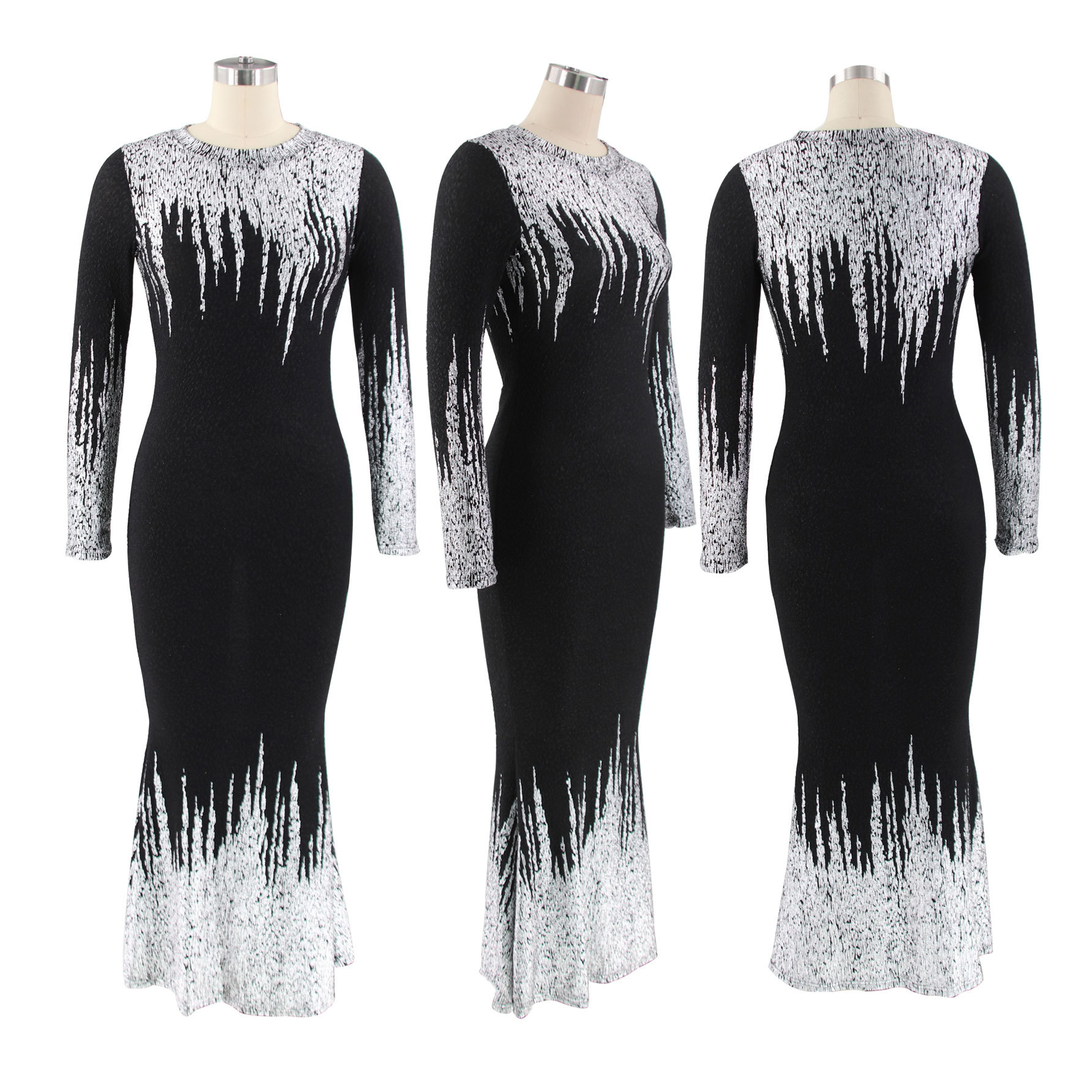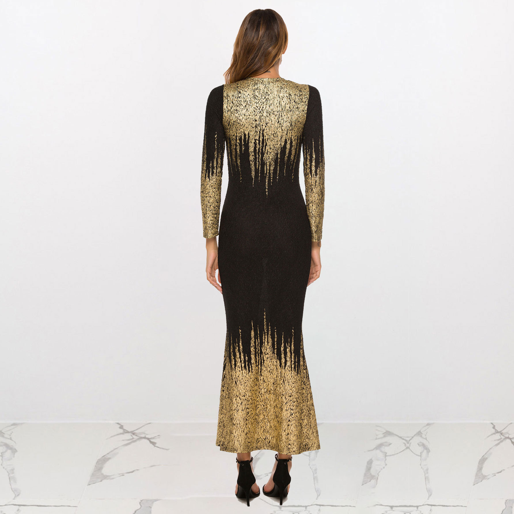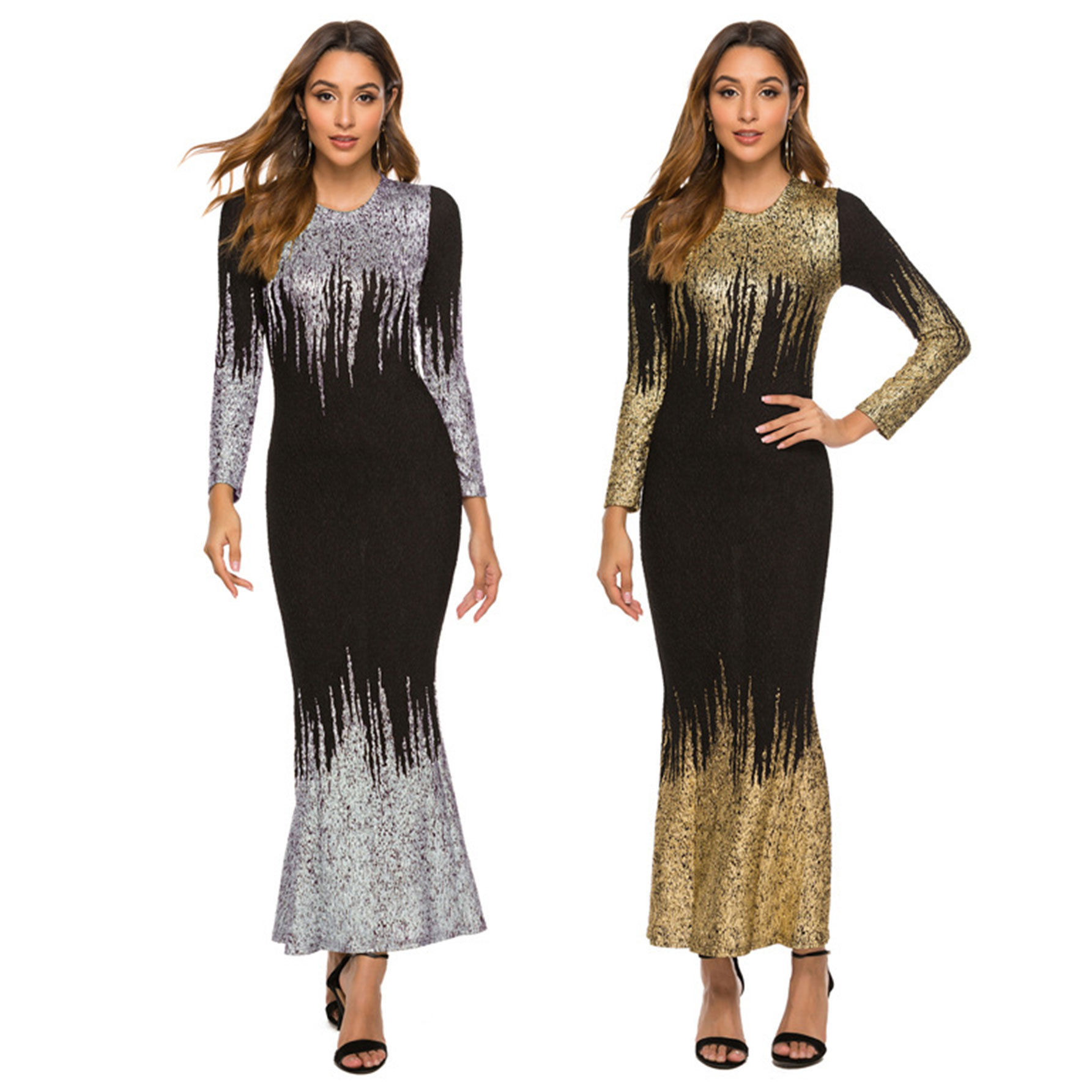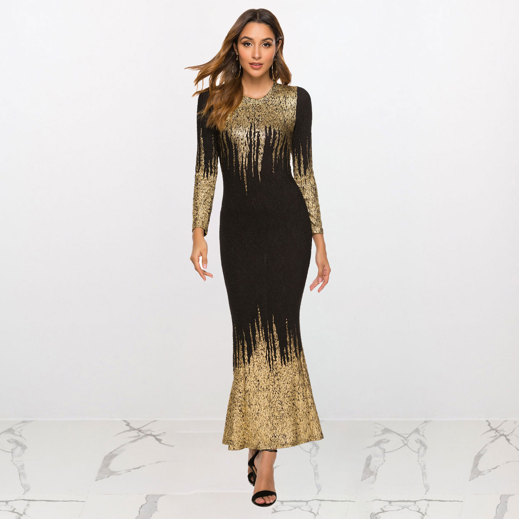 HN112 Eropa Amerika Amazon Model Baru Musim Gugur dan Musim Dingin Pakaian Wanita Gaun Lengan Panjang Ramping Bersablon Emas Gaun Terusan Wanita