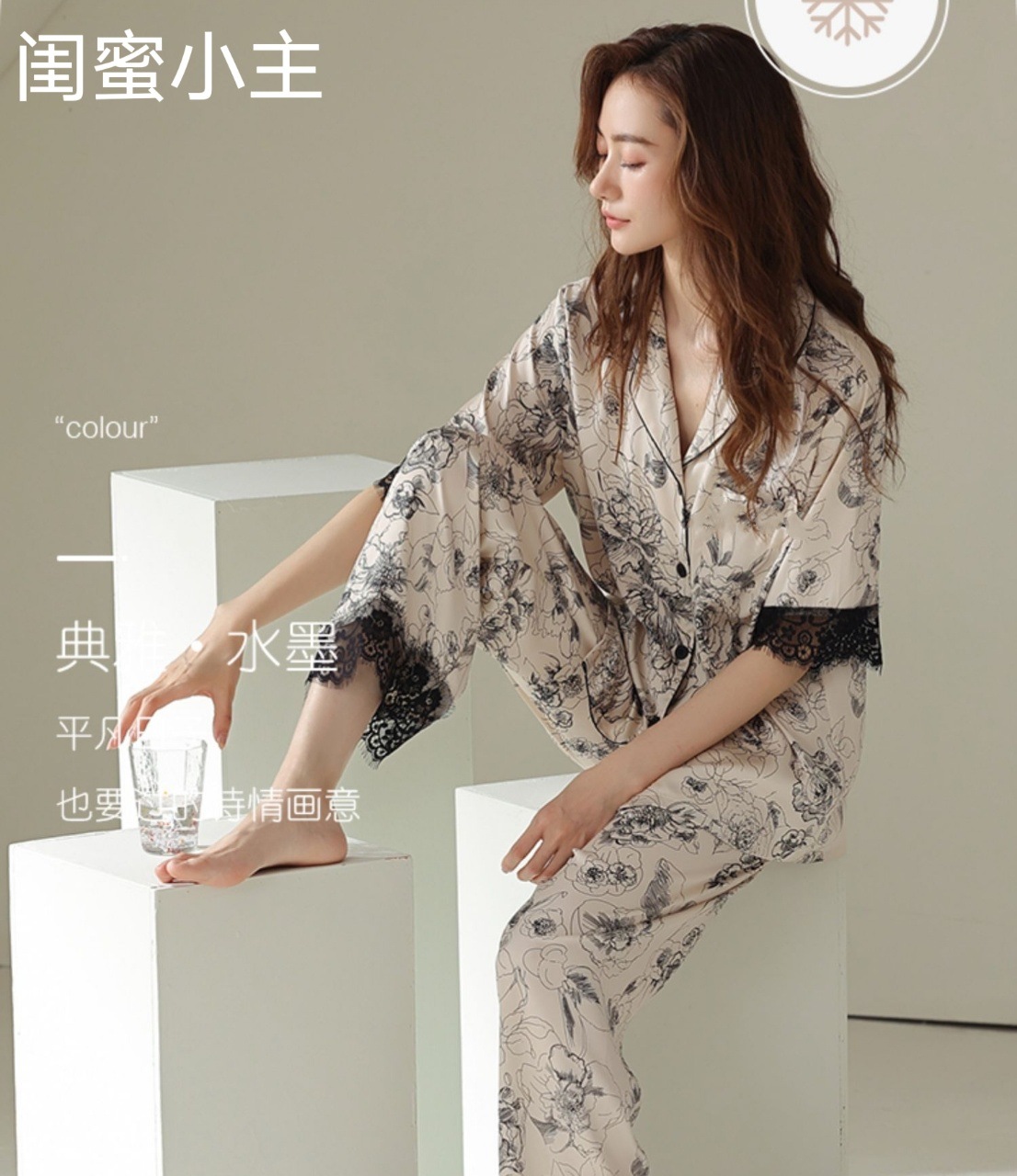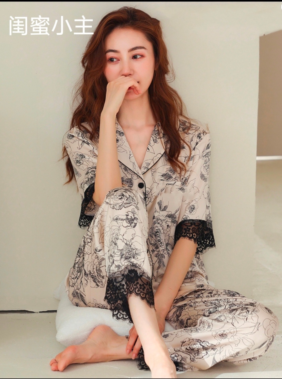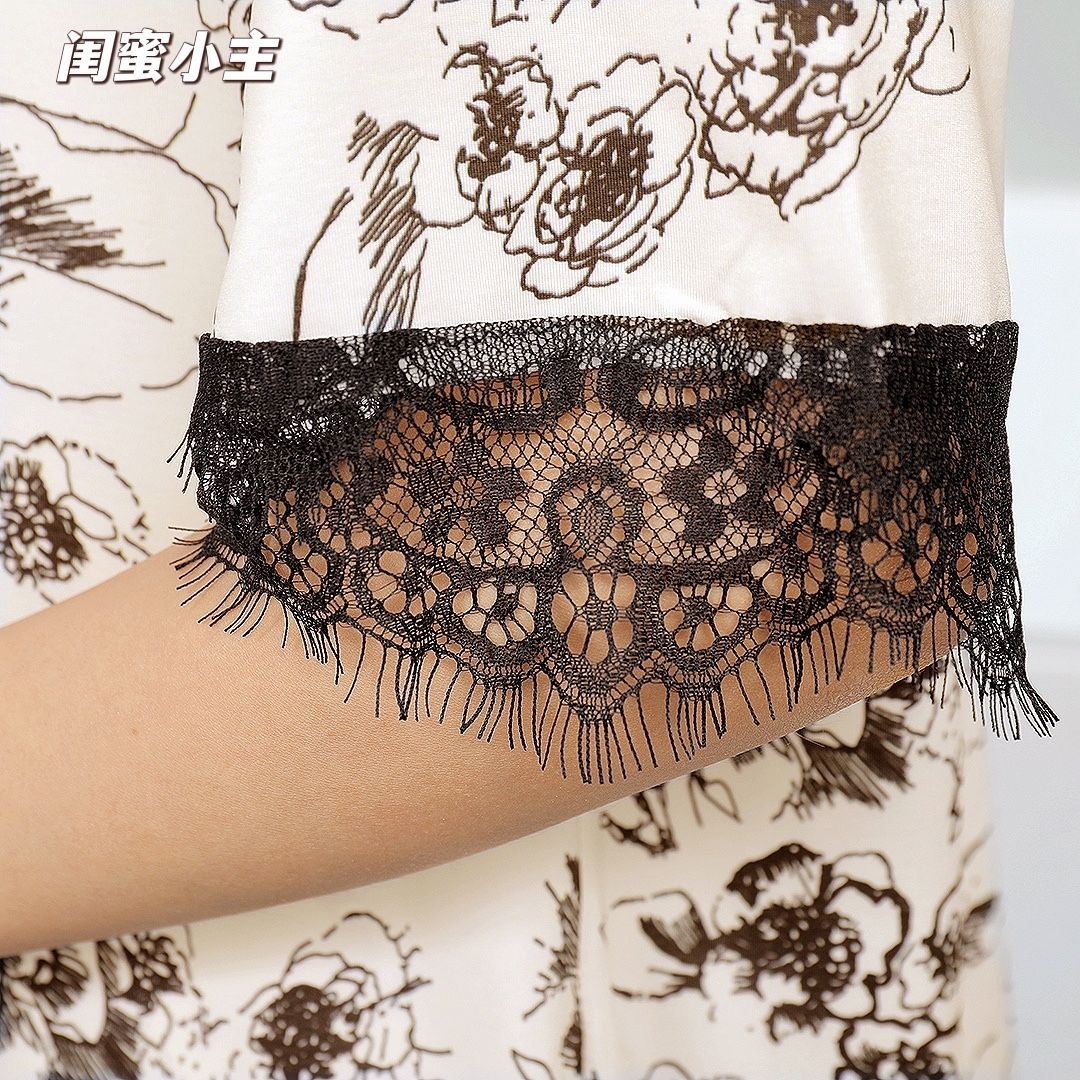 Piyama renda mawar empat potong untuk wanita, set pakaian rumah tipis bermotif nyaman dan elegan, gaya Prancis