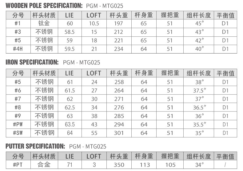 | 杆头材质 | 1木杆头:钛合金;#3-5:不锈钢;铁木杆:不锈钢;铁杆头:不锈钢 | |||