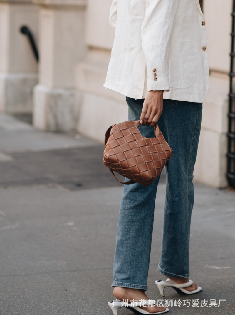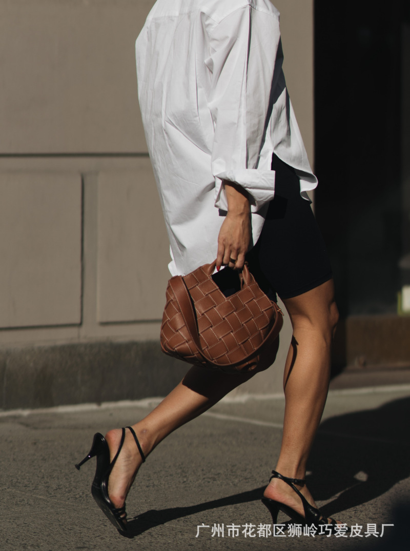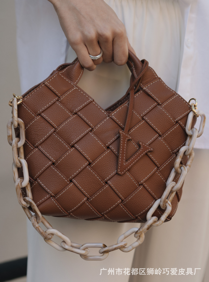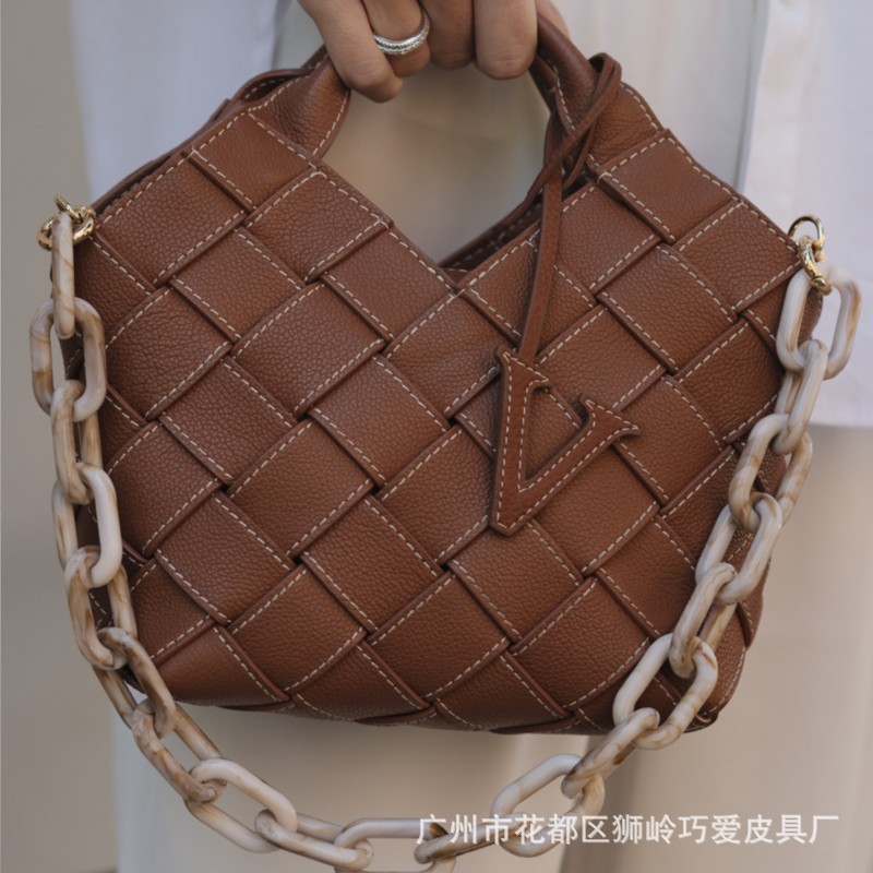 Tas selempang wanita dari kulit sapi asli bermotif lychee, anyaman tangan, merek tren 2025, dengan desain unik.