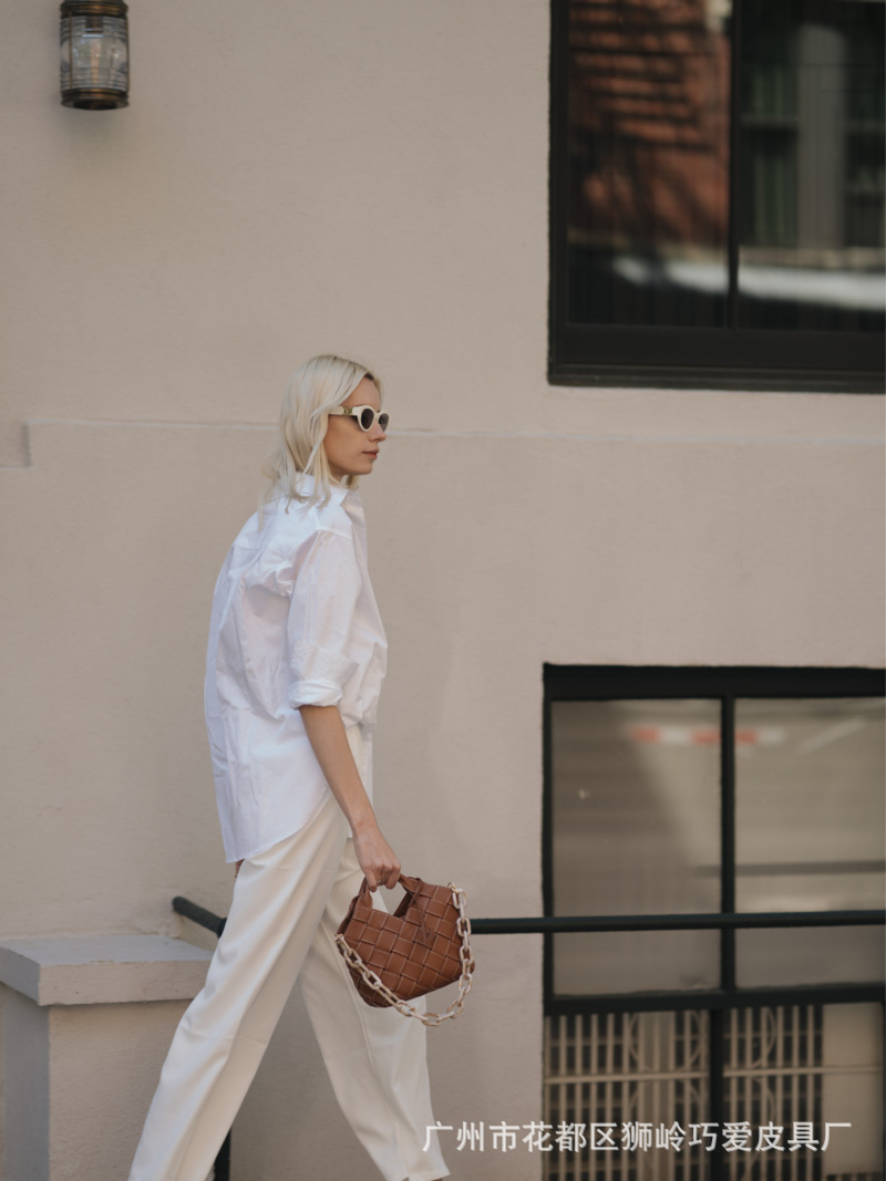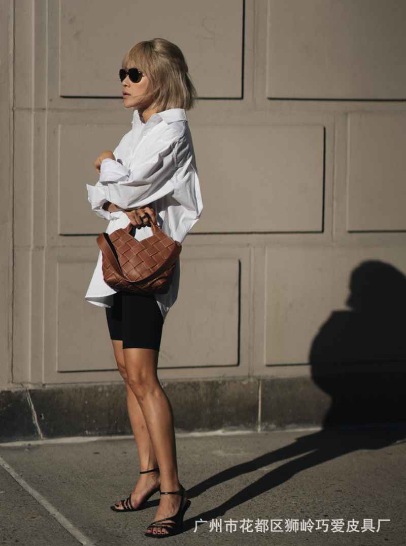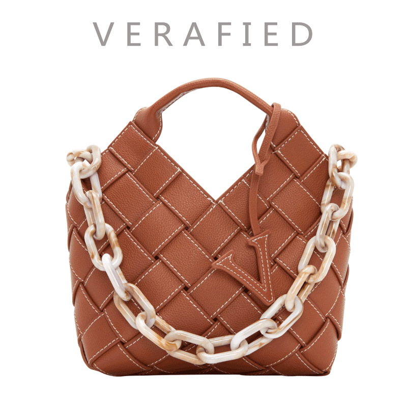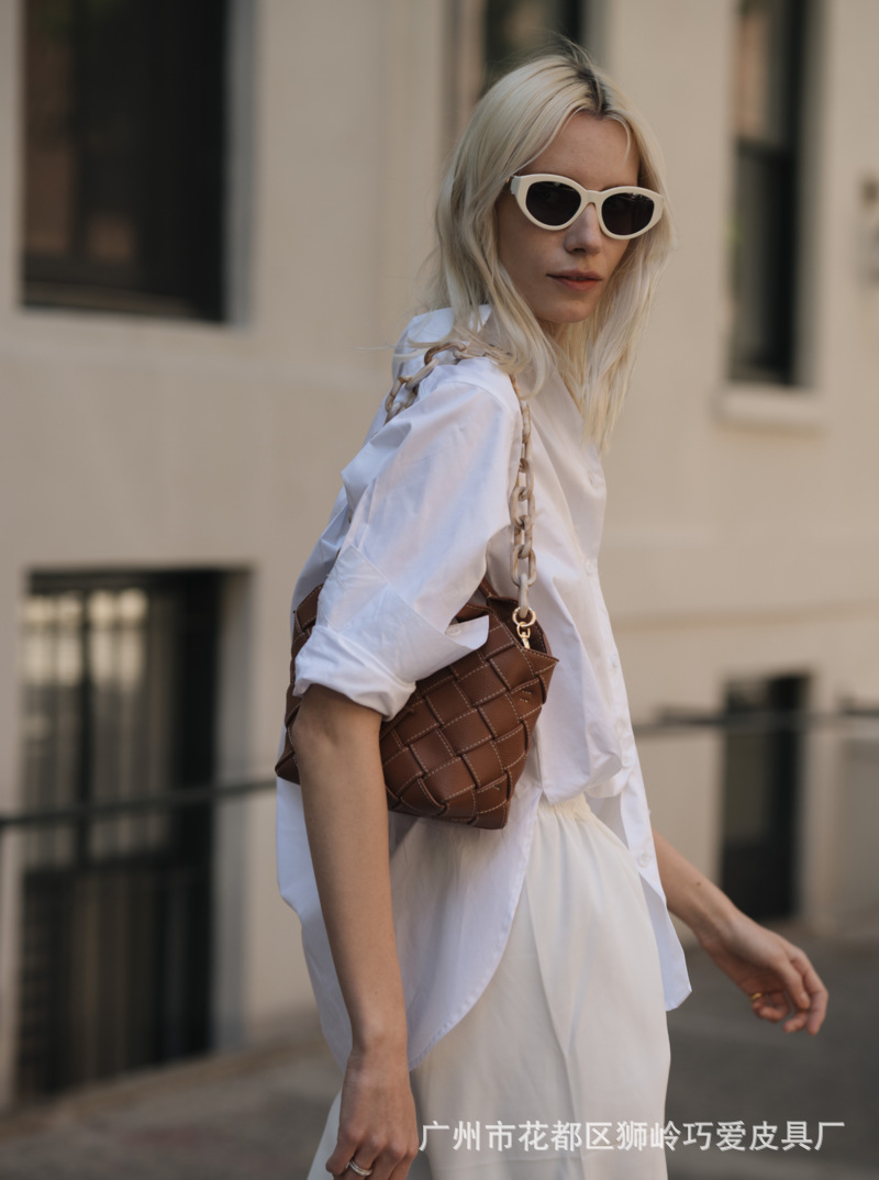 Tas selempang wanita dari kulit sapi asli bermotif lychee, anyaman tangan, merek tren 2025, dengan desain unik.