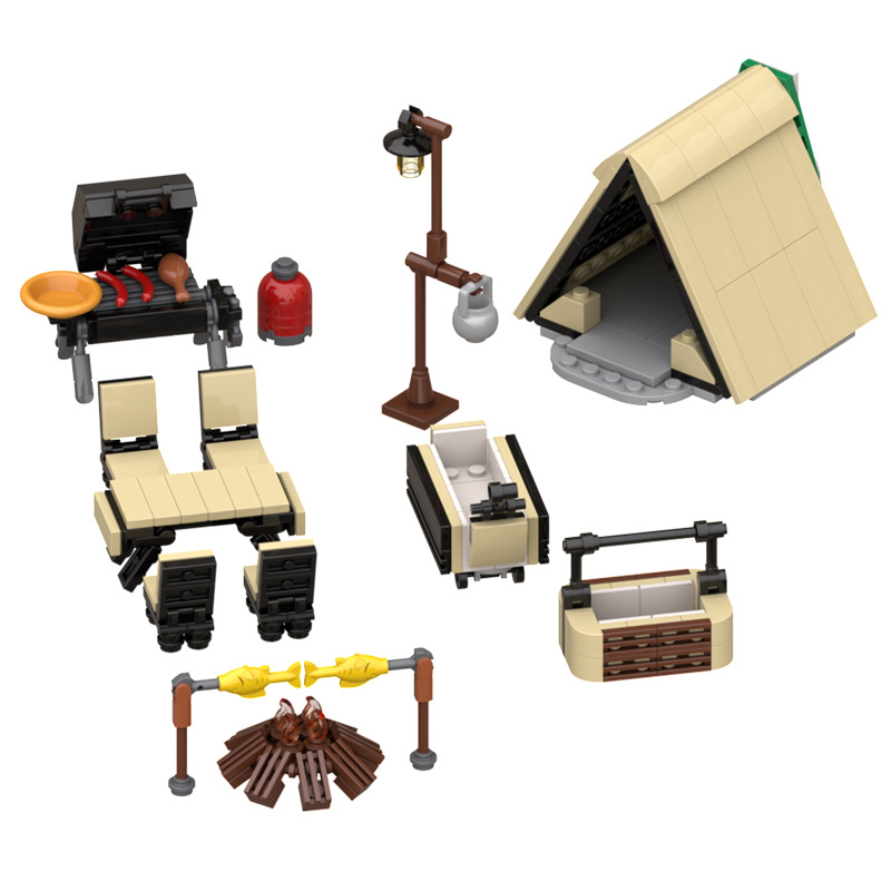 Seri model piknik dan berkemah trendi, tenda mainan blok rakitan, tenda Kemah, Meja gulung telur api unggun, cocok dengan Lego