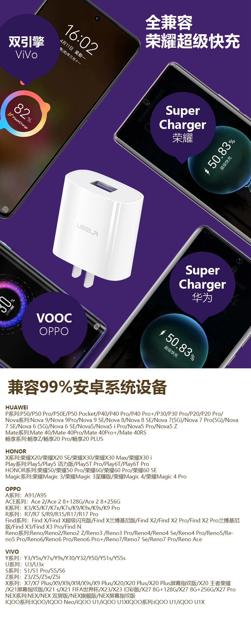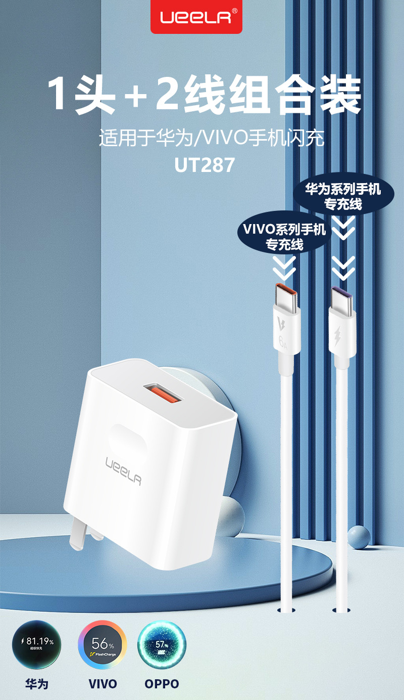 1.优耳UT287,创新一个充电头,配两根数据线,兼容华为,荣耀,VIVO,IQOO,OPPO几乎全部机型,再也不用为一个充电器不能兼容所有机型而烦恼。