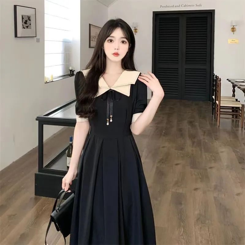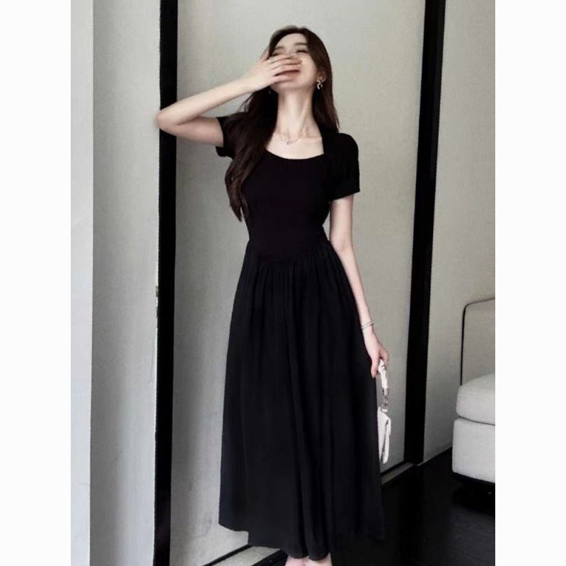 黑色赫本风短袖设计感气质连衣裙女夏季感御姐风收腰显瘦长裙