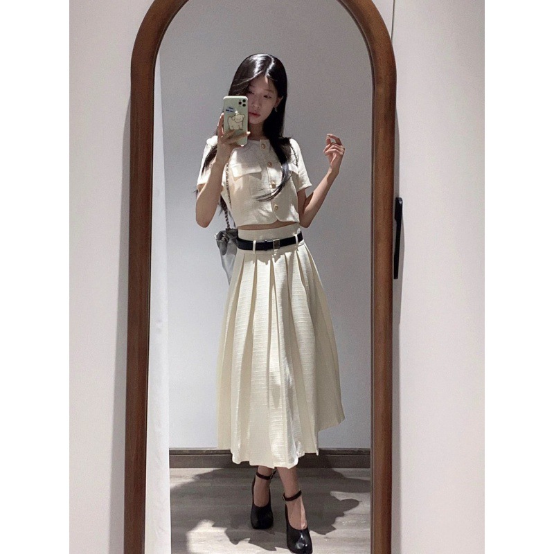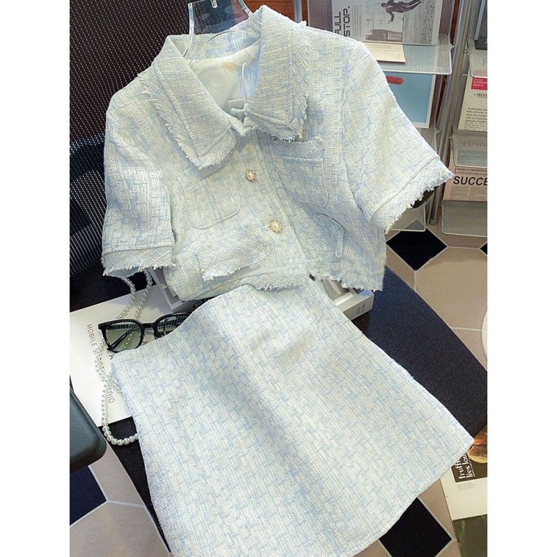 2024年夏富家千金百褶裙套装小香风短袖外套开衫小个子上衣长裙