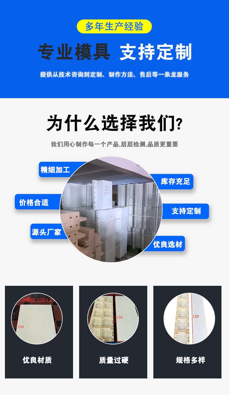 产品用途:模具主要运用于水利水库、农业沟渠、市政配套工程、园林景观设计、高速公路、高速铁路等工程方面小型水泥、混凝土预制件的模块化、标准化生产和施工,脱模成品能有效提高相关工程施工精度和施工进度,做到省事省力符合工程标准!!