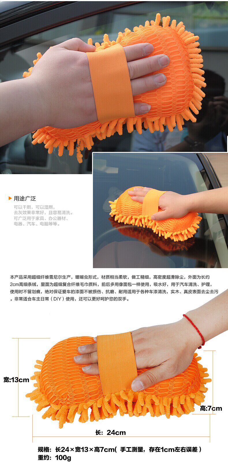尺寸大,用料足,我们的单品重量要比市面上普通的雪尼尔手套重很多。所以吸水性和去污力都是普通手套无法比拟的!手套为手工制作,如存在0.5厘米左右的误差,请谅解。
