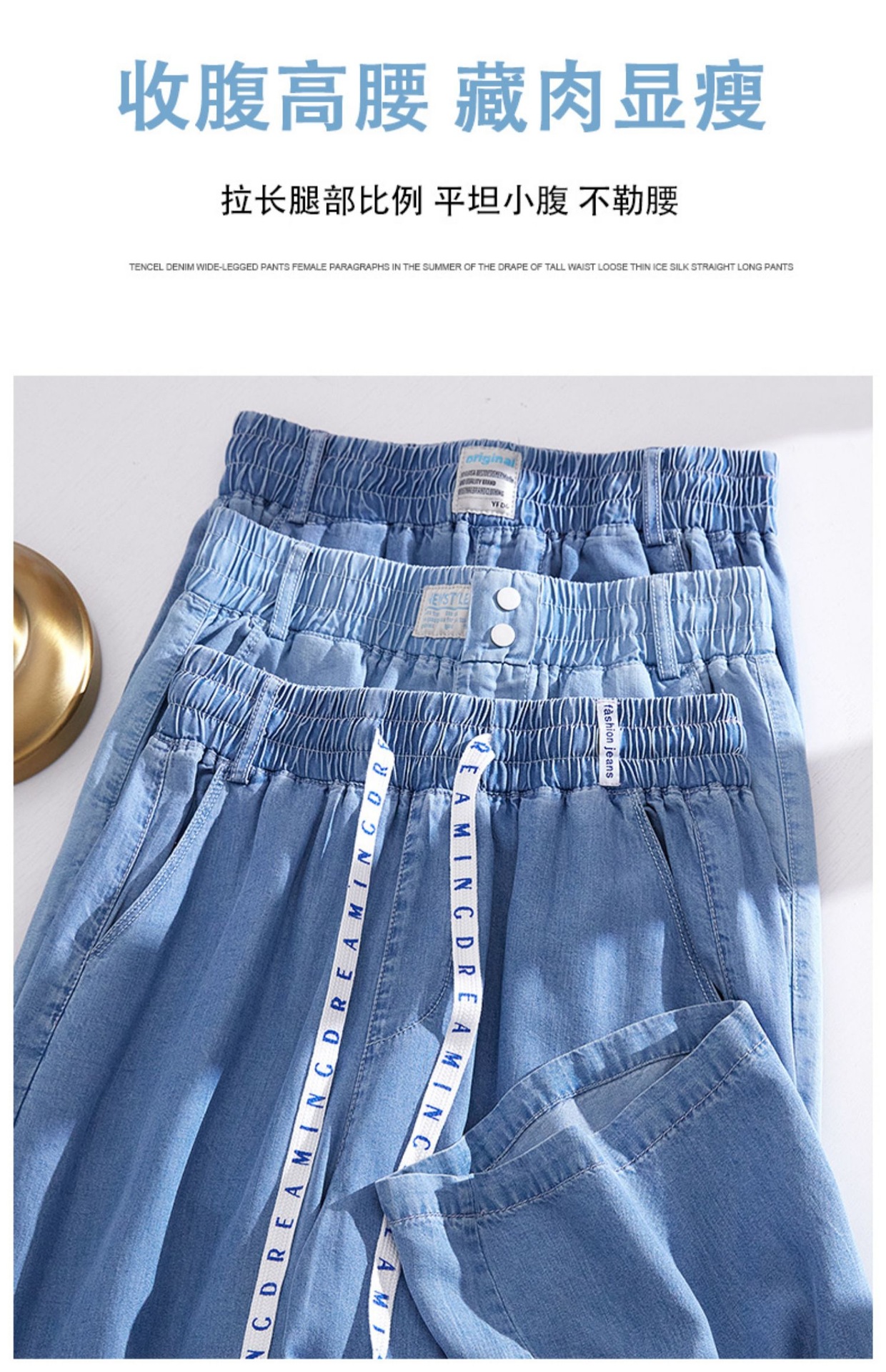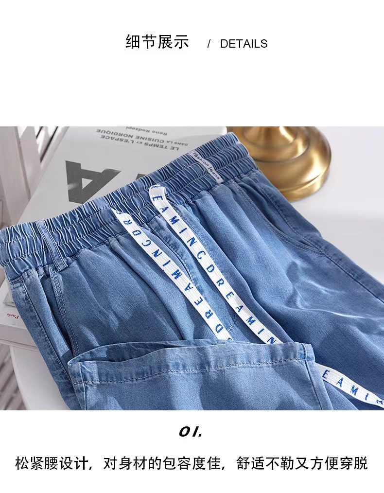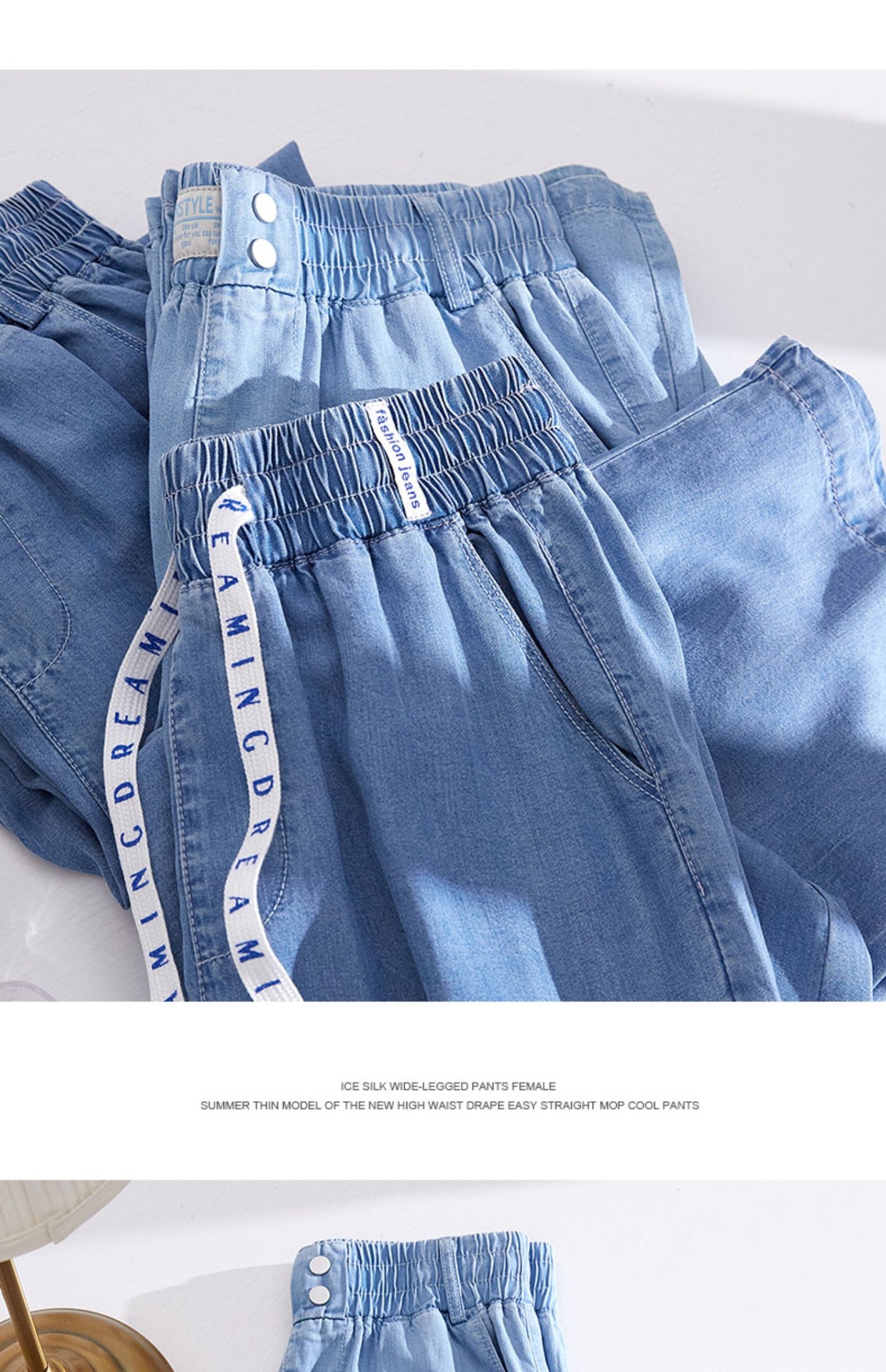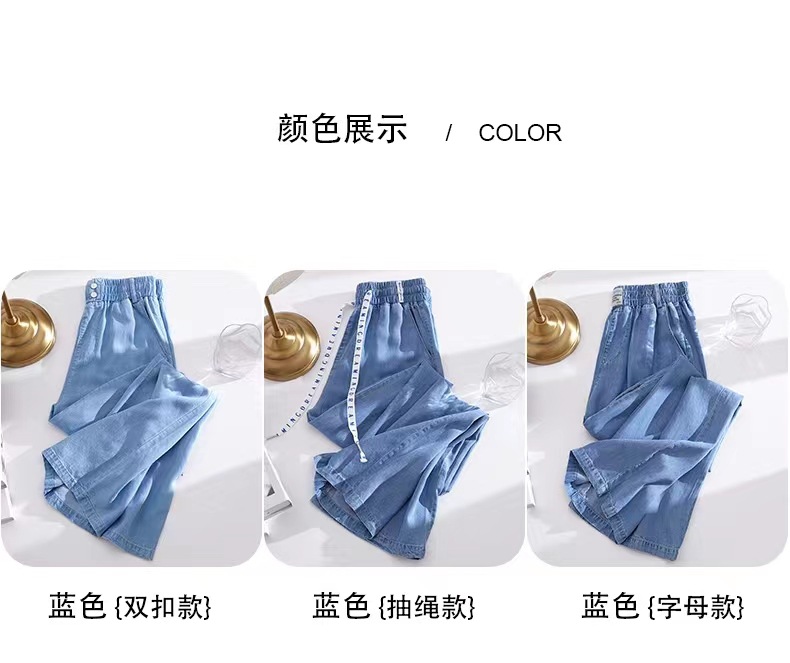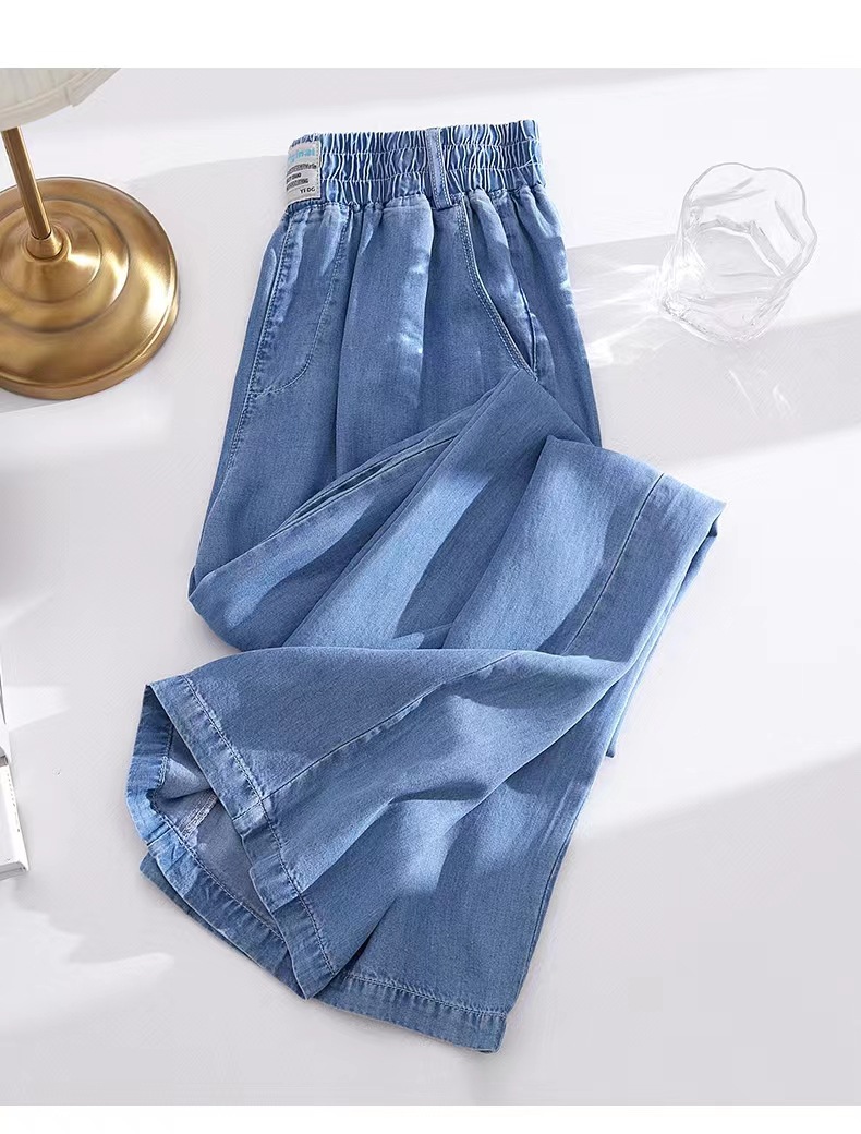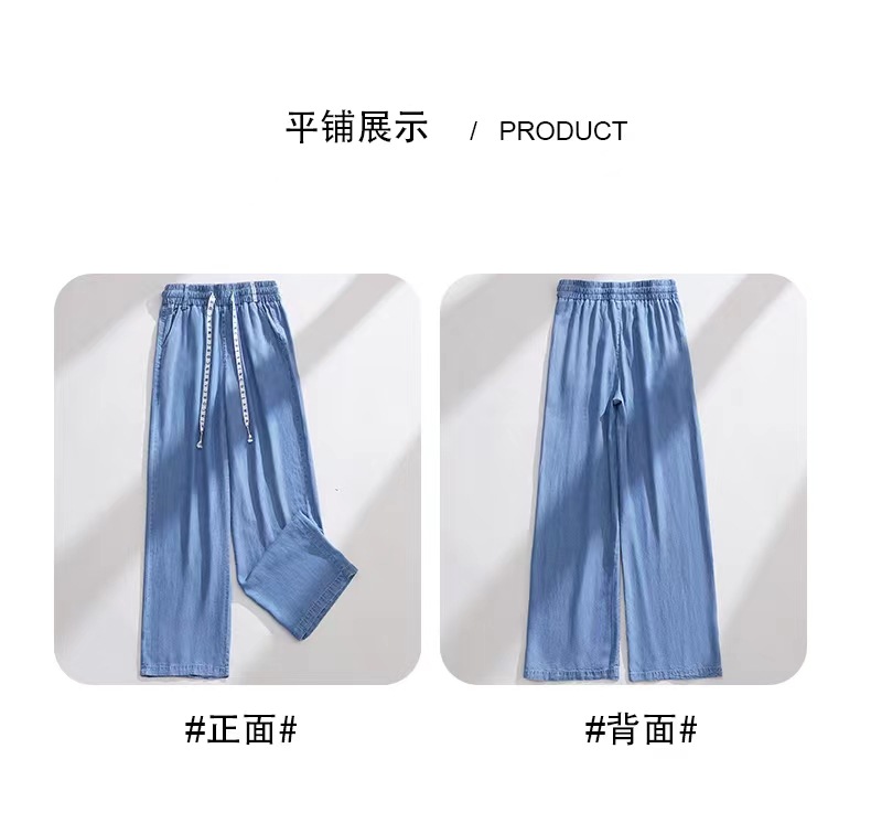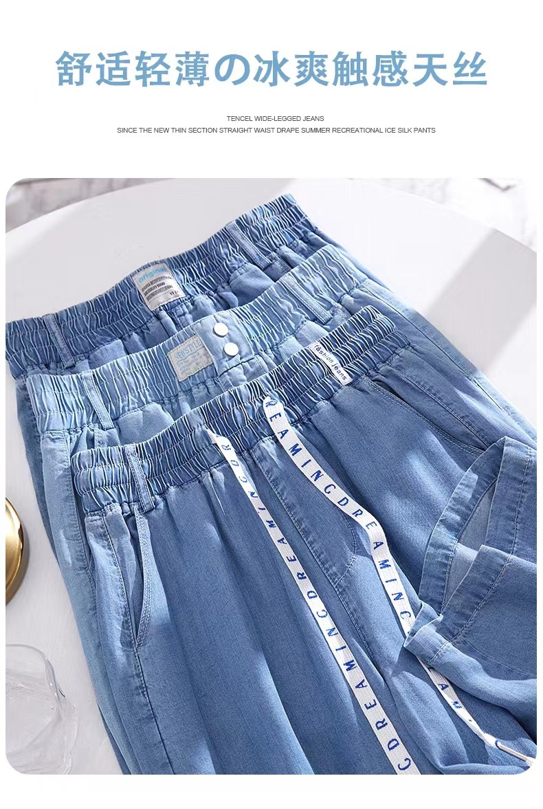 Celana kasual wanita Tencel jeans tipis berpinggang tinggi, model drapey kasual Korea untuk musim semi dan gugur, celana lebar bahan sutra es yang stylish.