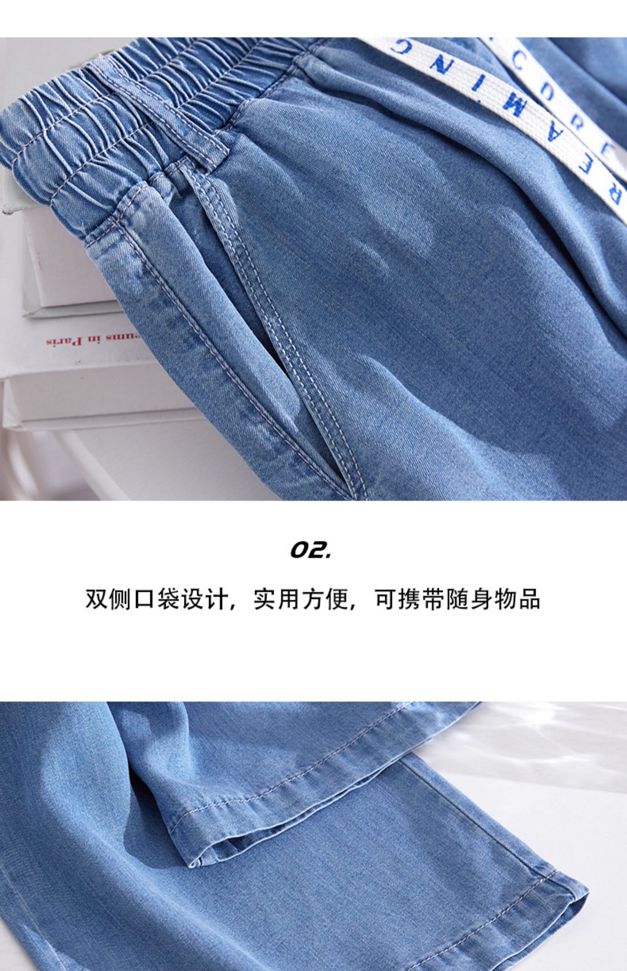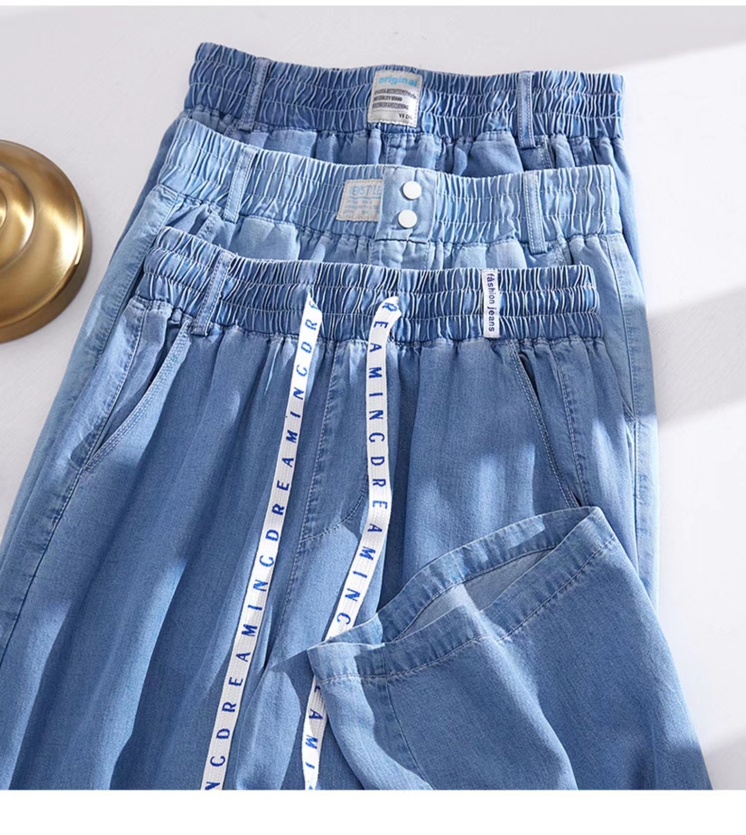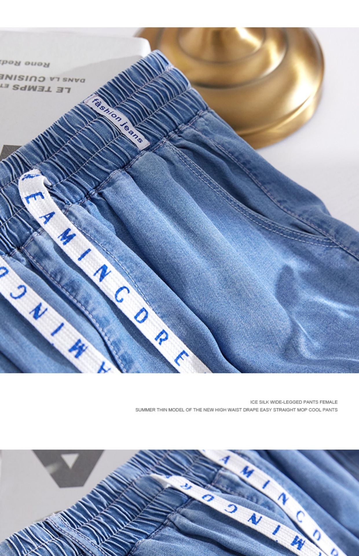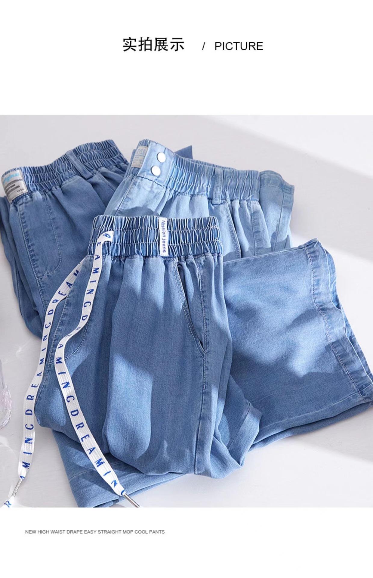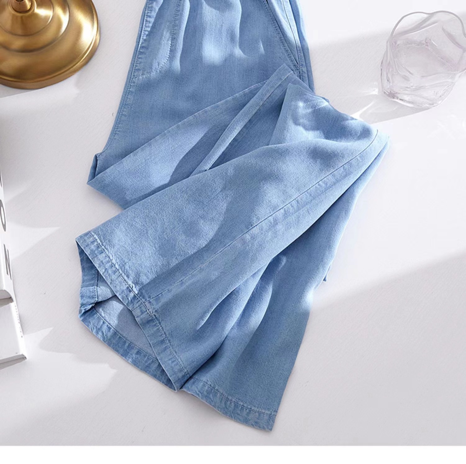 Celana kasual wanita Tencel jeans tipis berpinggang tinggi, model drapey kasual Korea untuk musim semi dan gugur, celana lebar bahan sutra es yang stylish.