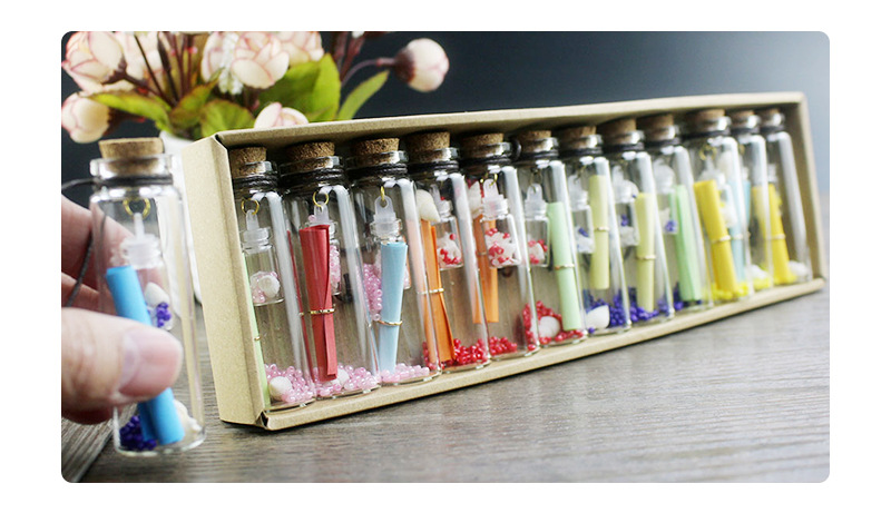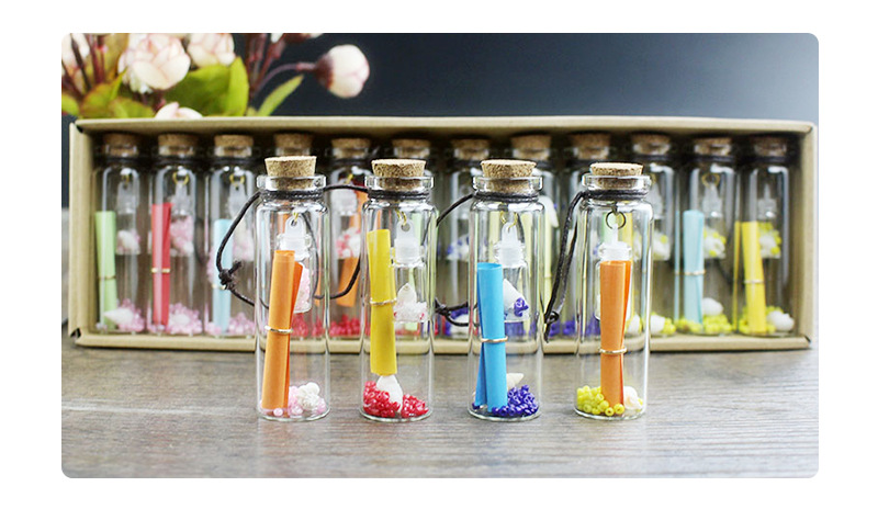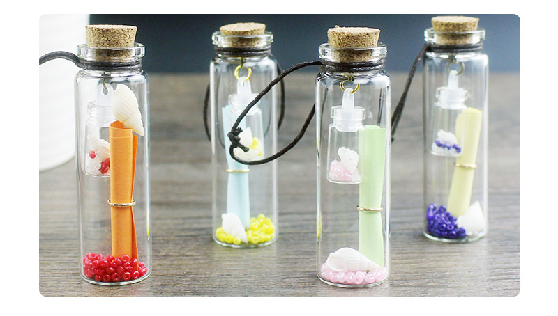 夜光砂许愿瓶组成部分:瓶子+木塞+绳子+瓶中瓶(内为夜光砂)+海螺+许愿卷纸+底下小珠子
