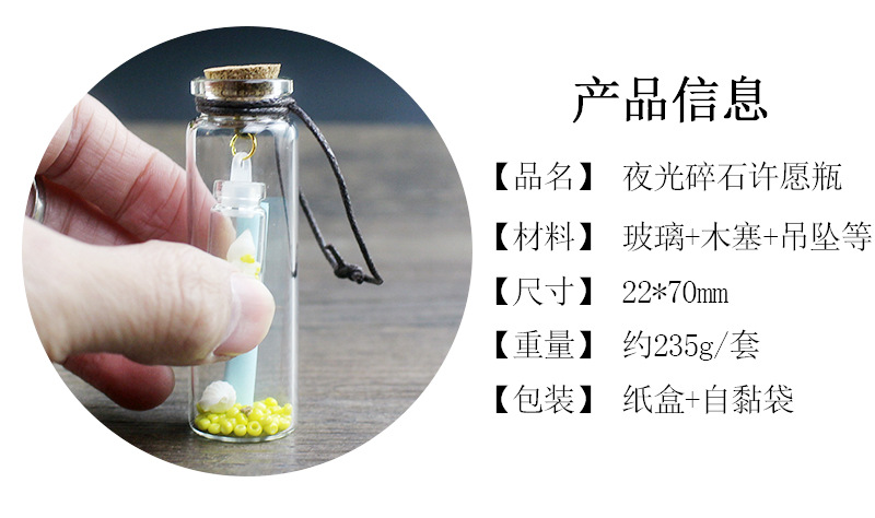 夜光碎石许愿瓶尺寸:高7CM,瓶底直径2.2CM,瓶口内径1.25CM,木塞突出部分约0.2-0.5CM左右,容量18ML~~~