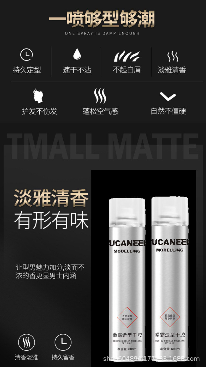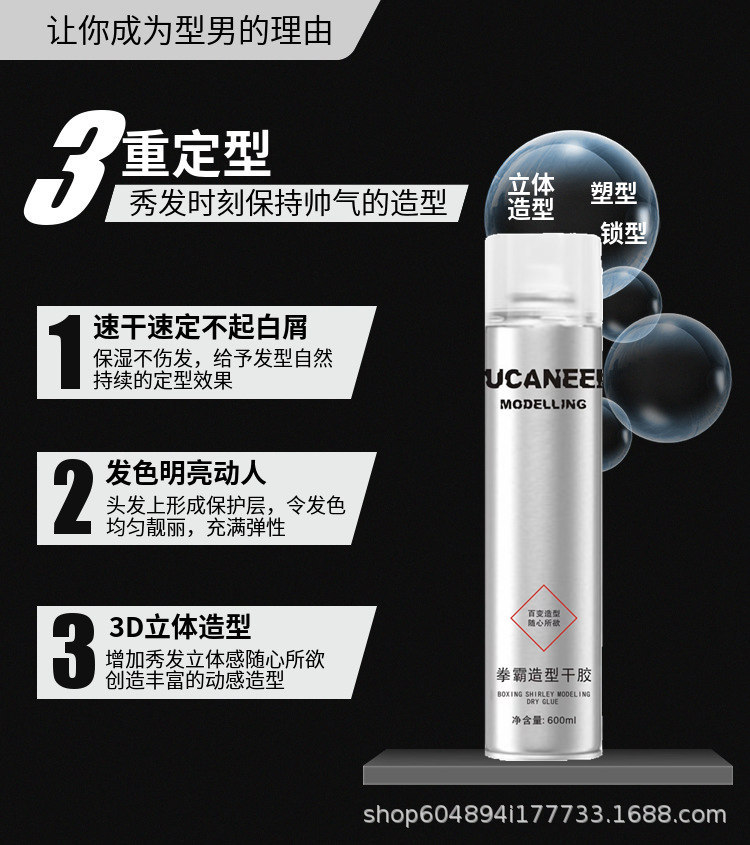 【使用方法】:发蜡啫喱造型后,使用本品摇一摇距离发丝20厘米处喷于发丝上,如想要最求更硬发型可8厘米处喷于发丝表面