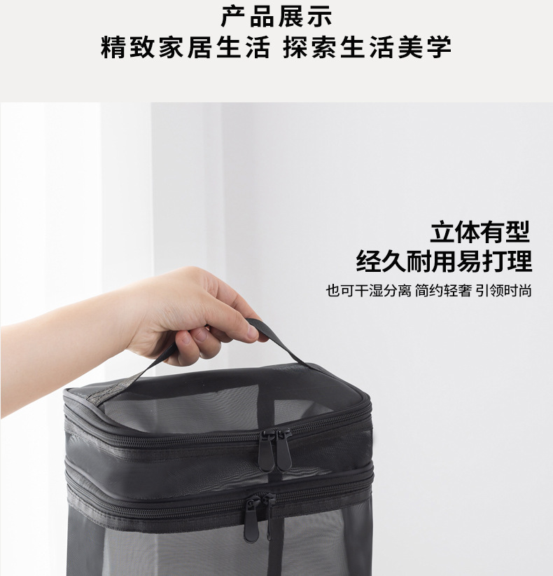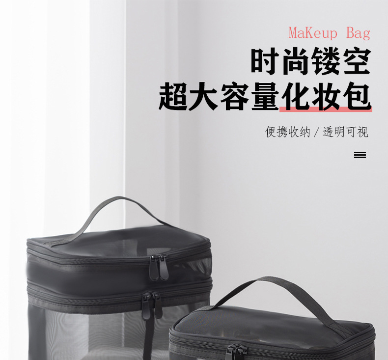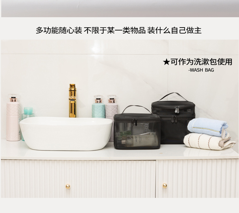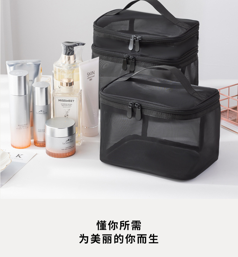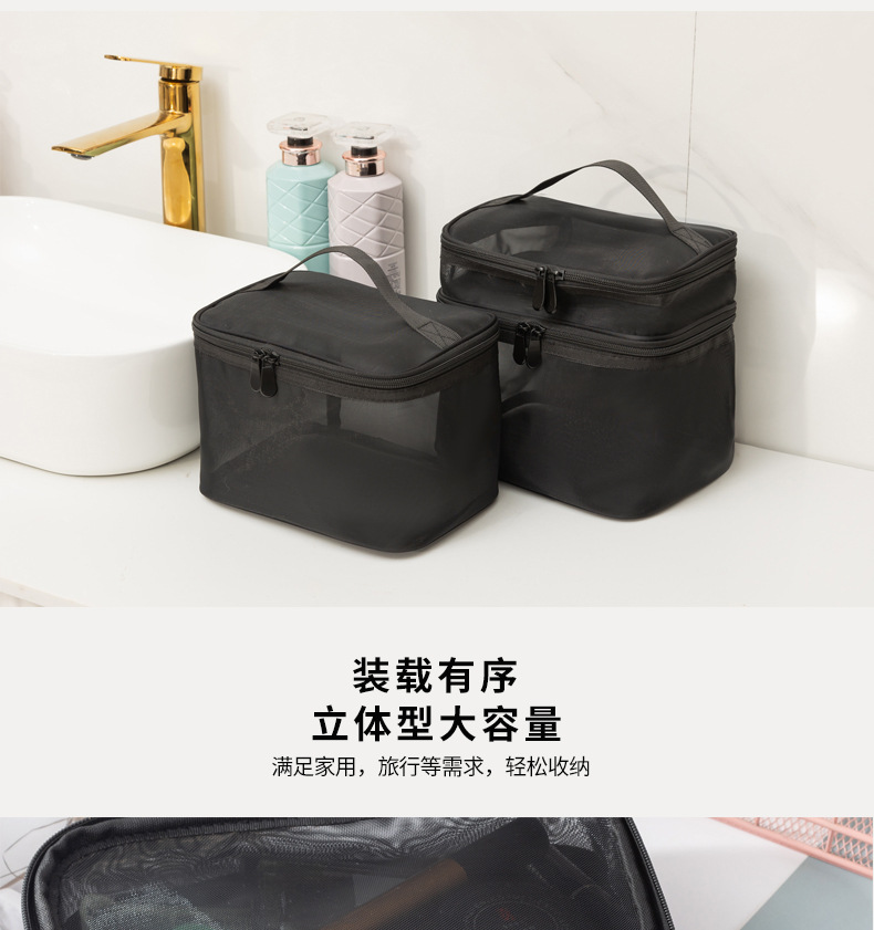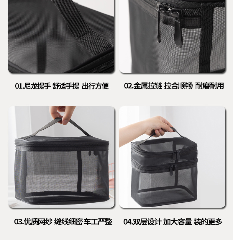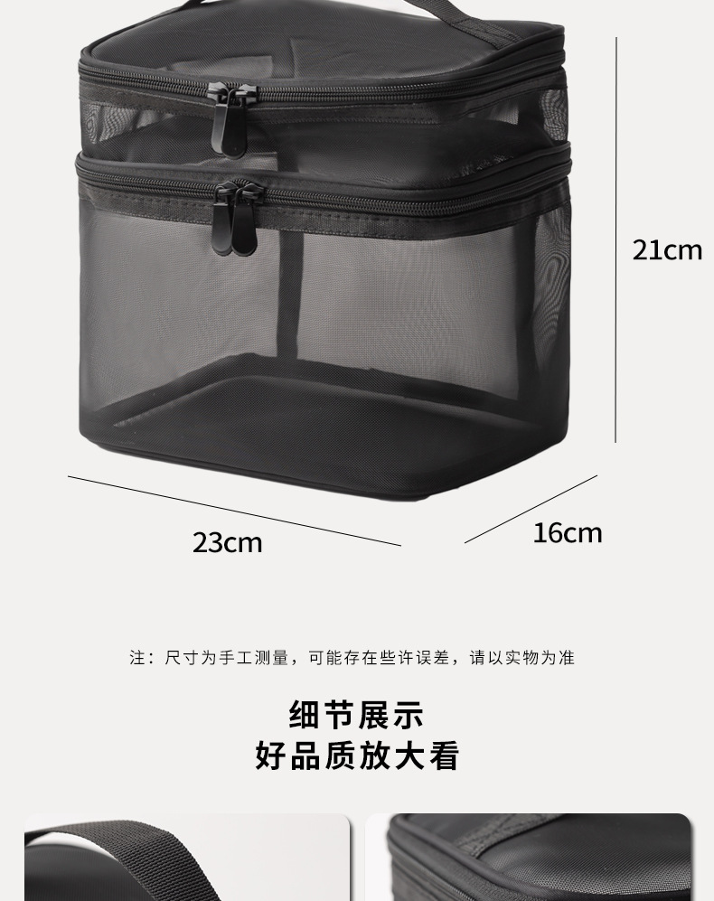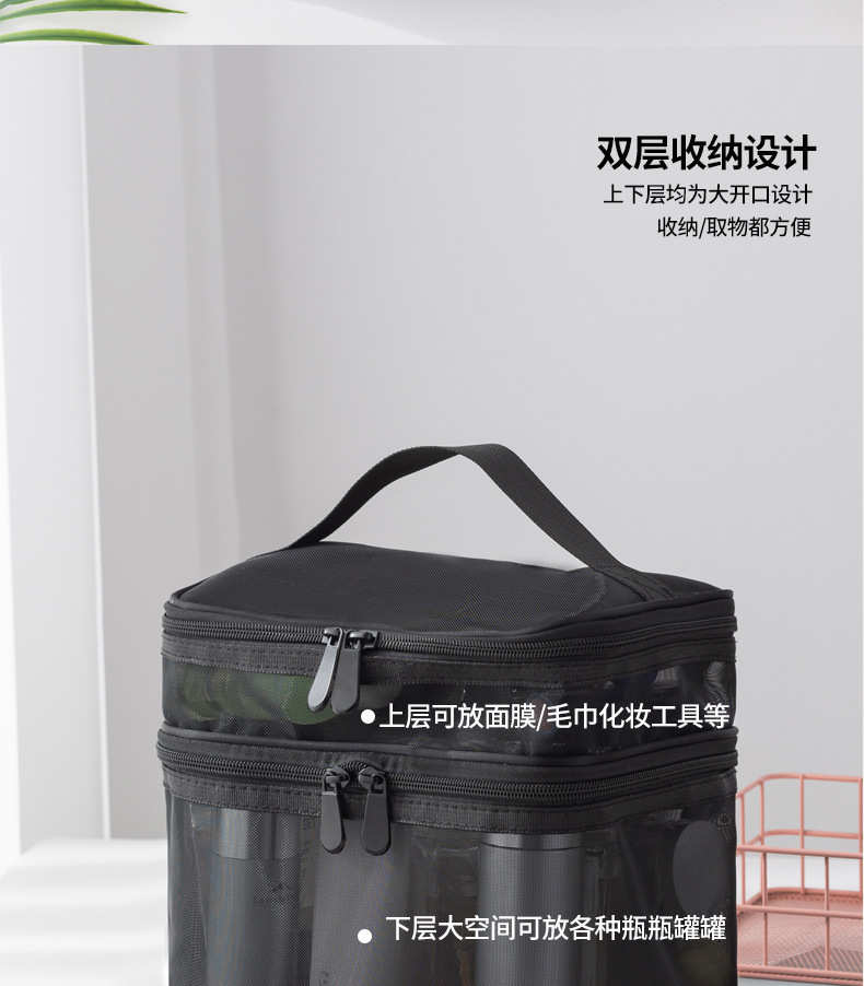 Tas kosmetik dua lapis dengan kapasitas besar, model 2025, tas penyimpanan kosmetik transparan jala nilon portabel, tas perlengkapan mandi.