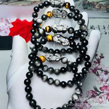 天然黑曜石银曜石雕刻貔貅男女手链 搭配虎石珠 直播货源大量批发