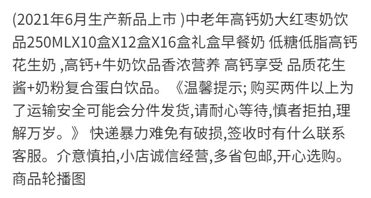中老年高钙+牛奶复合蛋白饮品250毫升X10盒X12早餐花生奶味无蔗糖