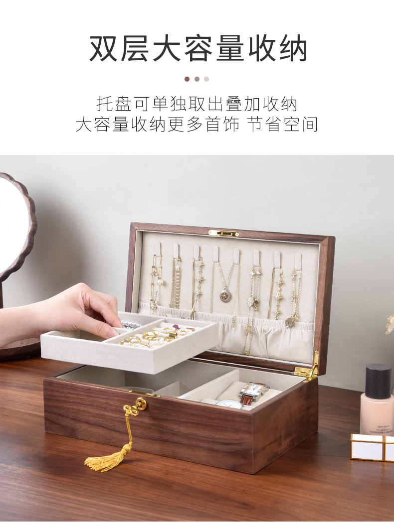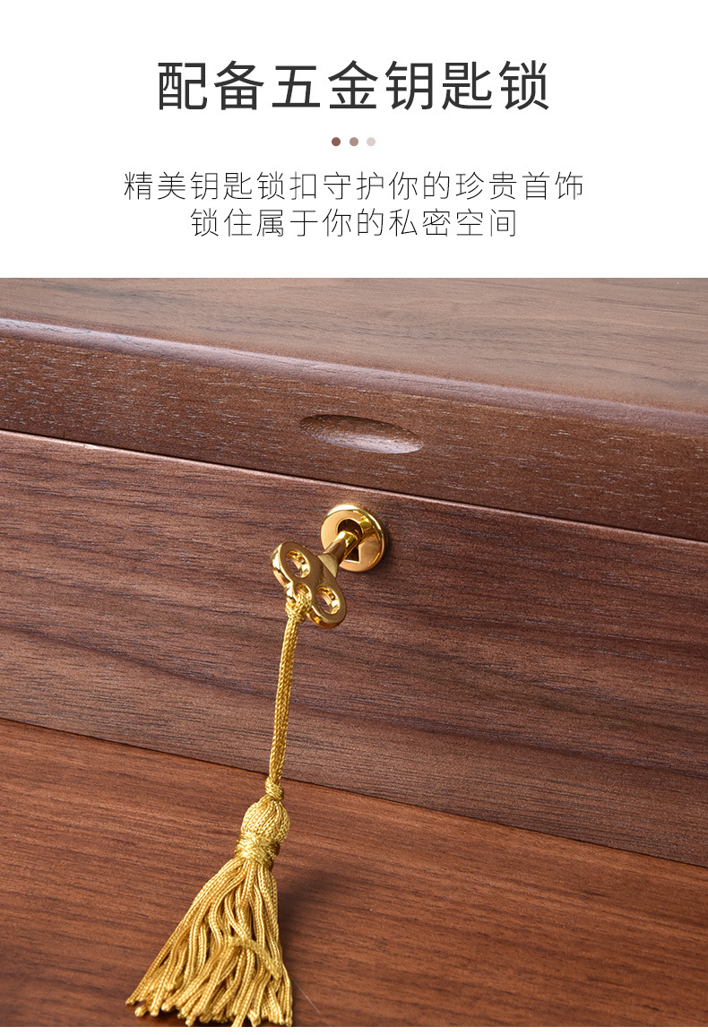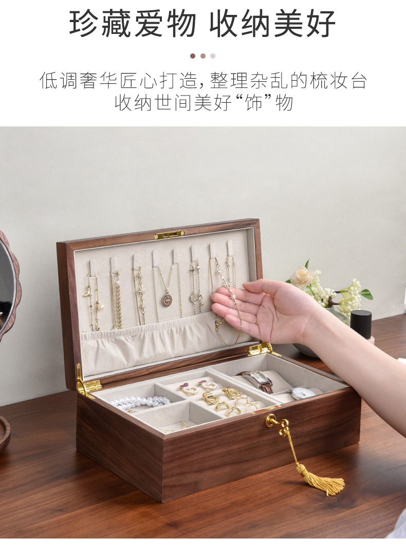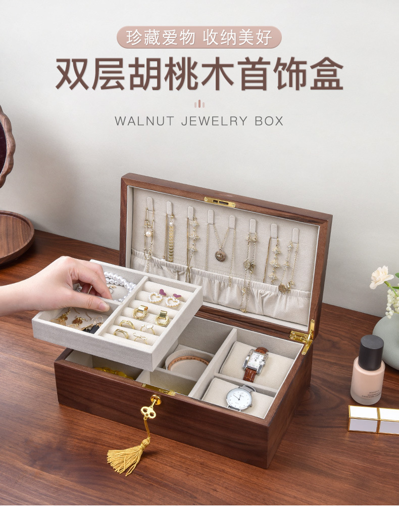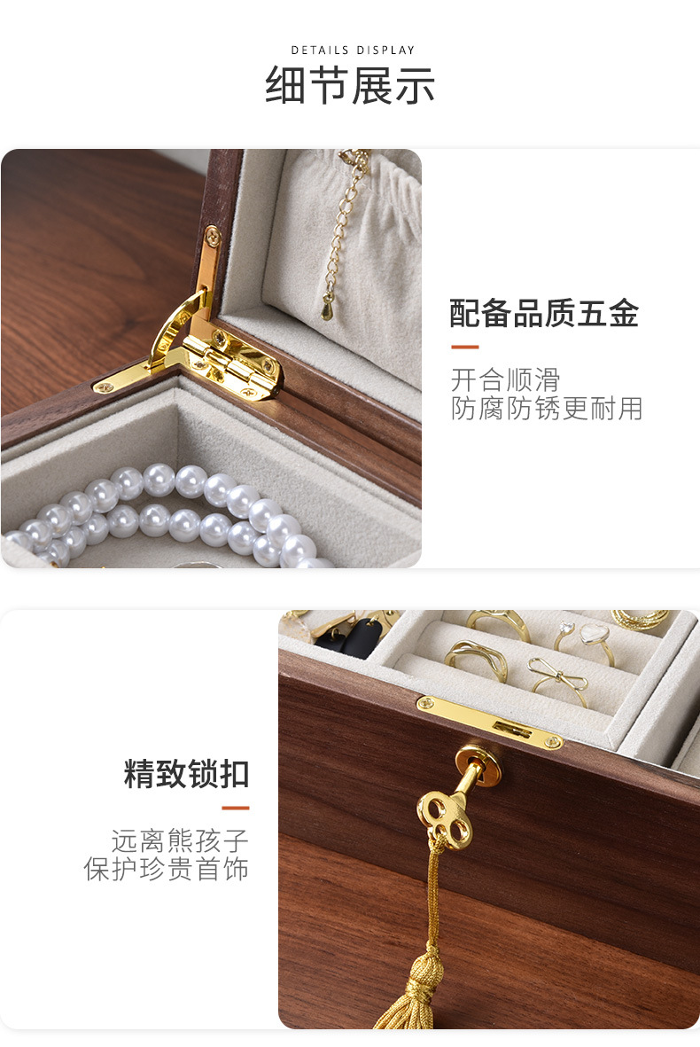 胡桃木手工带锁首饰盒2024新款高级感轻奢三金饰品收纳盒双层木质