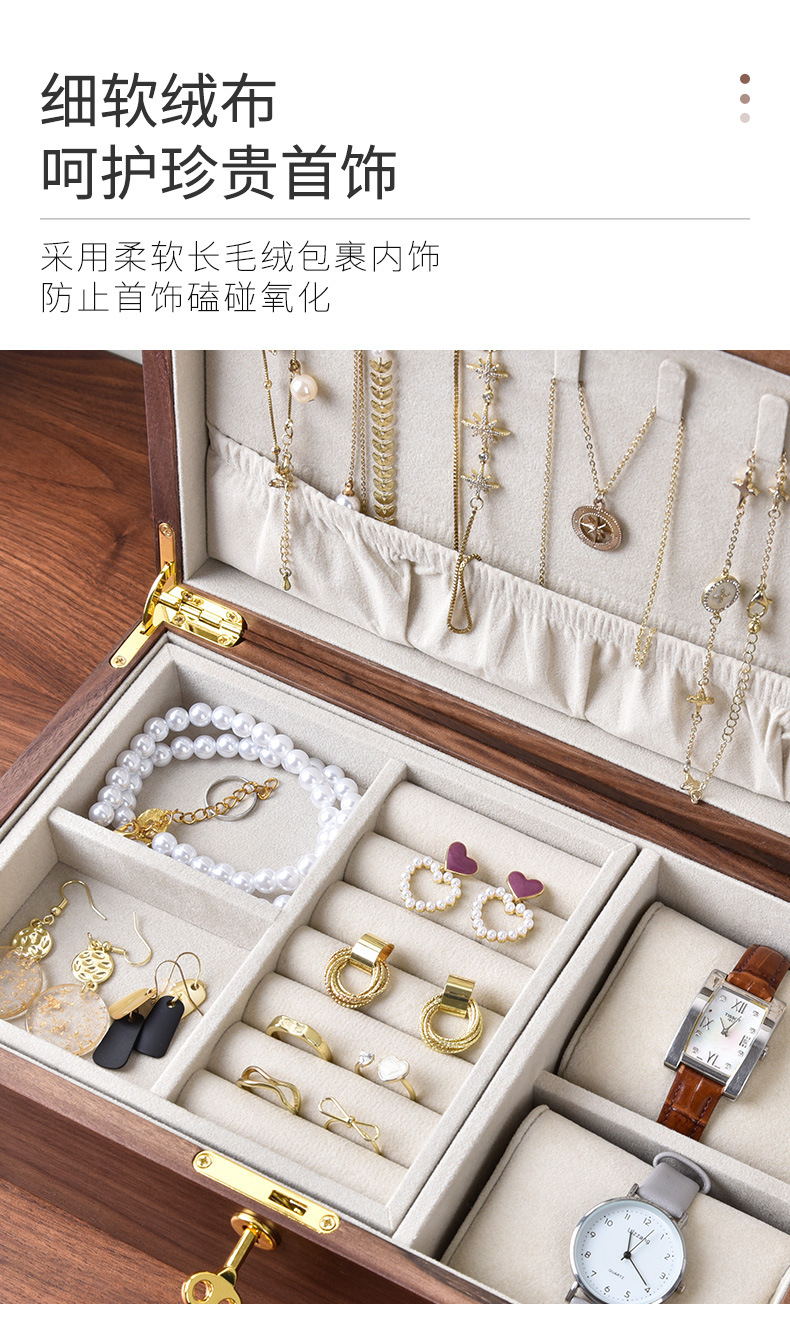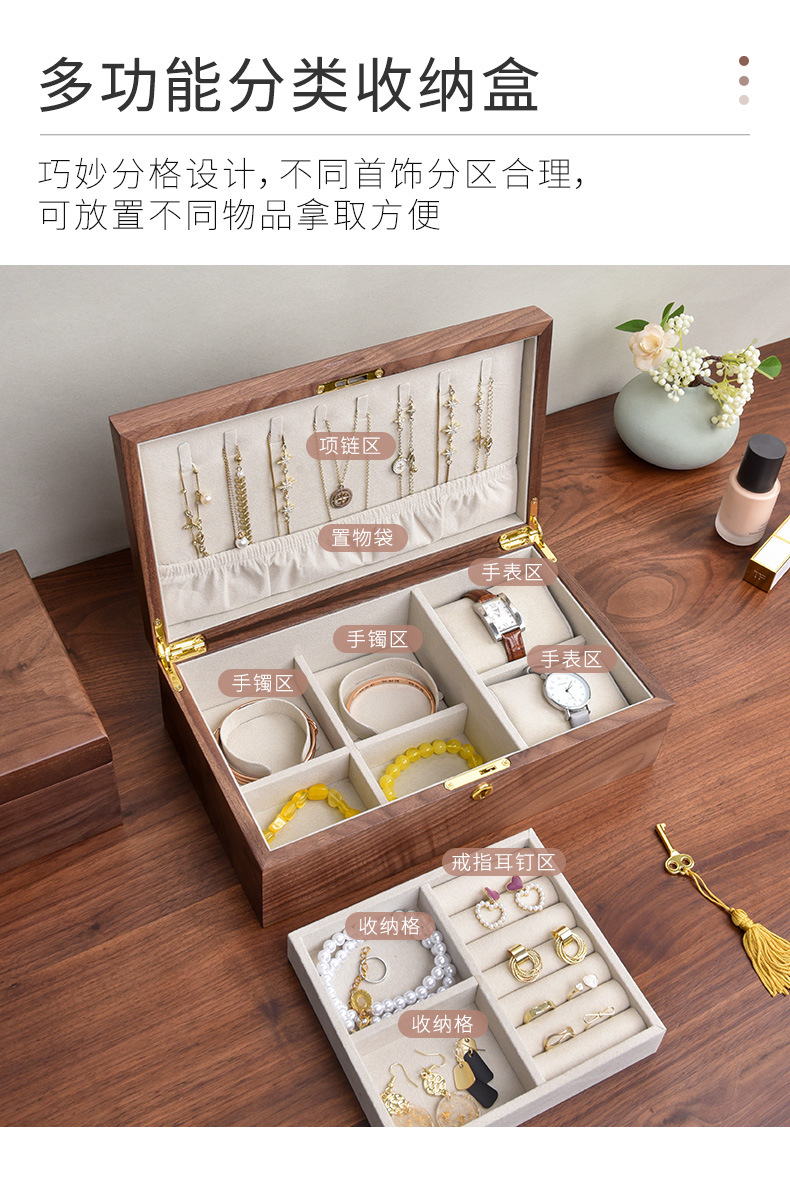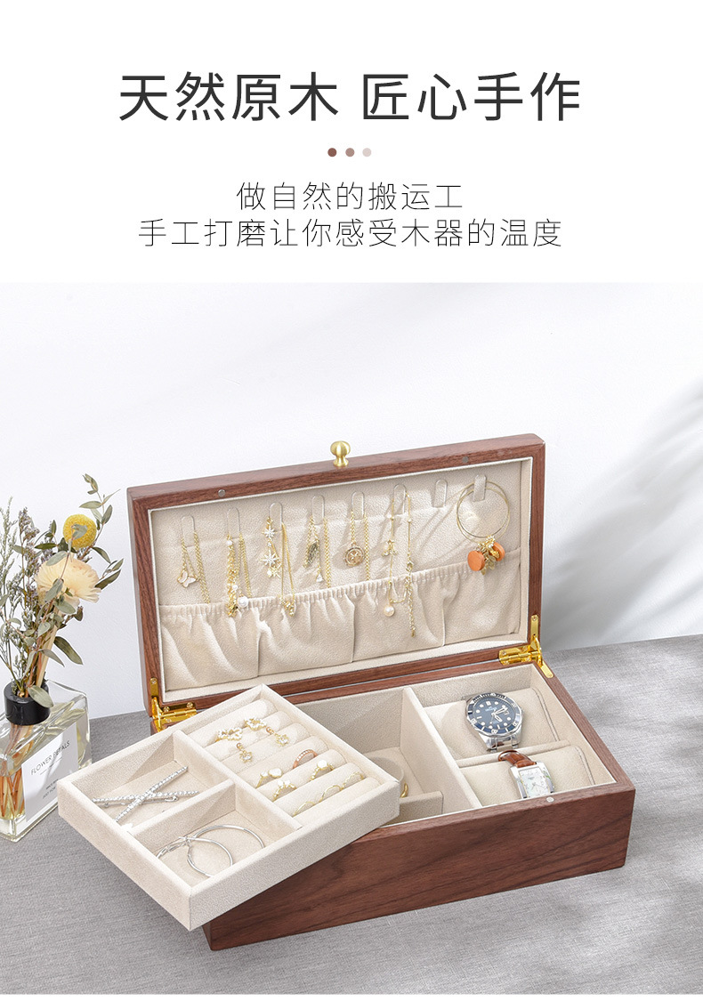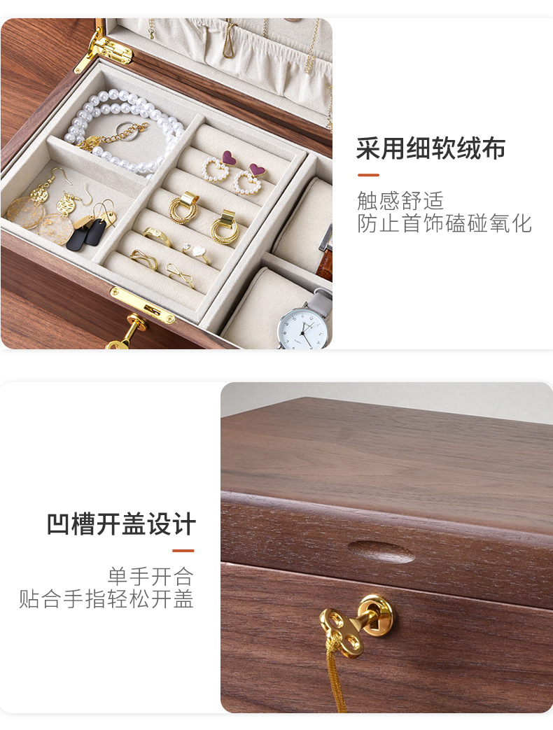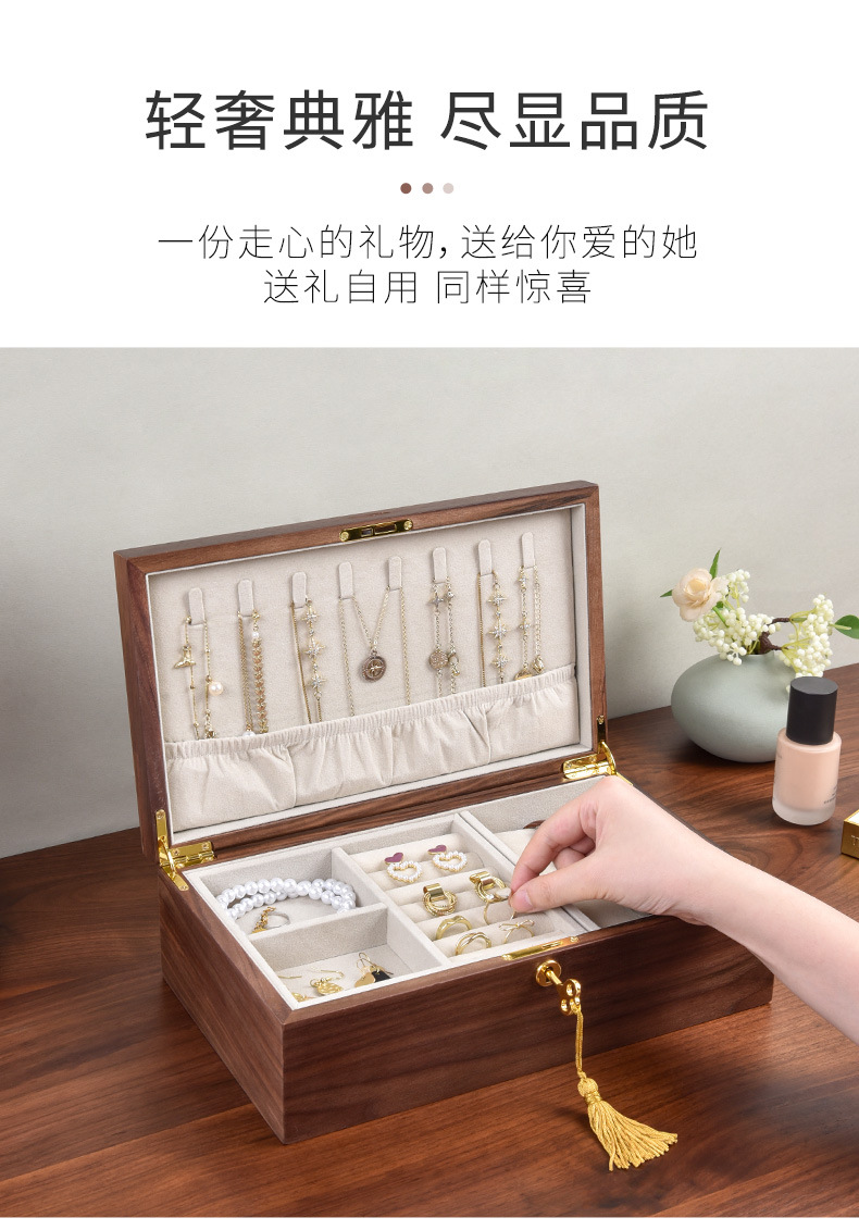胡桃木手工带锁首饰盒2024新款高级感轻奢三金饰品收纳盒双层木质