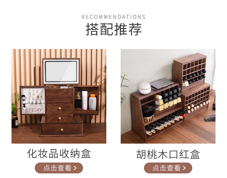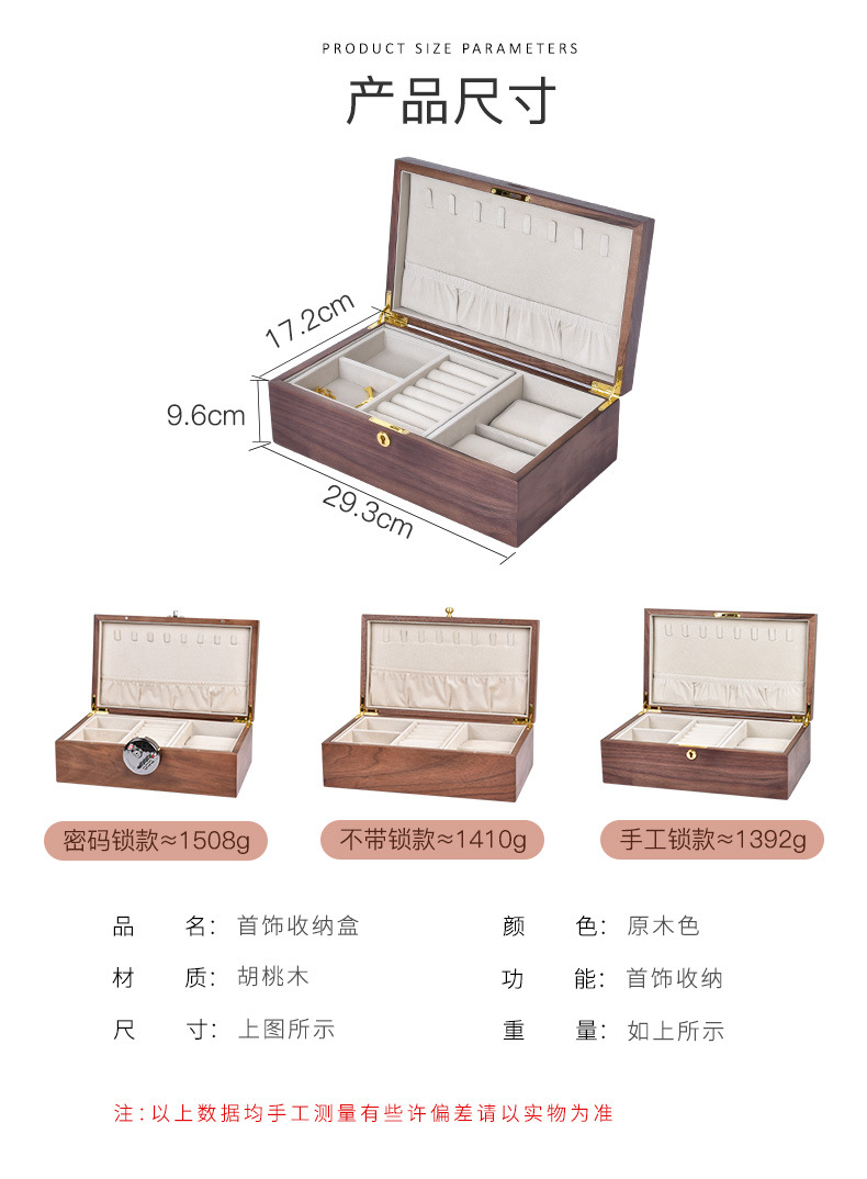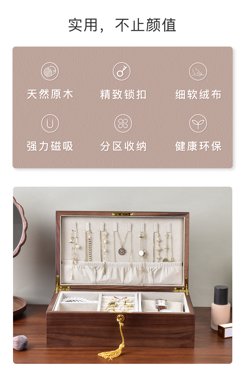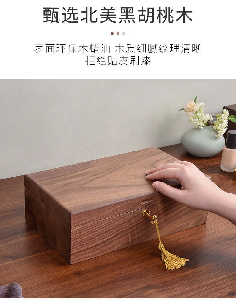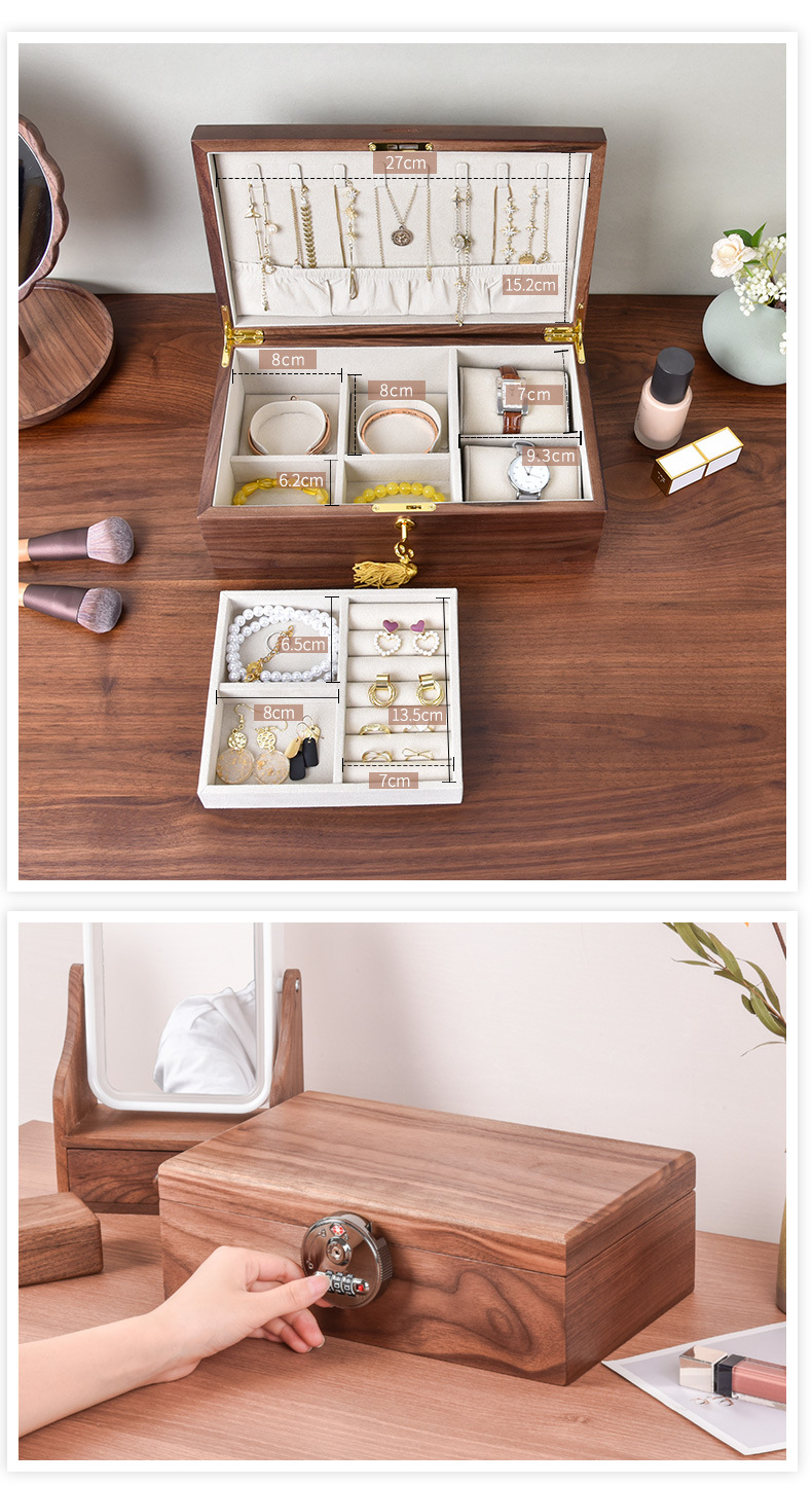 胡桃木手工带锁首饰盒2024新款高级感轻奢三金饰品收纳盒双层木质