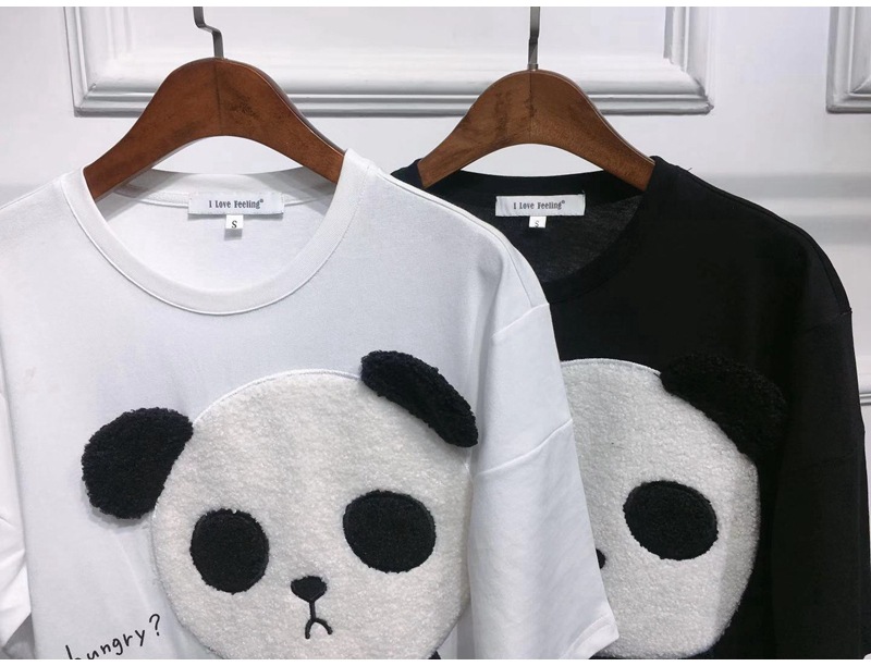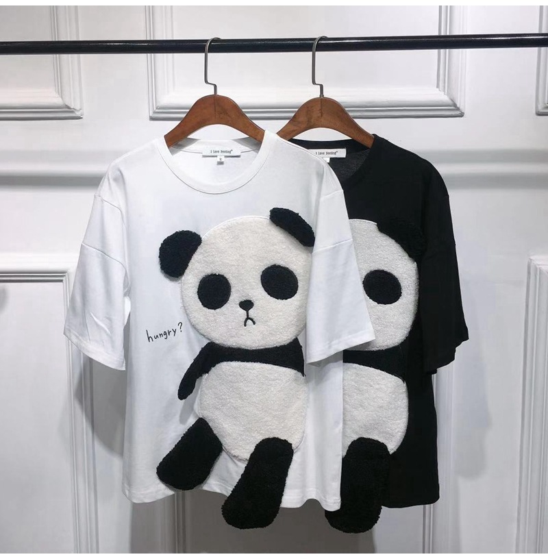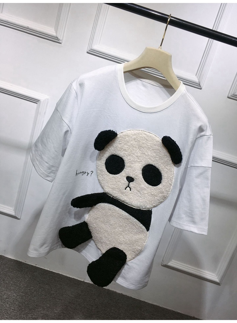 Kaos Bordir Panda Baru Musim Semi/Musim Panas 2025 untuk Wanita, Leher Bulat, Longgar, Gaya Kartun Cina Dekorasi 3D Kaos Lengan Pendek untuk Wanita