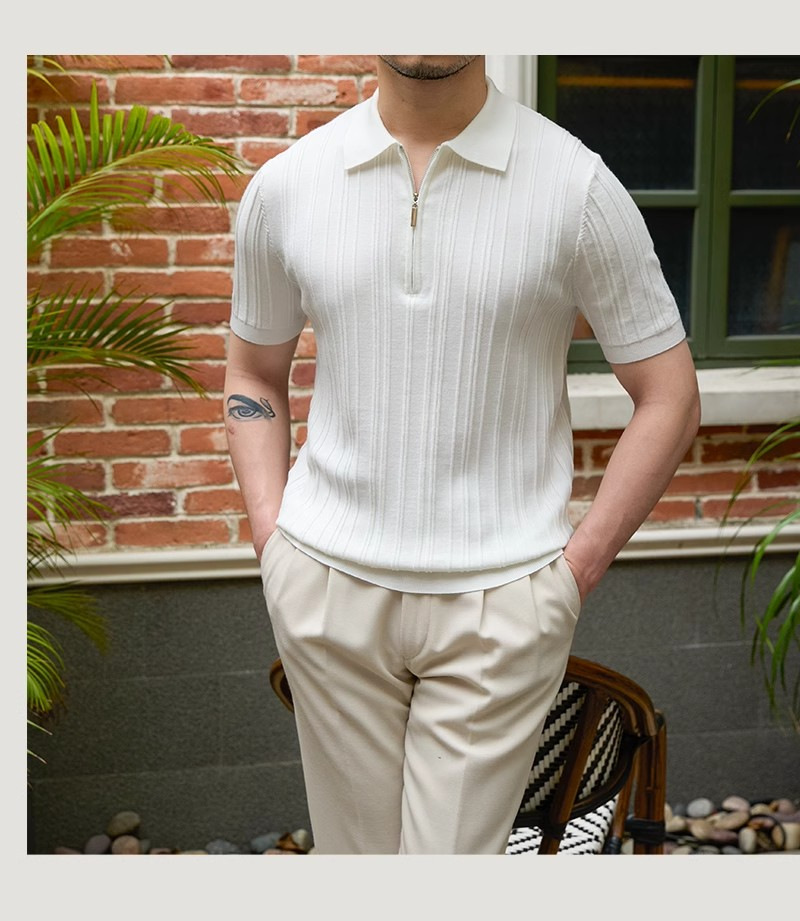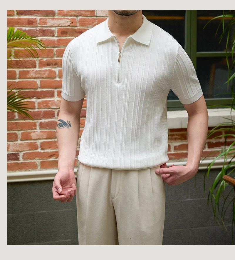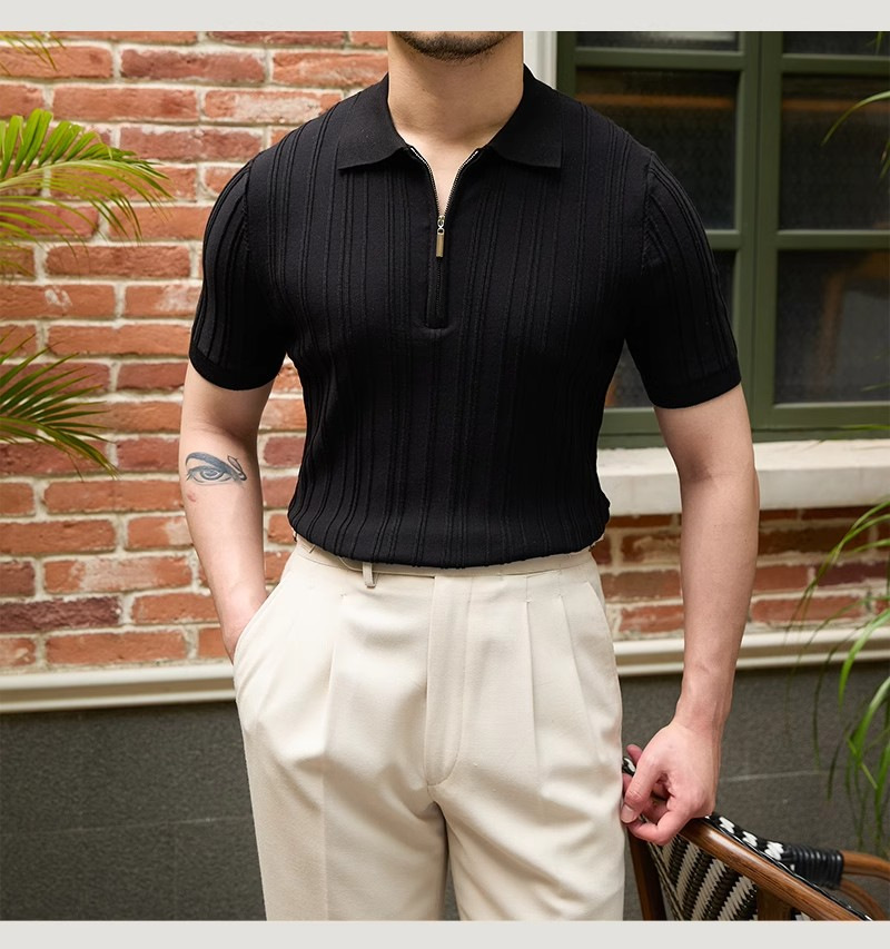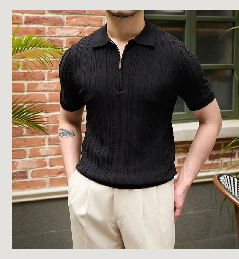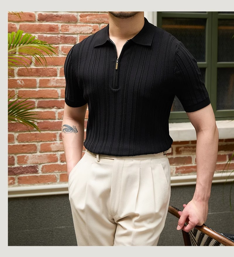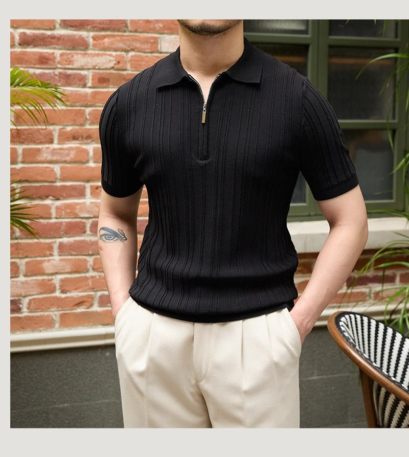 Kaos polo rajutan lengan pendek pria, kemeja Dalaman lengan setengah kerah sutra es warna polos slim-fit musim panas