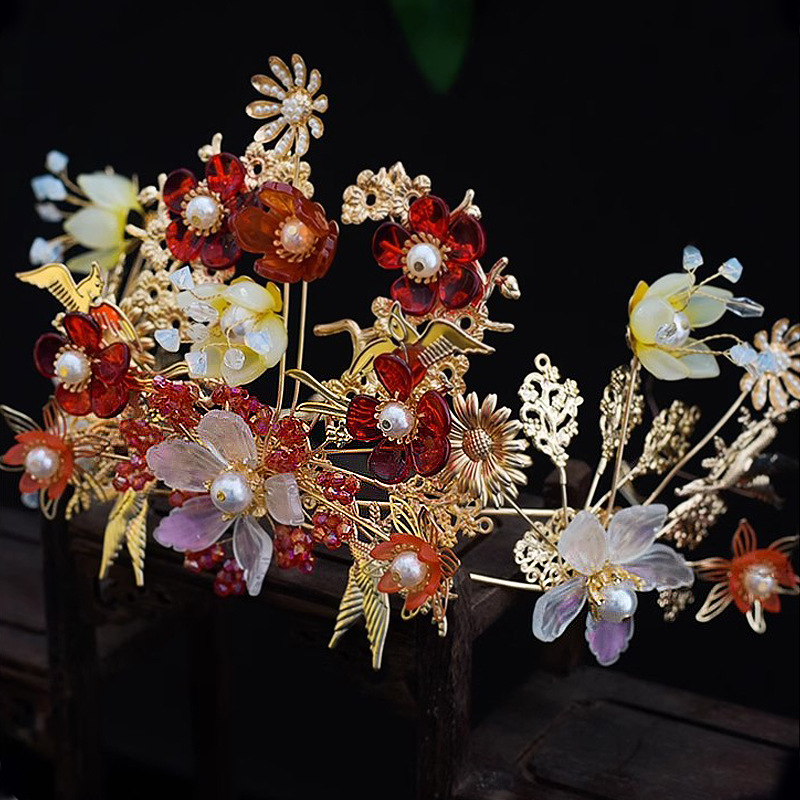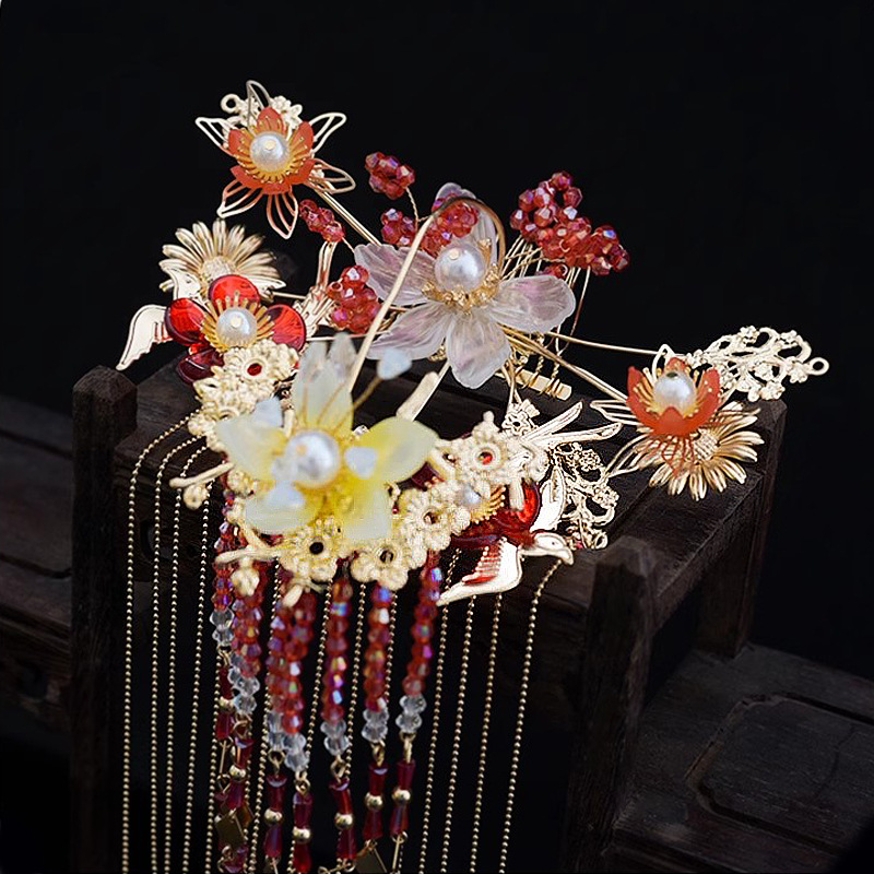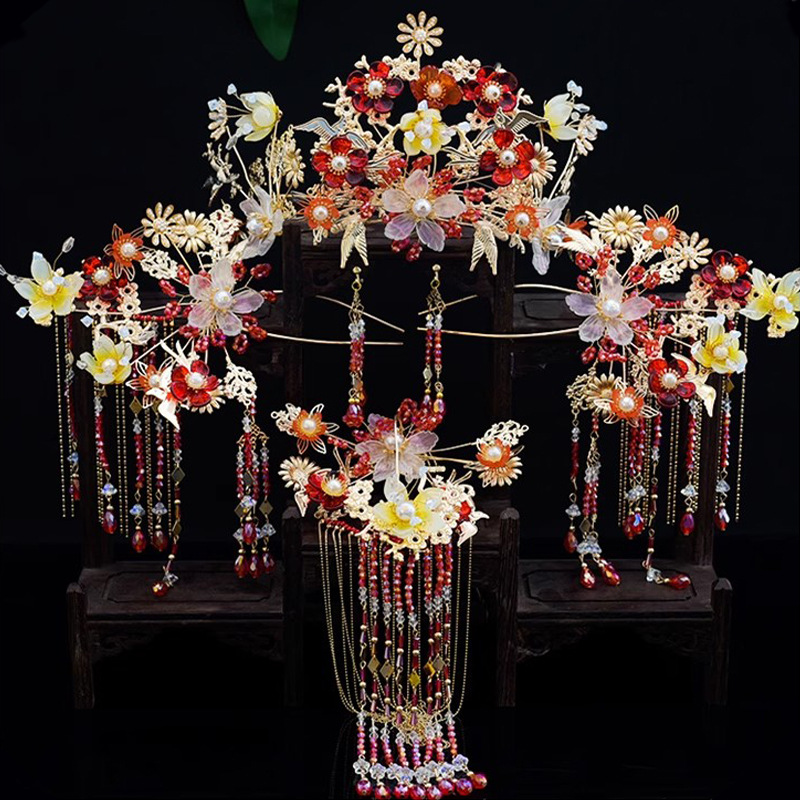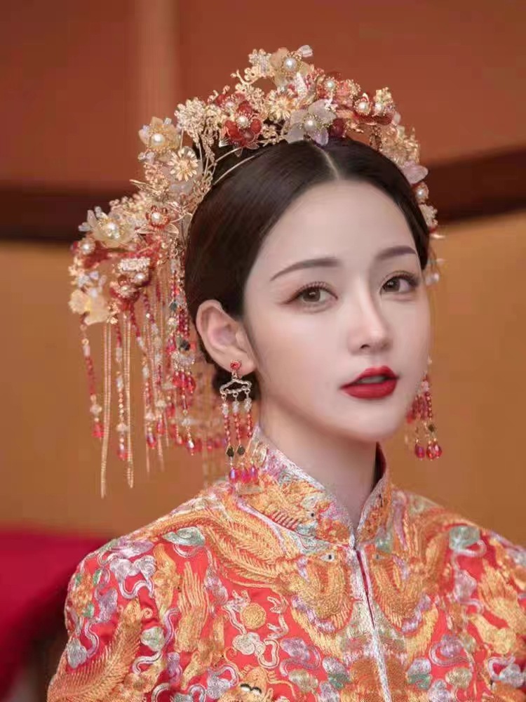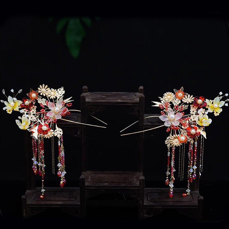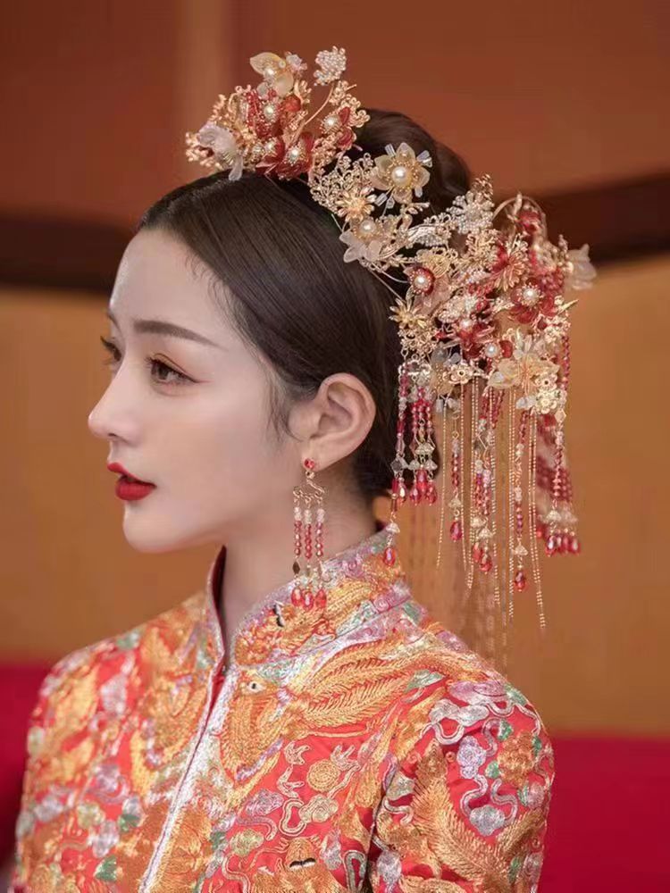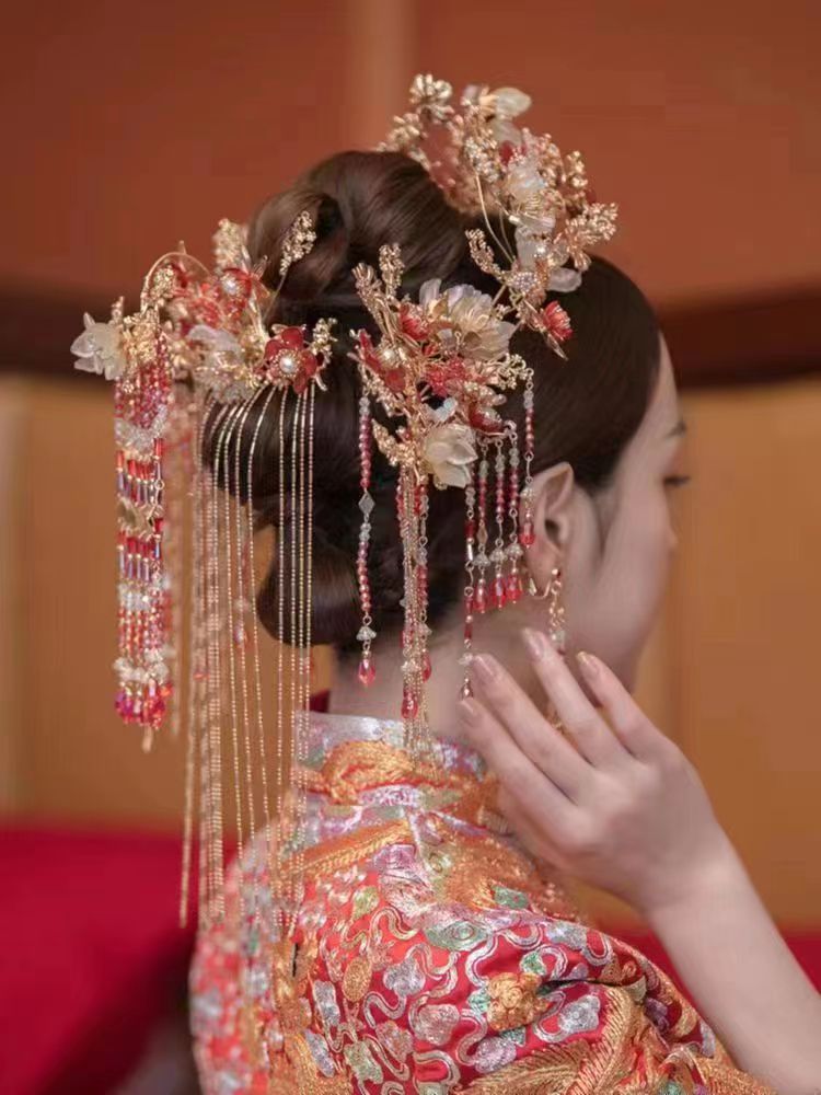 Hiasan kepala pengantin, Aksesori gaun pernikahan Xiuhe, hiasan kepala rumbai langkah jepit rambut setelan 2023