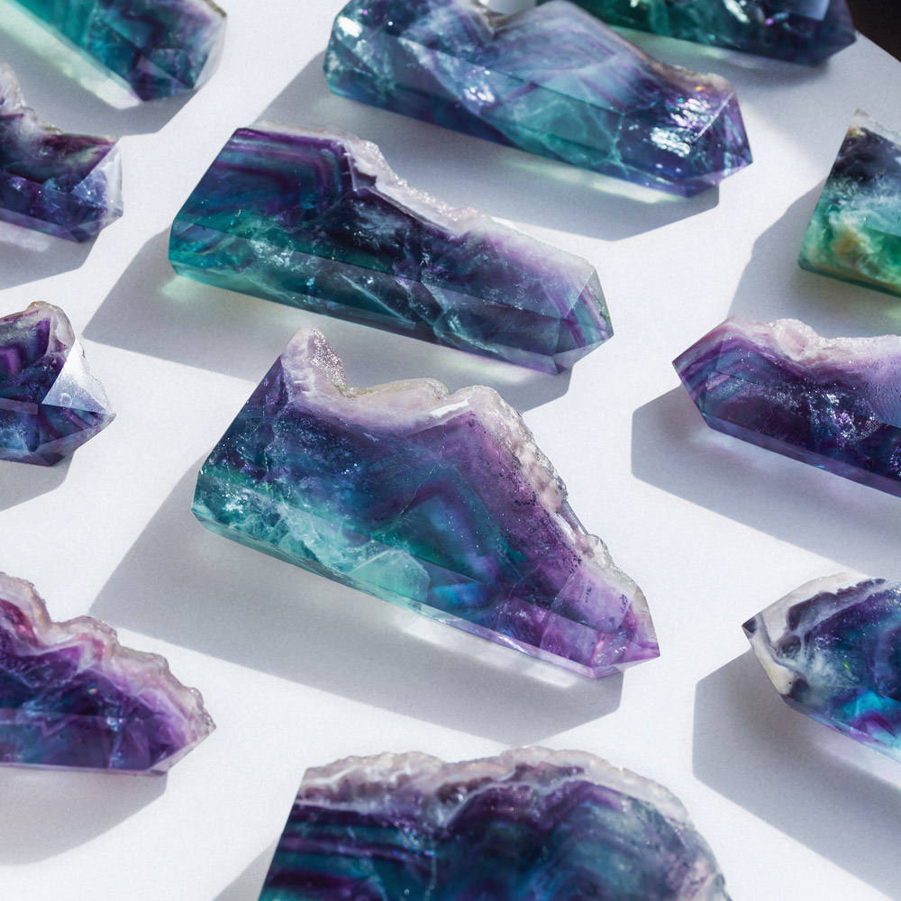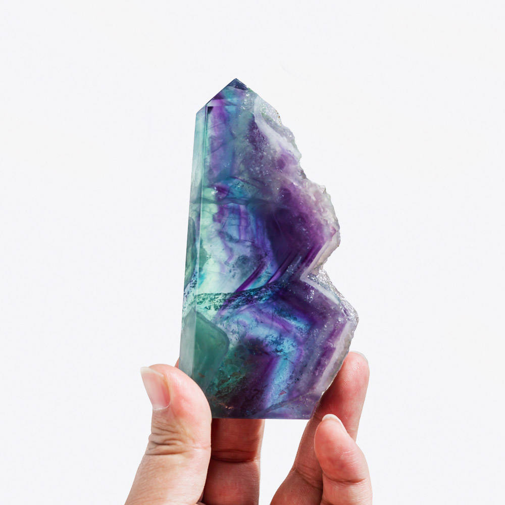 天然水晶七彩萤石单尖柱子水晶原石矿标打磨带皮萤石塔办公摆件