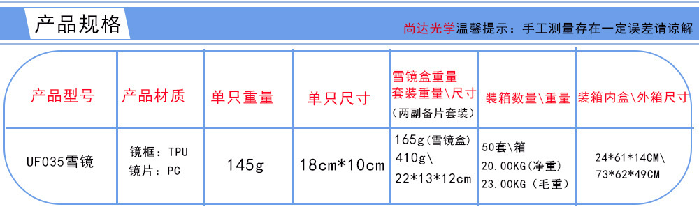 产品重量(套装:单眼镜+雪镜盒):145g+165g=310g