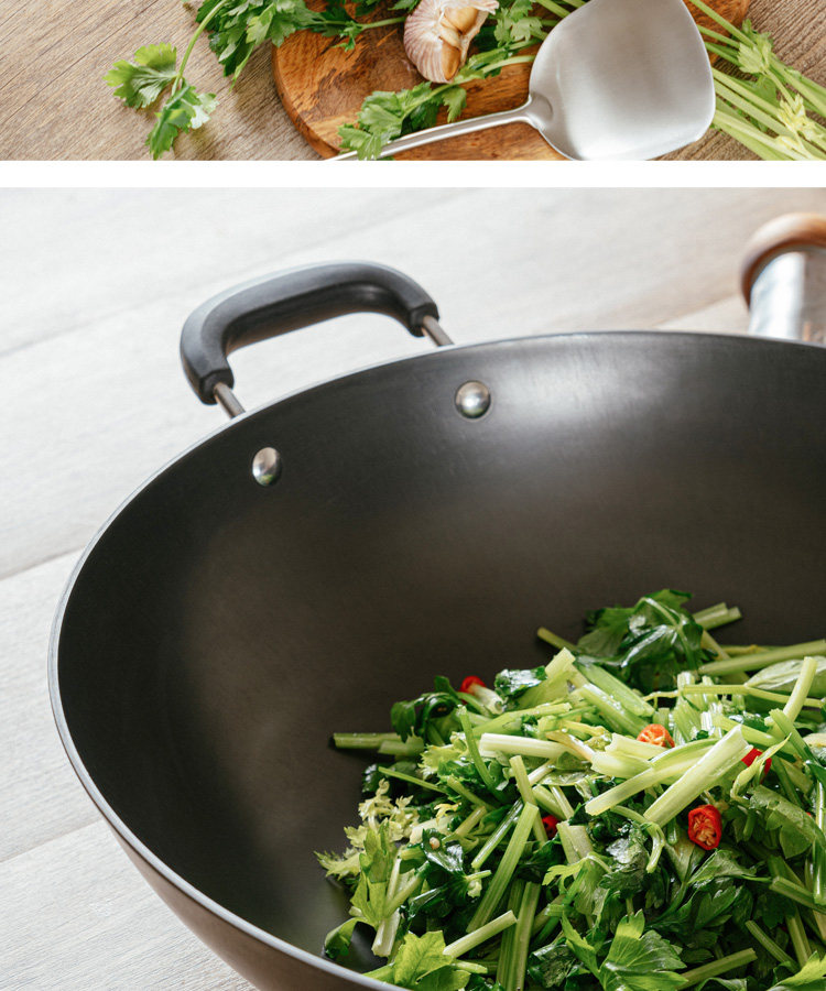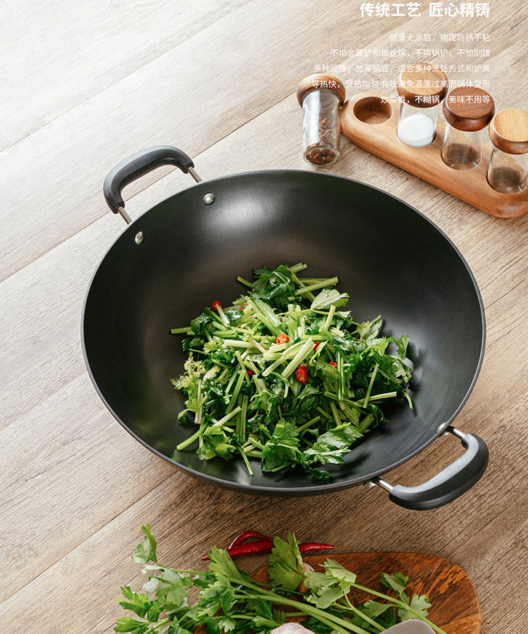 7L8K wajan besi cor wajan besar tidak dilapisi asli stainless steel, wajan bawah ganda, wajan bawah datar untuk rumah tangga, tidak lengket