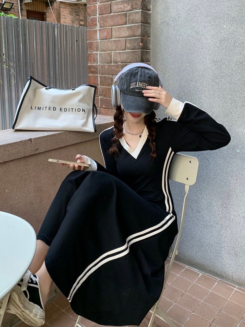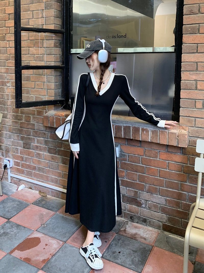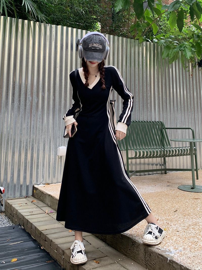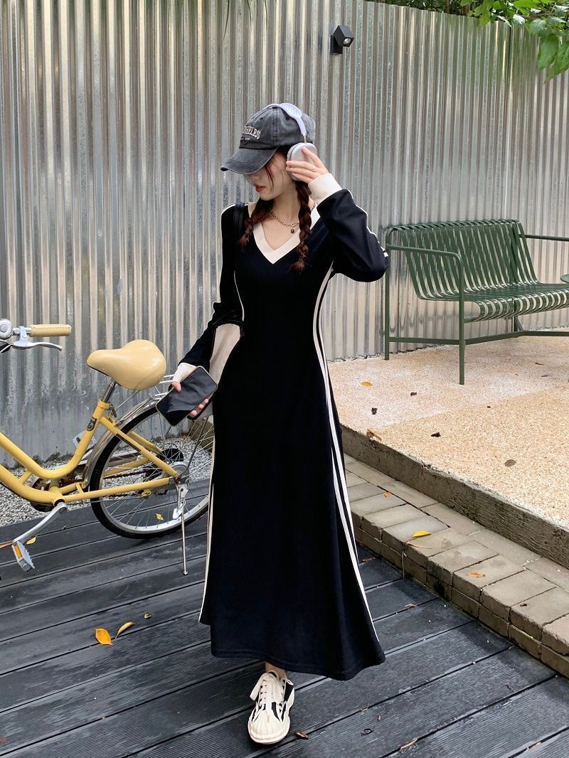 Baju pelangsing pinggang wanita, baju panjang lintas batas Musim Semi dan musim gugur warna hitam di atas lutut ukuran ekstra besar mm 200 kg leher-v
