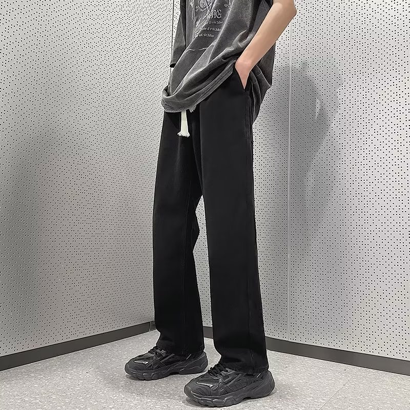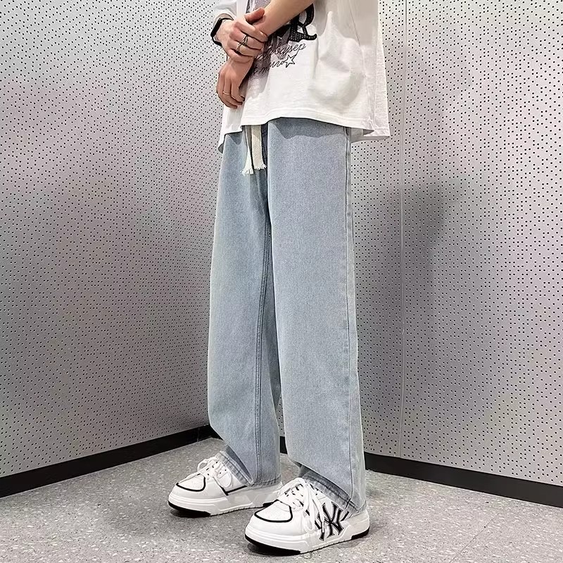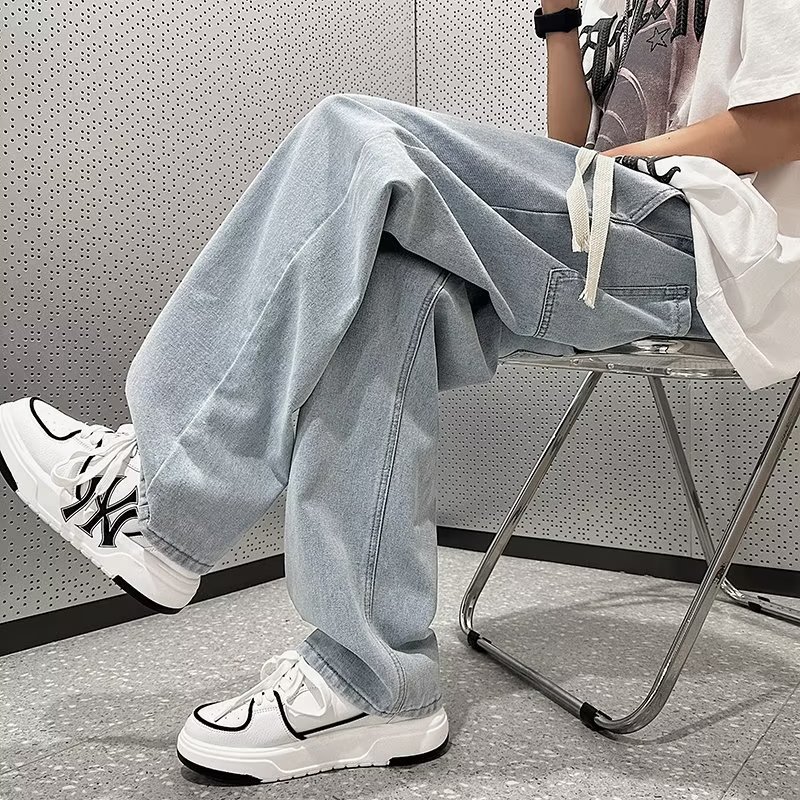 Celana jins pria, celana jins vintage gaya Amerika, celana ayah lurus longgar, celana kaki lebar kasual mode merek jalanan tinggi