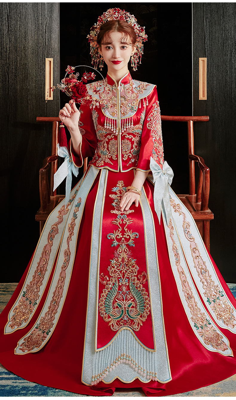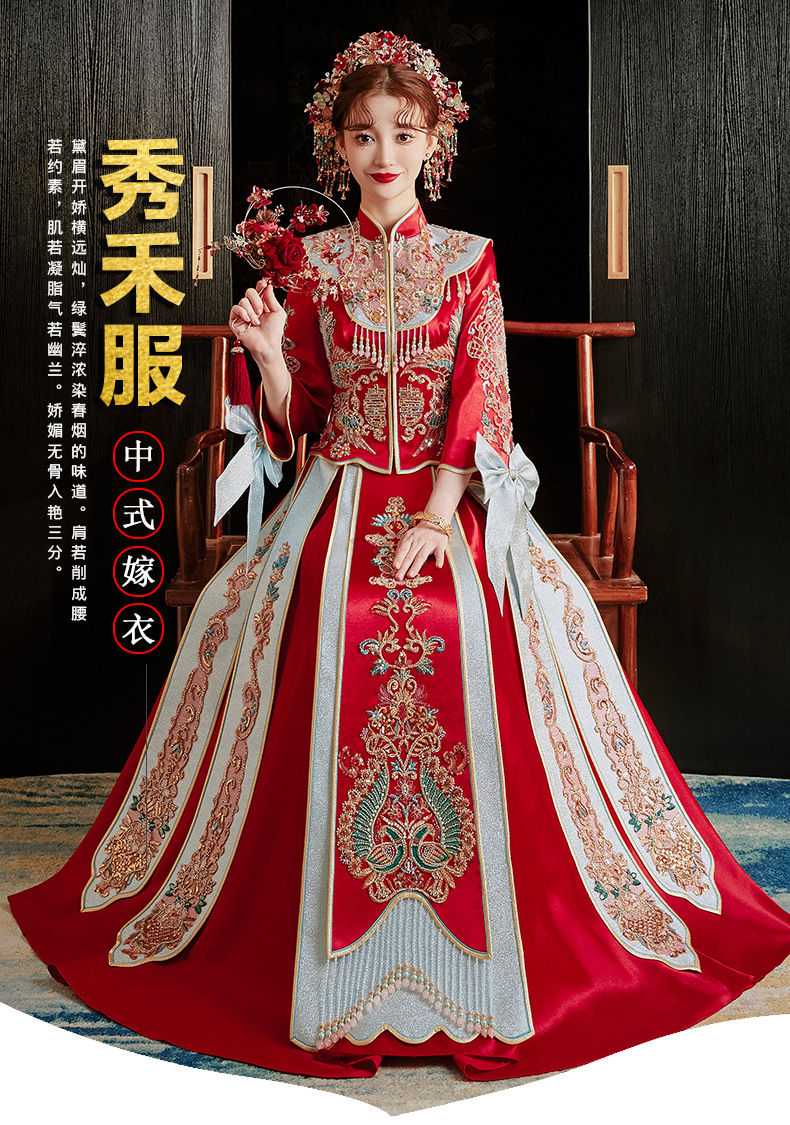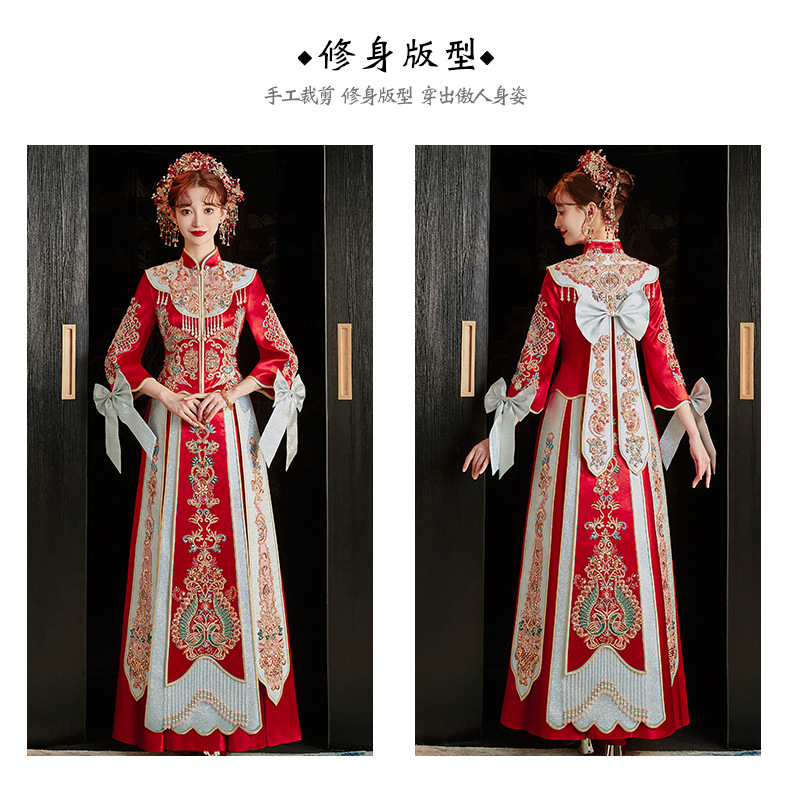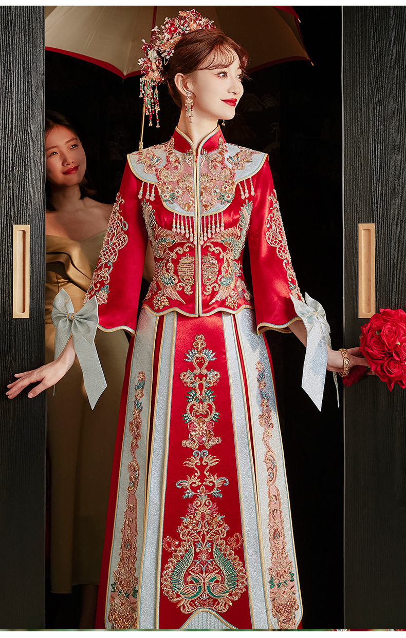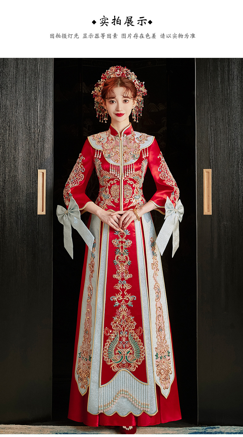Gaun Pengantin Gaya Cina Musim Semi/Panas 2025 Xiuhe Clothing, Gaun Pengantin Vintage Mewah dengan Detail Kerajinan Berat, Model Kimono Xiuhe Motif Naga dan Phoenix.