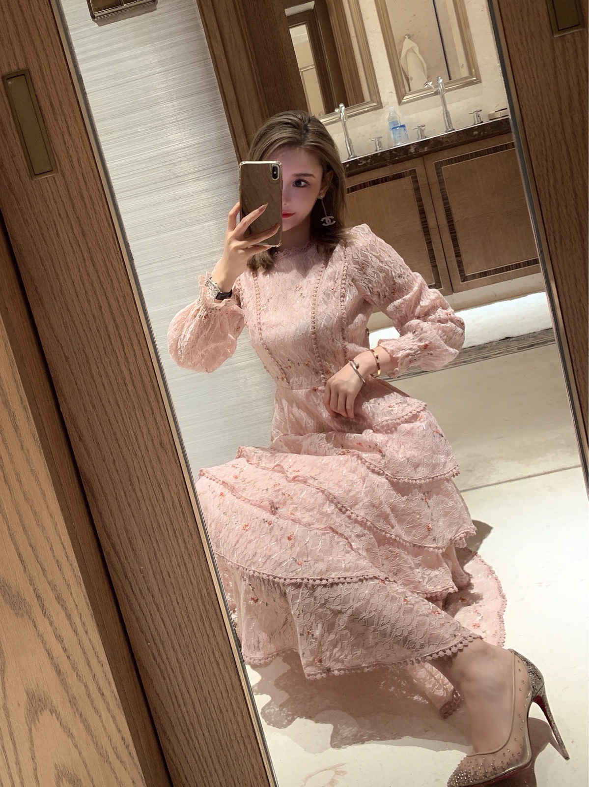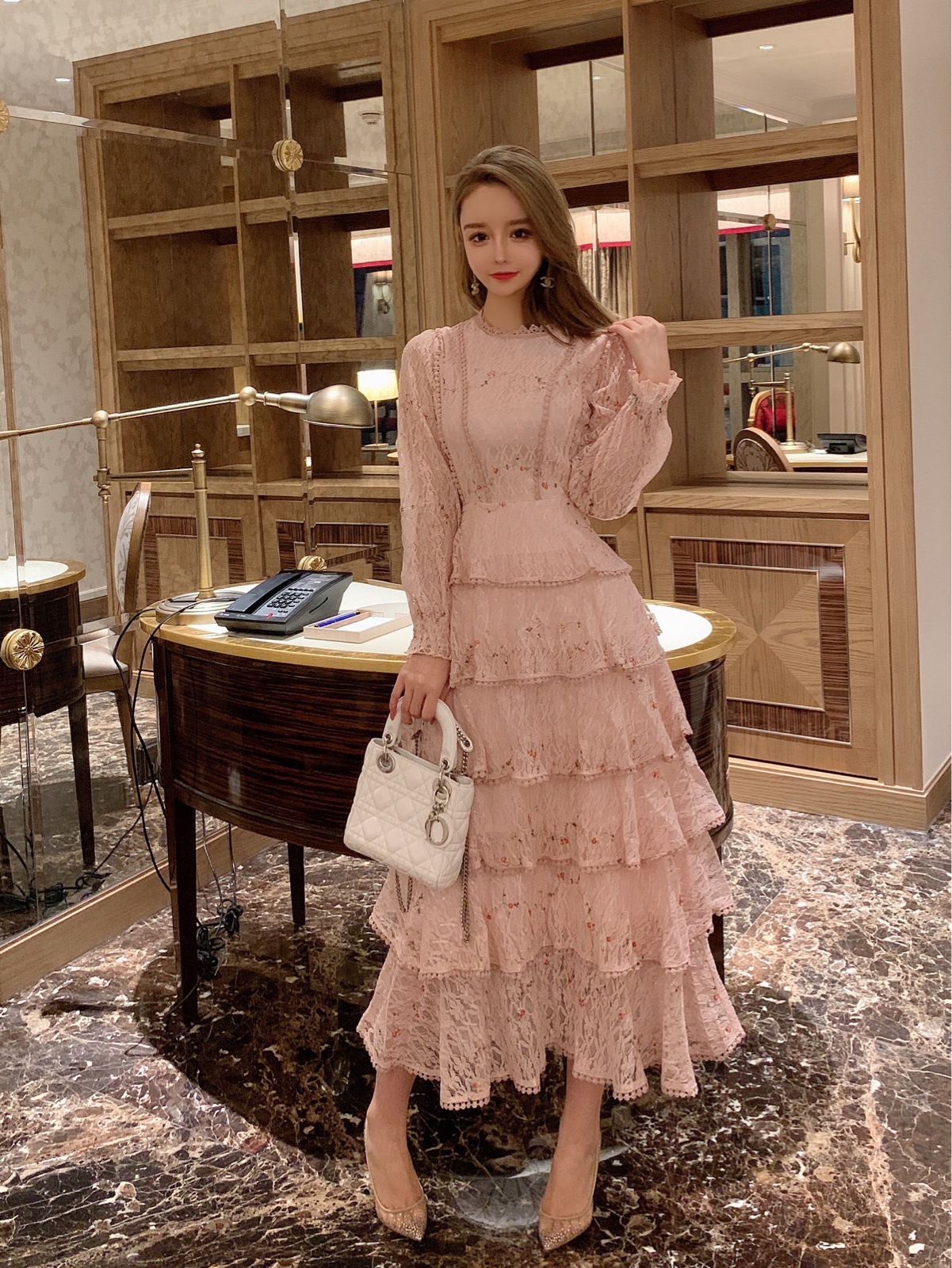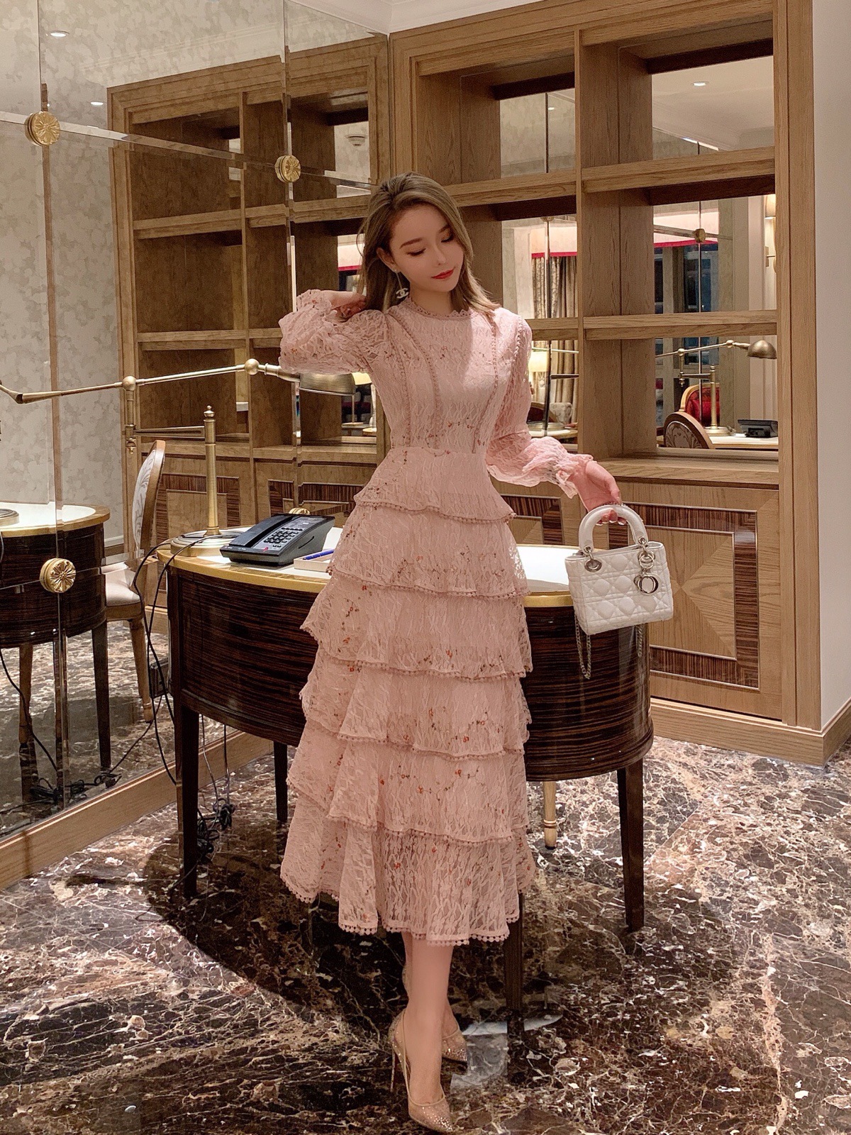 Gaun lapisan kue lengan panjang dengan bordir renda merah muda tahun 2025.