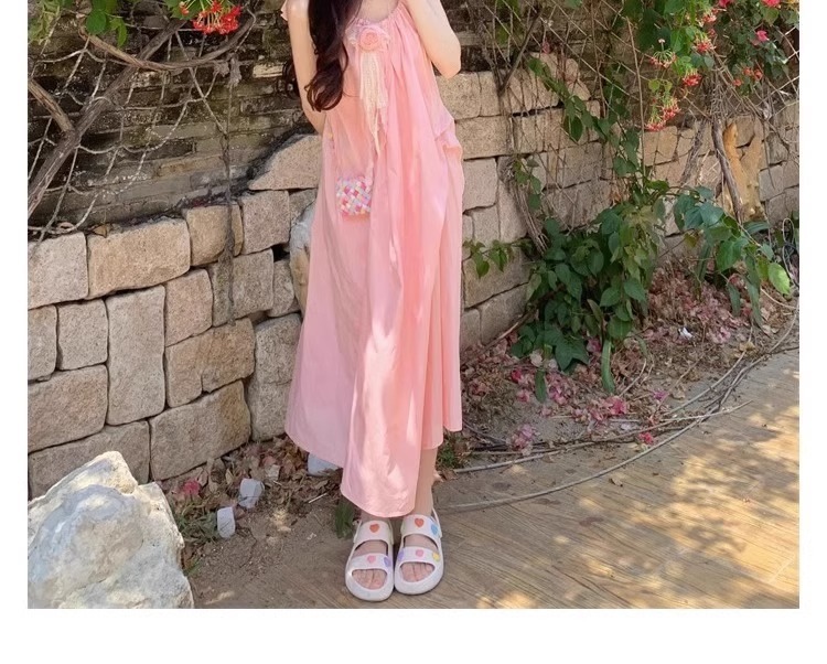 Gaun selempang merah muda gaya Prancis mambo, gaun pantai liburan pantai dopamin Sanya musim semi dan musim panas wanita