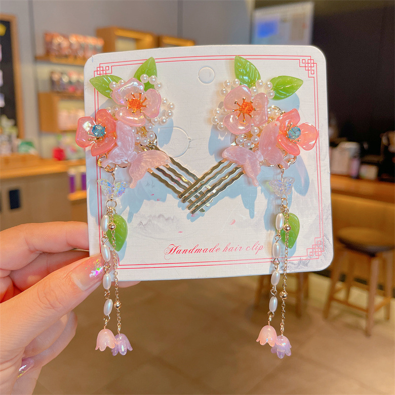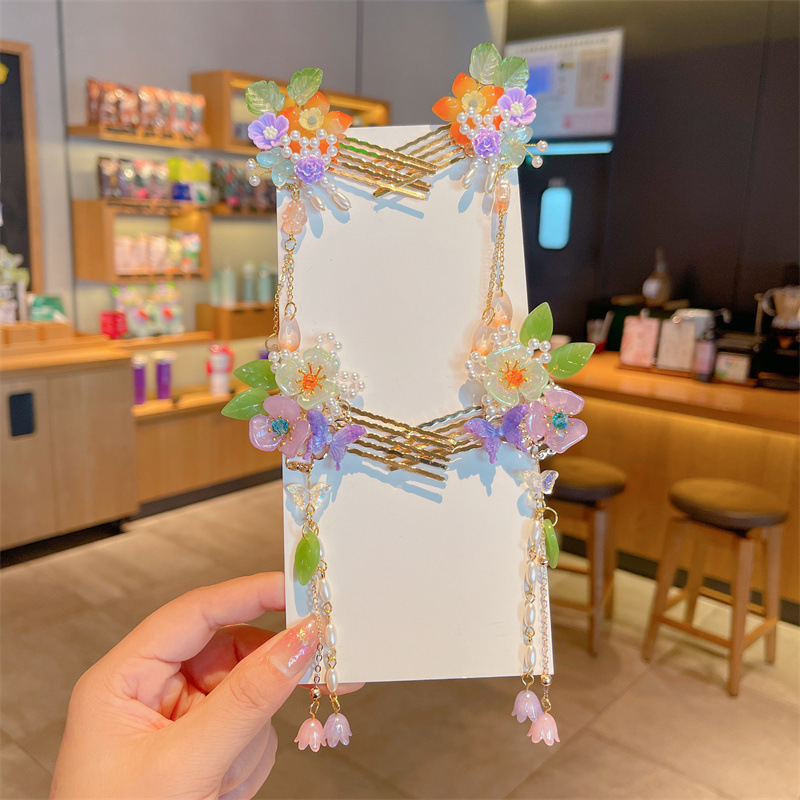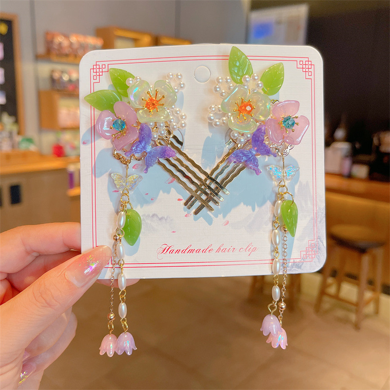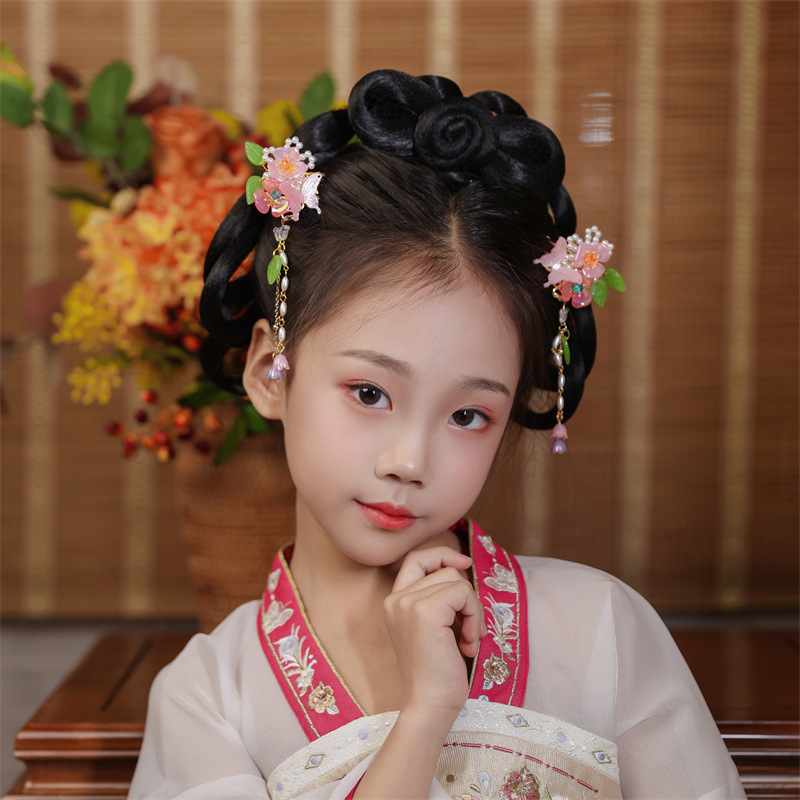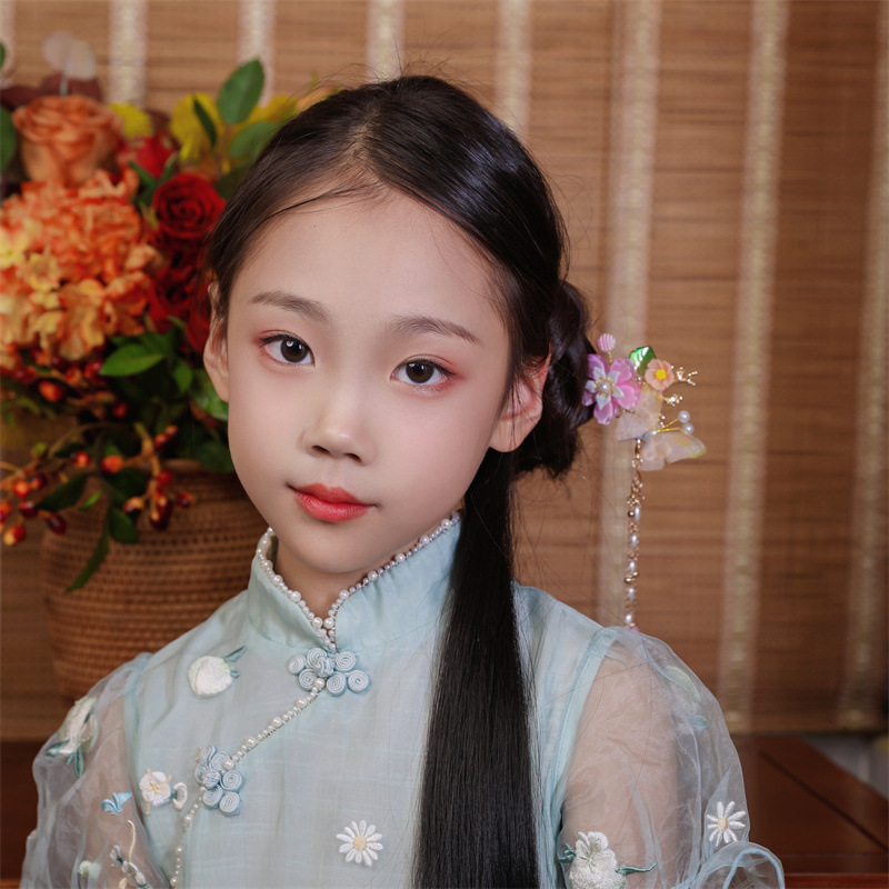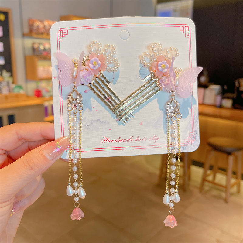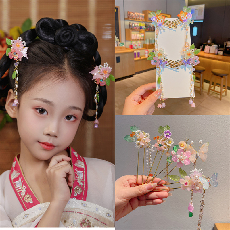 Hanfu jepit rambut model kuno anak perempuan, jepit rambut rakun, kostum kuno, aksesori rambut, rumbai langkah, kepala jepit rambut