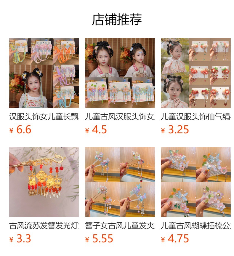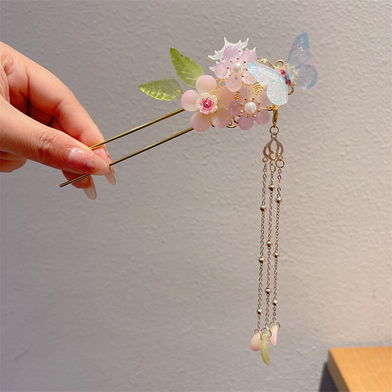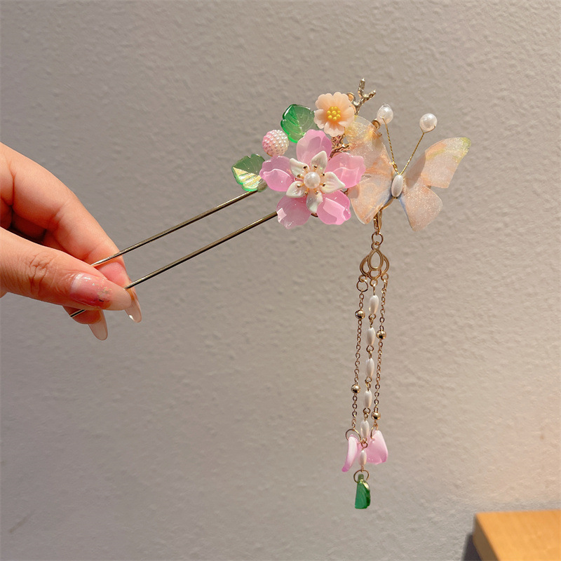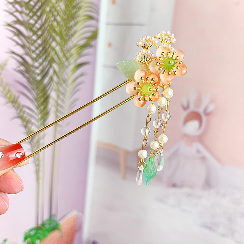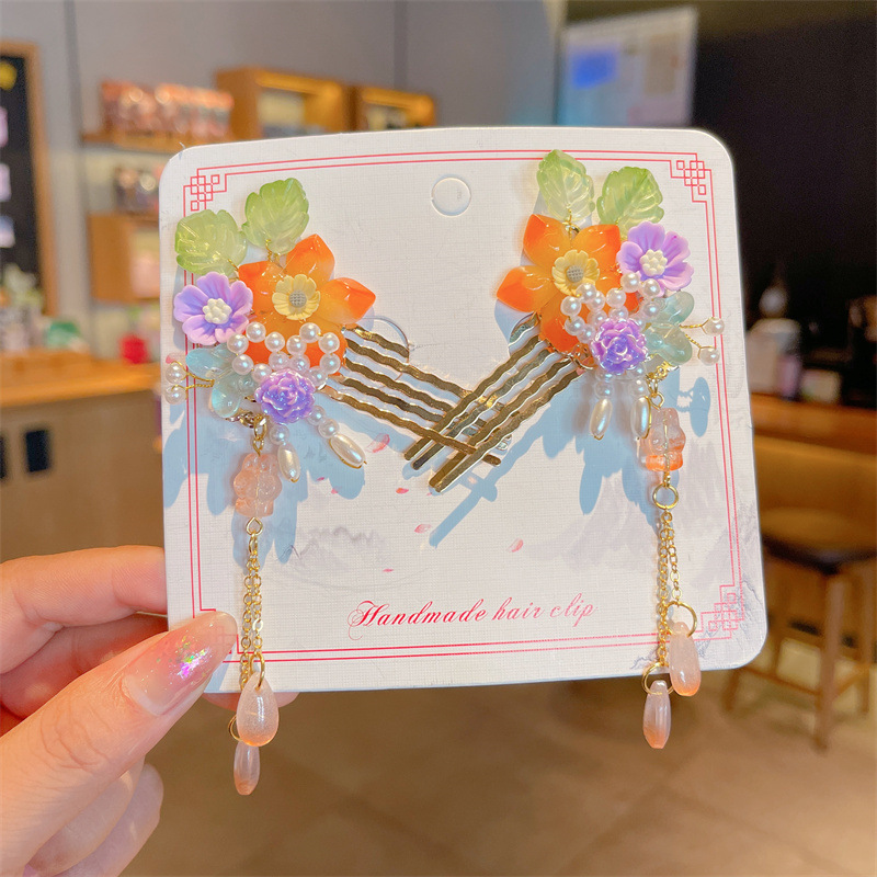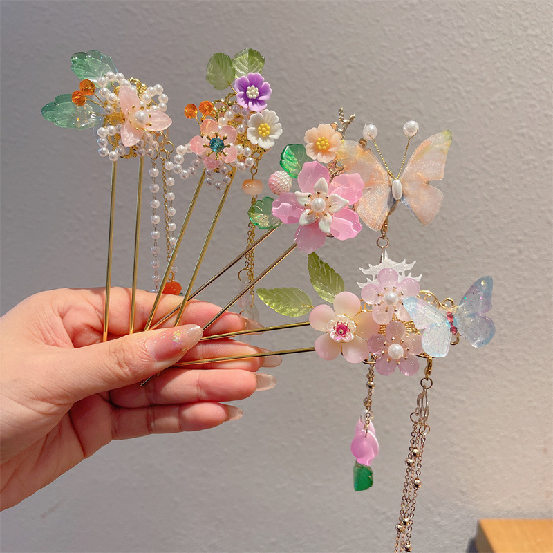 Hanfu jepit rambut model kuno anak perempuan, jepit rambut rakun, kostum kuno, aksesori rambut, rumbai langkah, kepala jepit rambut