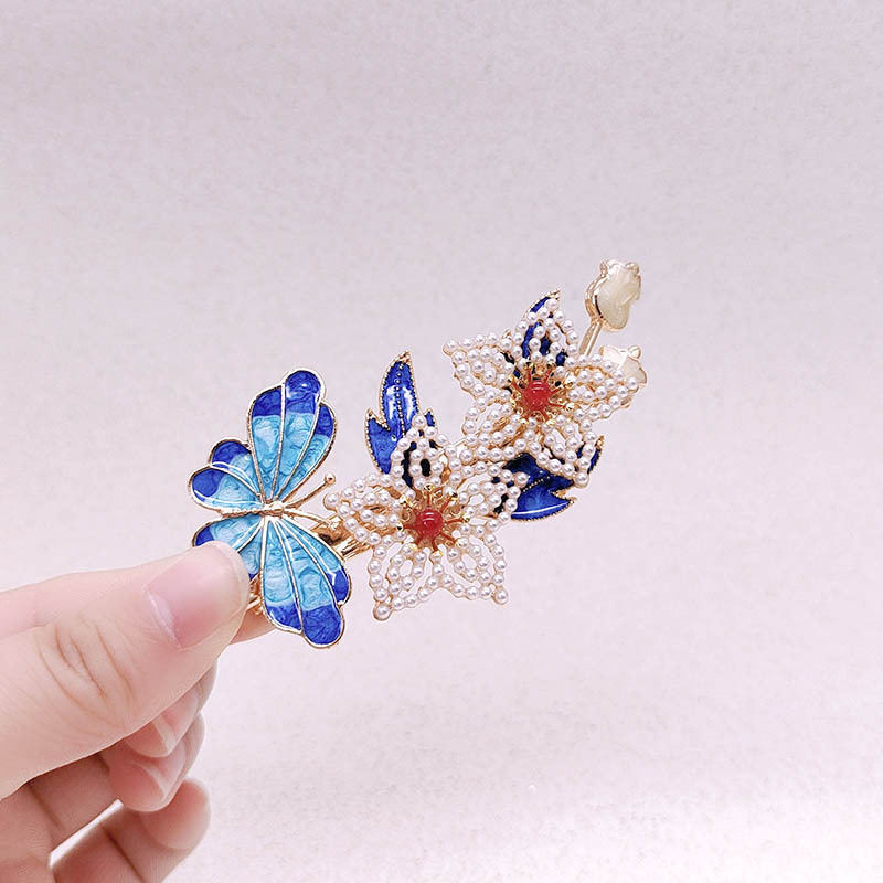 Jepit rambut mutiara kupu-kupu gaya Tiongkok aksesori rambut hiasan kepala klip samping hanfu aksesori rambut jepit rambut bebek