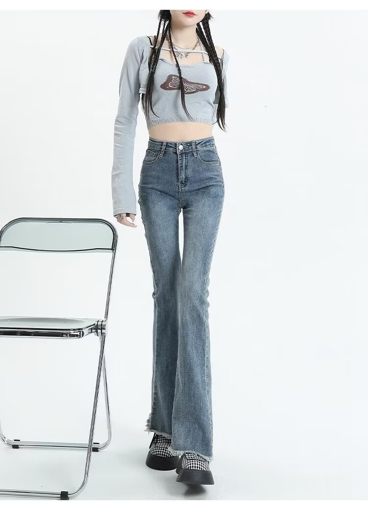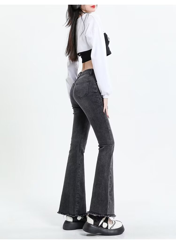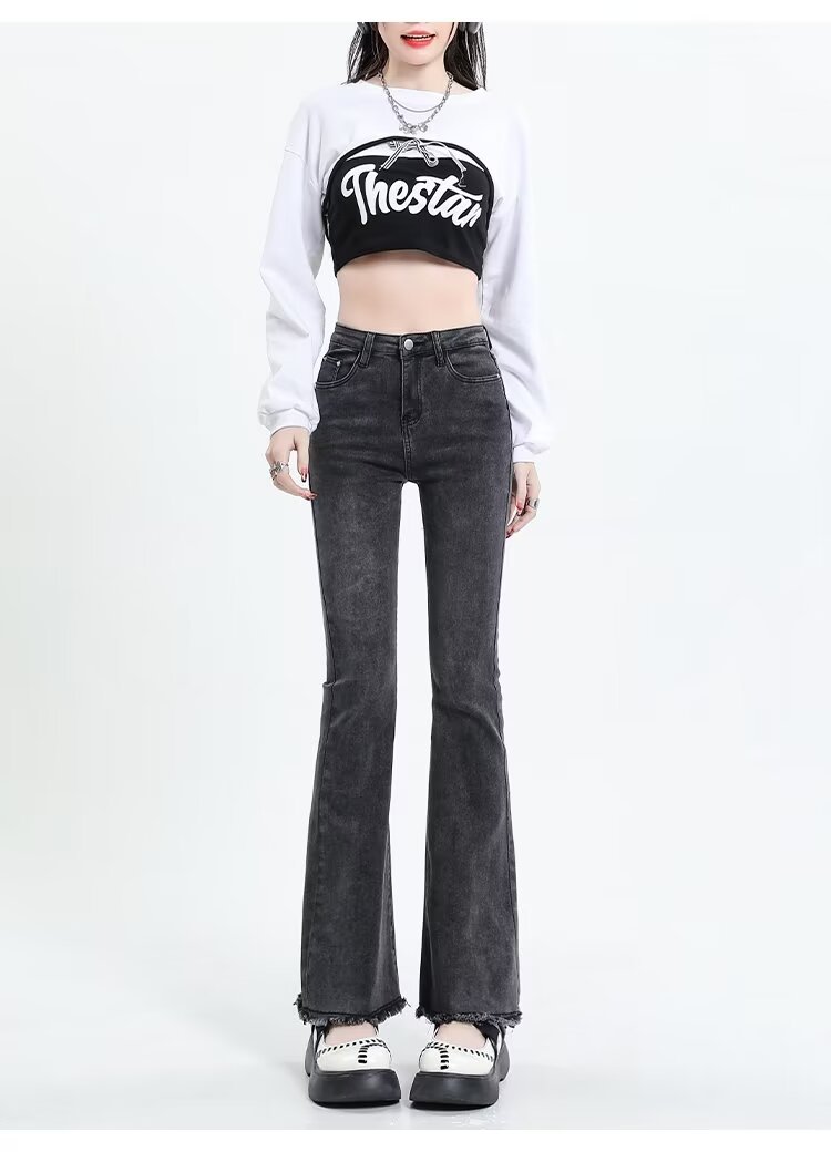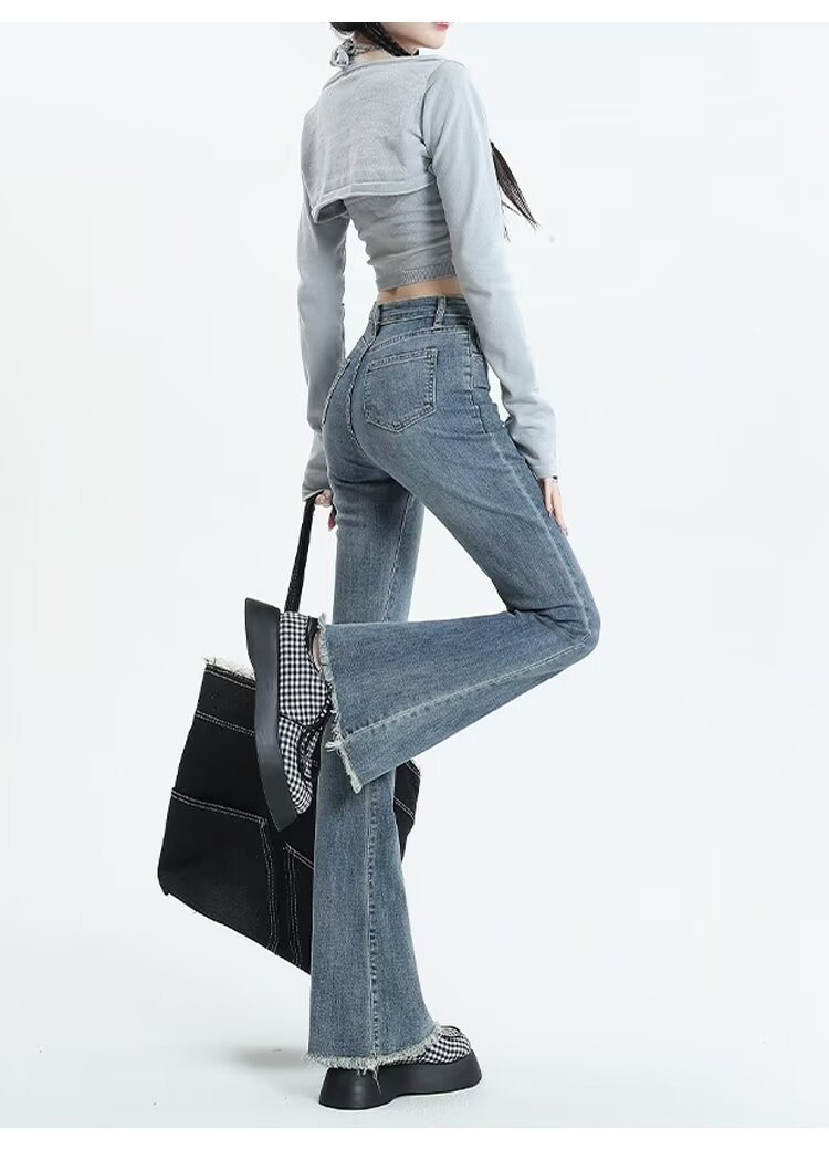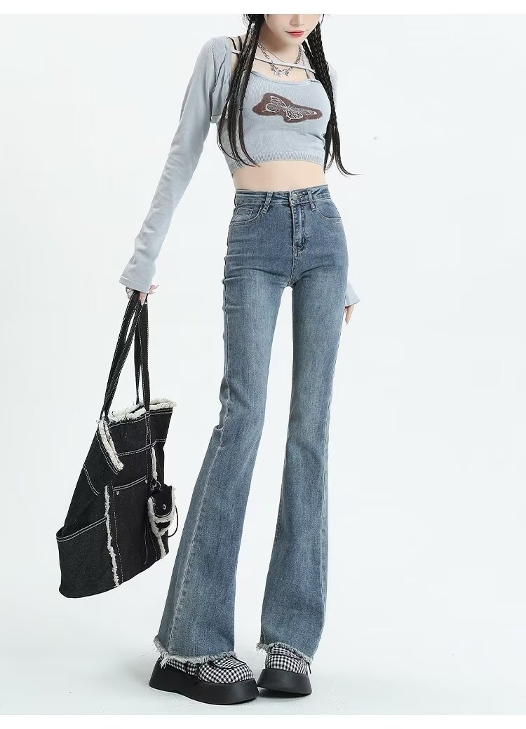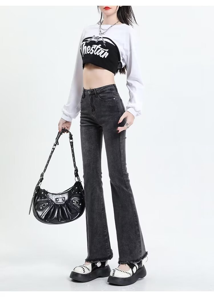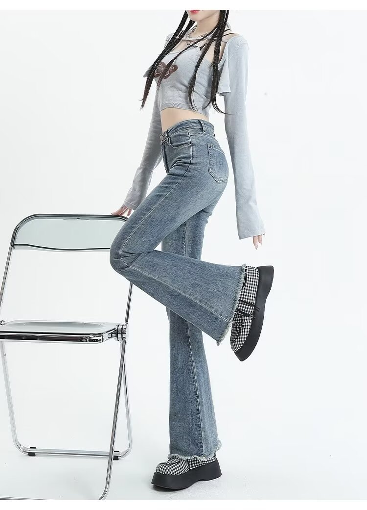 Celana Jin kurus tepi berjumbai desain baru musim semi 2024 CELANA Sepatu kuda tanduk mikro semua cocok ukuran besar pelangsing pinggang tinggi
